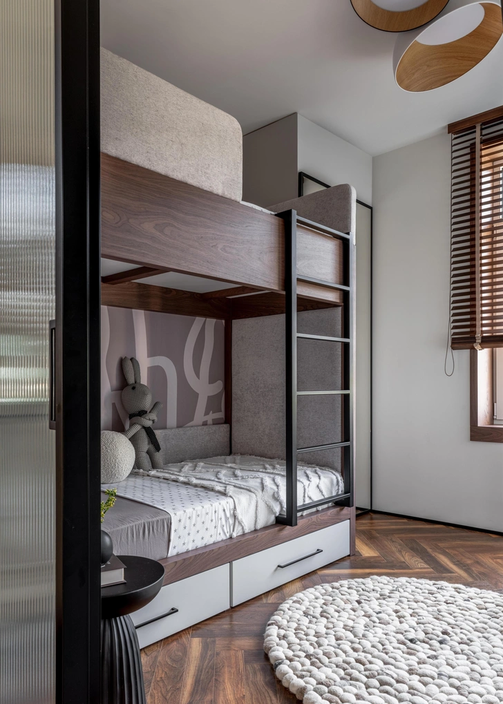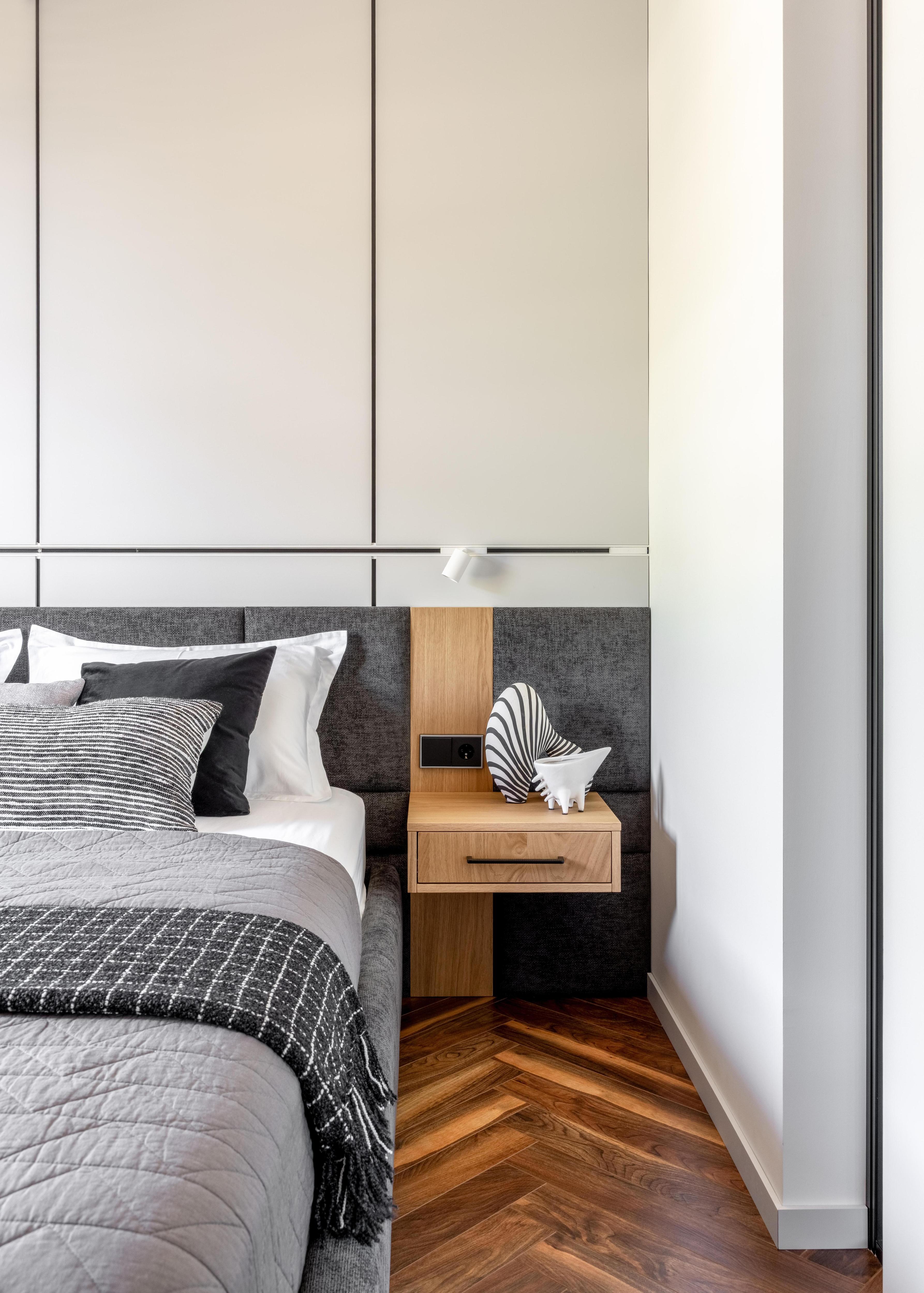 Между детской и мастер-спальней стена диагональная: это помогло сохранить в каждой комнате полноценные окна. В острый угол детской мы вписали небольшой письменный шпонированный стол, и тем самым визуально «выпрямили» стену. Родительская спальня, хоть и тоже небольшая, выглядит свободно — все благодаря окнам в пол и балкону с прекрасным видом на пышный зеленый пейзаж.