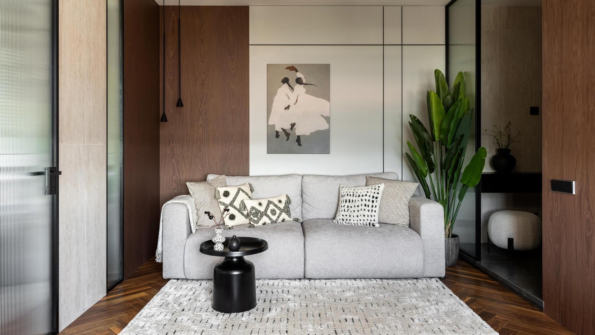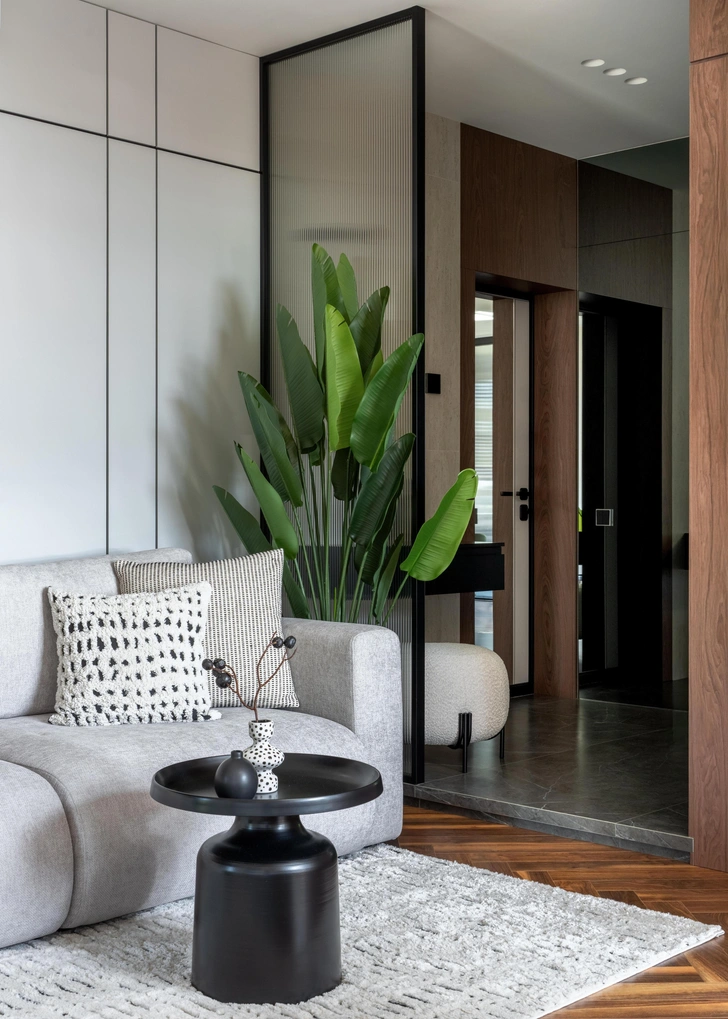 В гостиной маленькое окно, и чтобы в ней было больше света, я решила установить двери и перегородки из рифленого стекла, их же можно заметить и в прихожей. Они сохраняют приватность и в то же время пропускают больше солнца, создают чувство легкости и простора. Это настроение поддерживает и гамма природных оттенков — белый, теплый серый и шпон ореха. Заказчики просили, чтобы материалы были легкими в уходе, поэтому кроме шпона я использовала крашенные панели и керамогранит в гостиной и прихожей. Связующим звеном между контрастными текстурами стали черные металлические профили, они задают ритм.