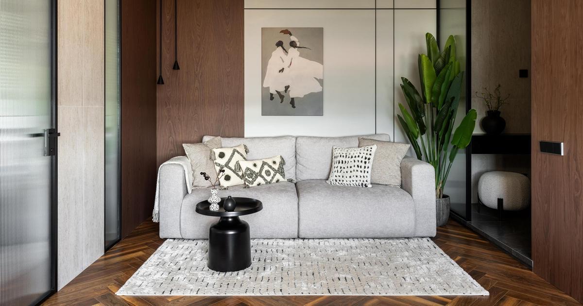 Кофейные столики, пуф в прихожей и декор, Gilini Home. Гипсовые встроенные светильники, Artpole. Керамогранит на полу, Italon. Краска, Flugger. Ковер, Kover.ru.