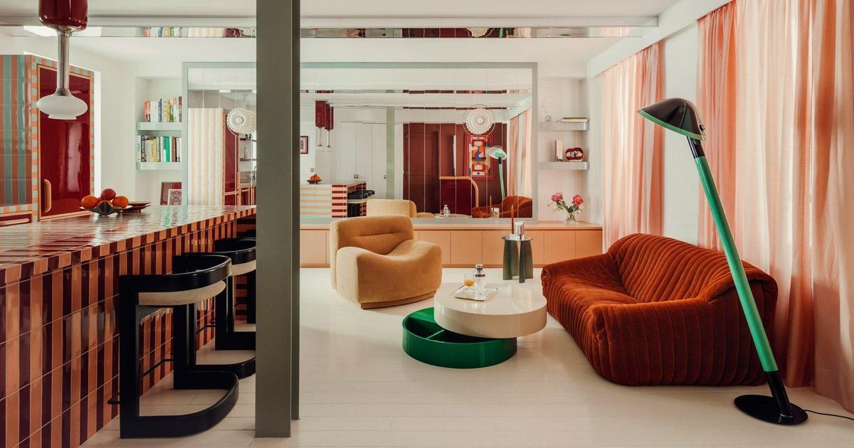 Кухня-гостиная — самая яркая зона: здесь преобладают красно-розовые оттенки. Кухня полностью облицована плиткой разных оттенков — ей обрамлен даже холодильник! Плавные «дутые» формы отсылают к эстетике 1960-х. «Мы подошли к цвету как к структурному элементу, а не как к украшению: каждый оттенок был выбран за его способность создавать ритм и гармонию в пространстве», — объясняют дизайнеры Atelier HA.
