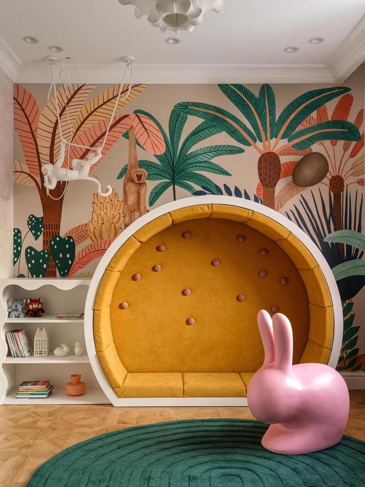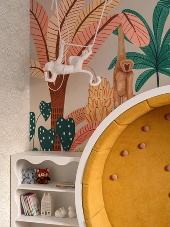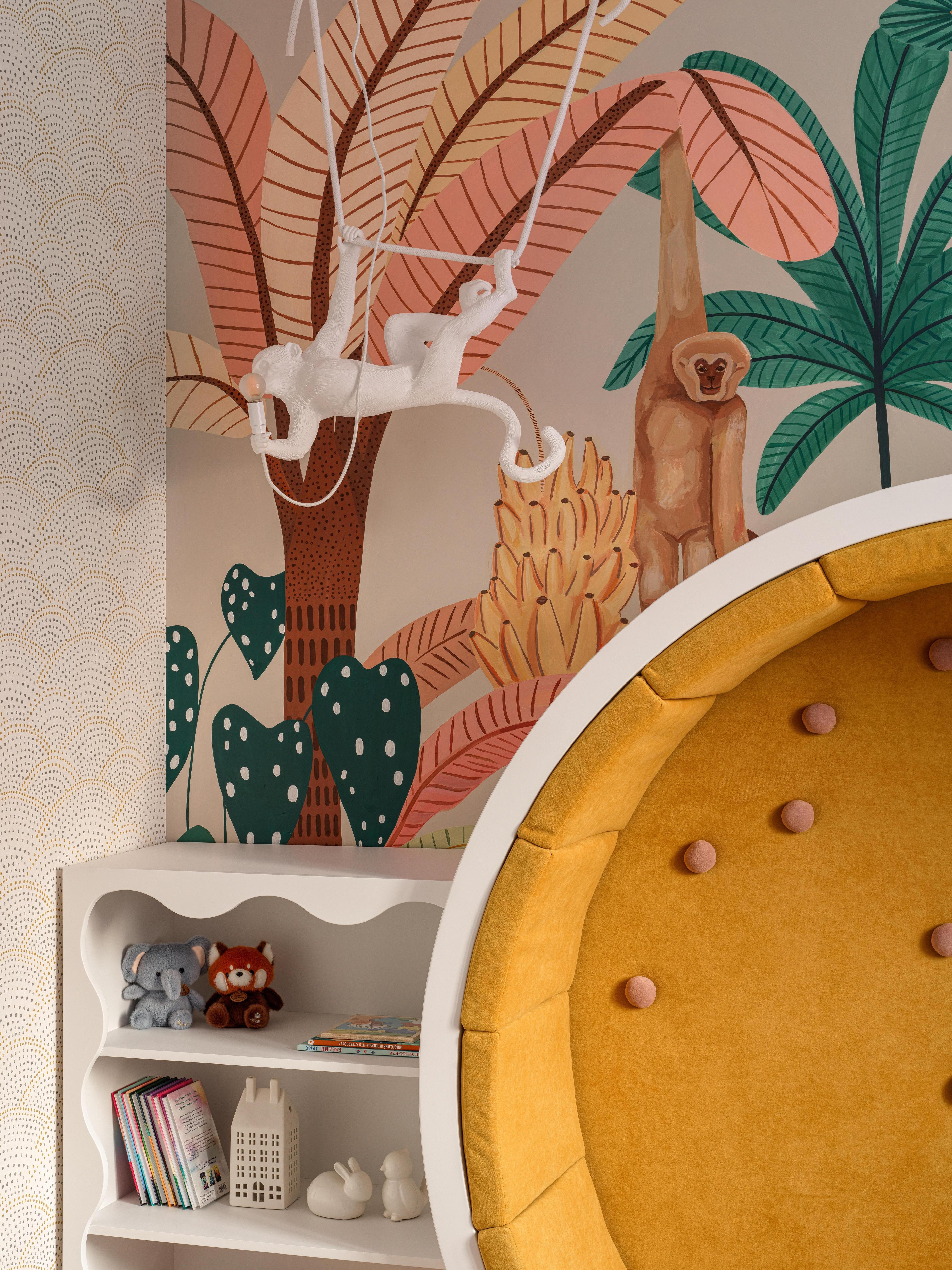 Получились фантазийные джунгли: с мартышками (как нарисованными, так и объемными в виде светильников), необычной люстрой в форме улья диковинных насекомых, с ковром-лужайкой, по которому прыгает сказочный розовый заяц. Мне как будто удалось услышать своего внутреннего ребенка, спросить его, каково было бы расти в такой комнате, интересно было бы здесь играть, мечтать?