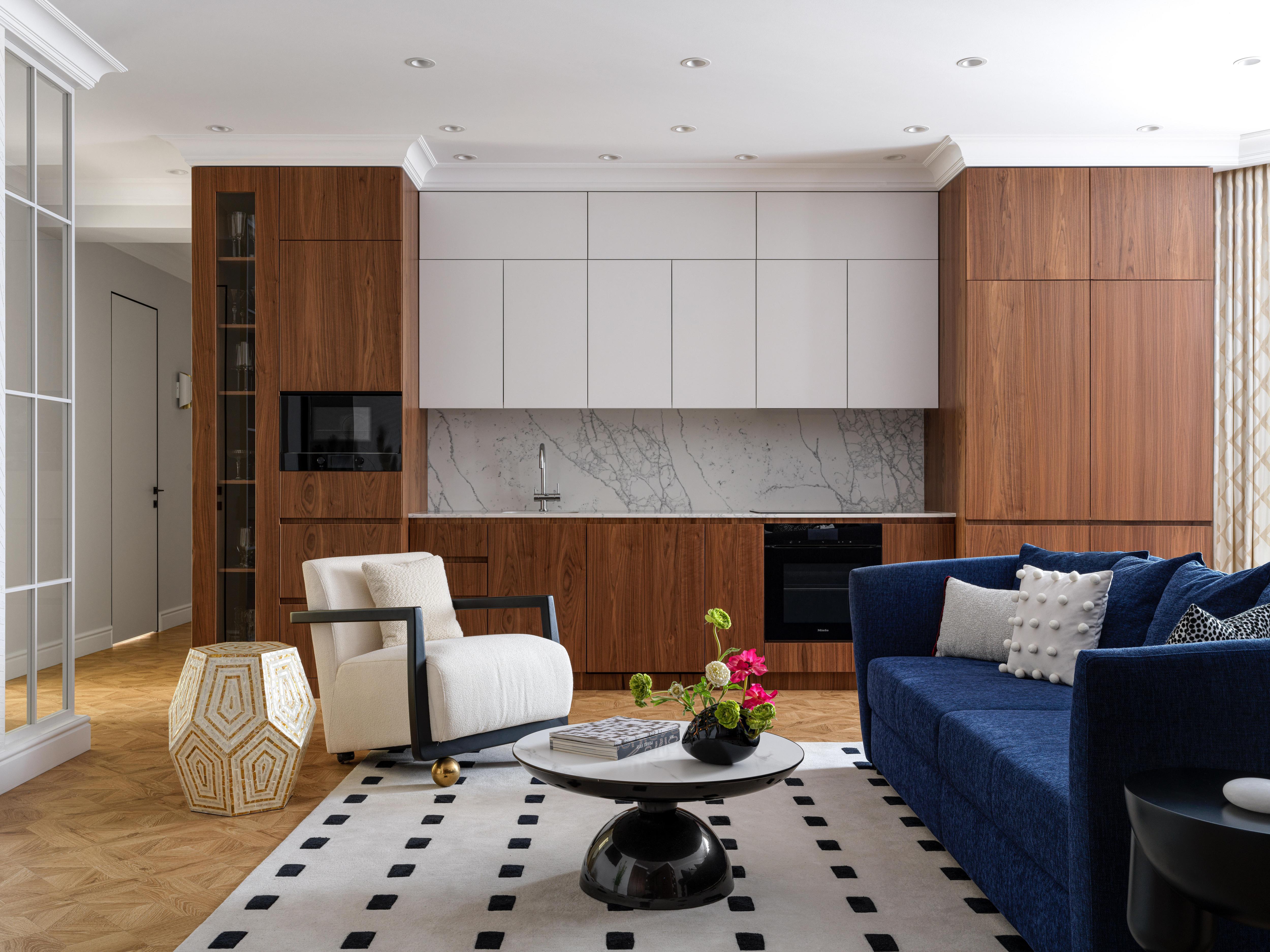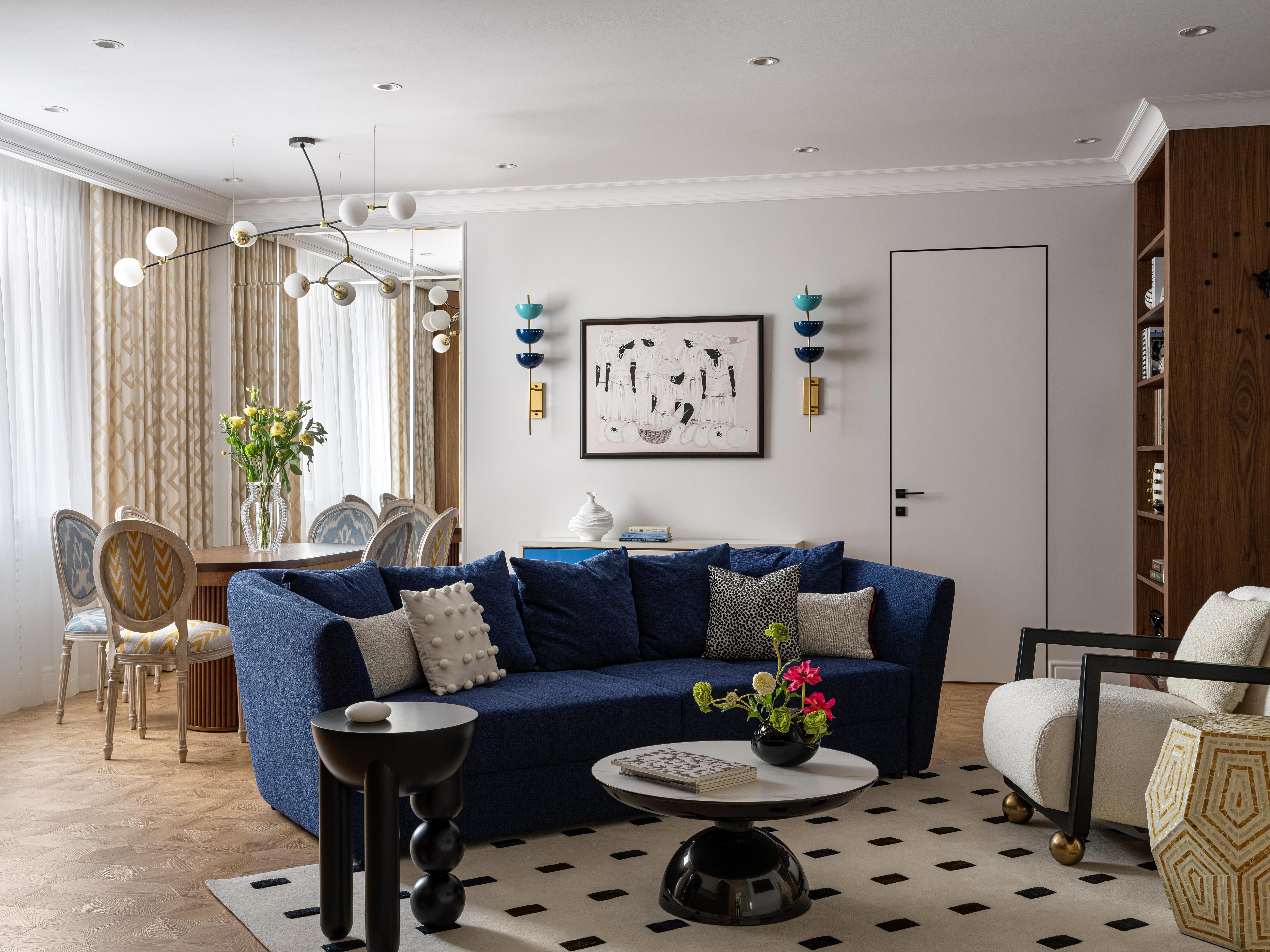 Начнем с кухни-гостиной. Здесь смешались современность, отголоски ар-деко и классика. Такому большому помещению досталось одно небольшое окно: чтобы визуально его расширить и «затянуть» как можно больше дневного света в квартиру, я разместила на смежной стене большое зеркало. У квартиры в принципе непростая планировка, довольно сложная геометрия. Я старалась продумать, как гостиная будет выглядеть со стороны прихожей, чтобы общая картинка была интересной и в то же время не перегруженной.