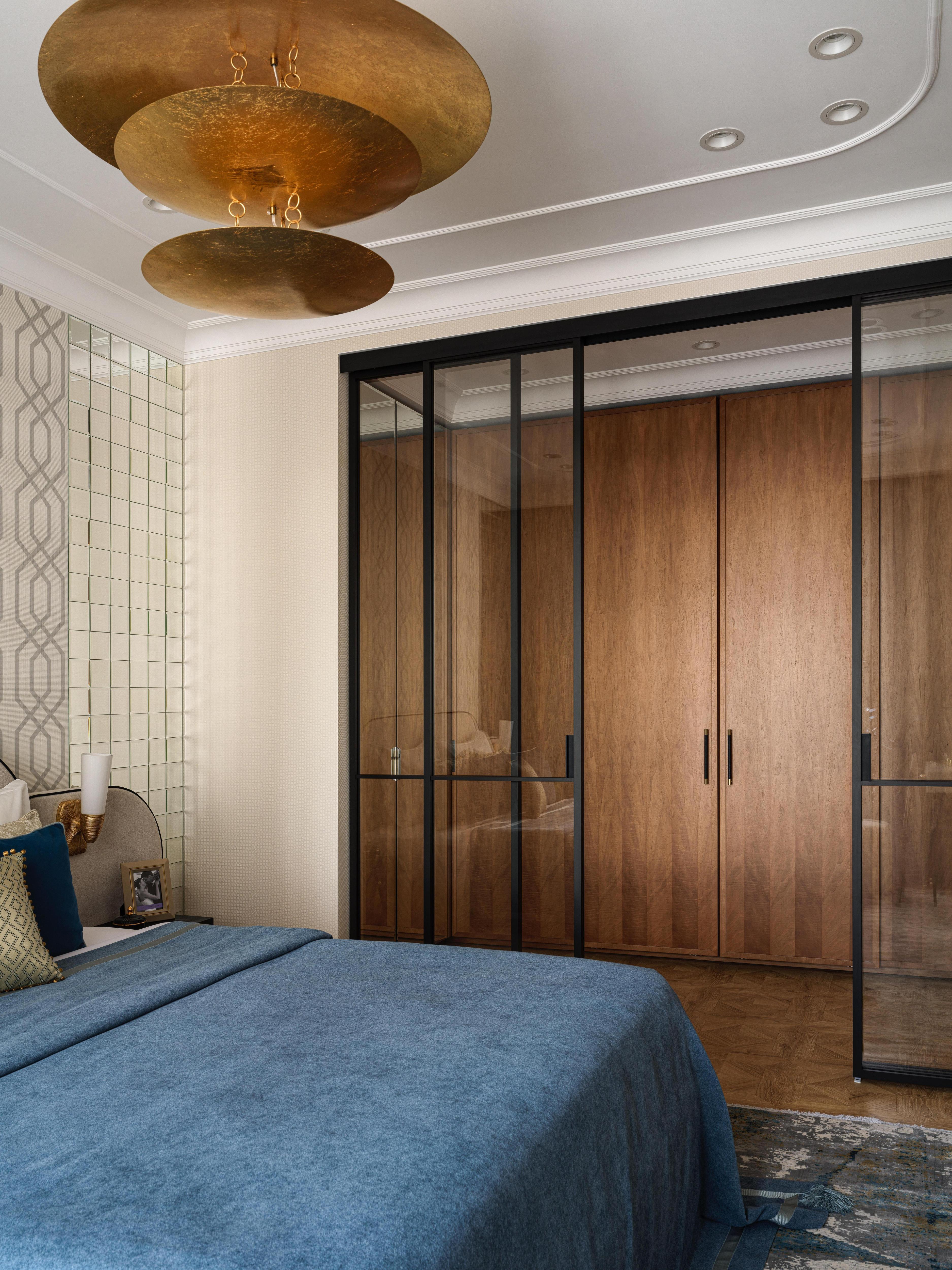 В спальню родителей проходим через гардеробную — ее фасады служат нейтральным фоном для цветовой и текстурной феерии. Заказчица любит восточную стилистику, и здесь мы оставили намеки на эту тему: обилие разного текстиля, насыщенные оттенки штор, покрывало с кисточками, обилие декоративных подушек, мягкий ковер, бра в виде факелов, позолоченная люстра на цепях — все это создает мягкое обволакивающее пространство, очень поэтичное. Теплых оттенков здесь много, но чтобы все уравновесить, я добавила охлаждающие сине-белые вкрапления. А еще стоит обратить внимание на зеркальную мозаику с фацетом, она делает комнату объемнее. И, конечно, волшебно преломляет свет!
