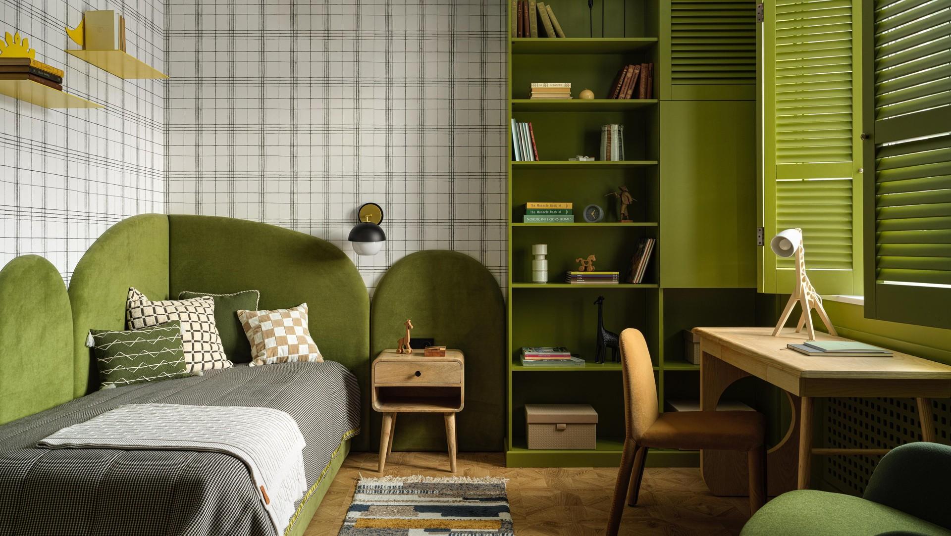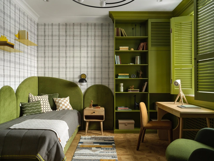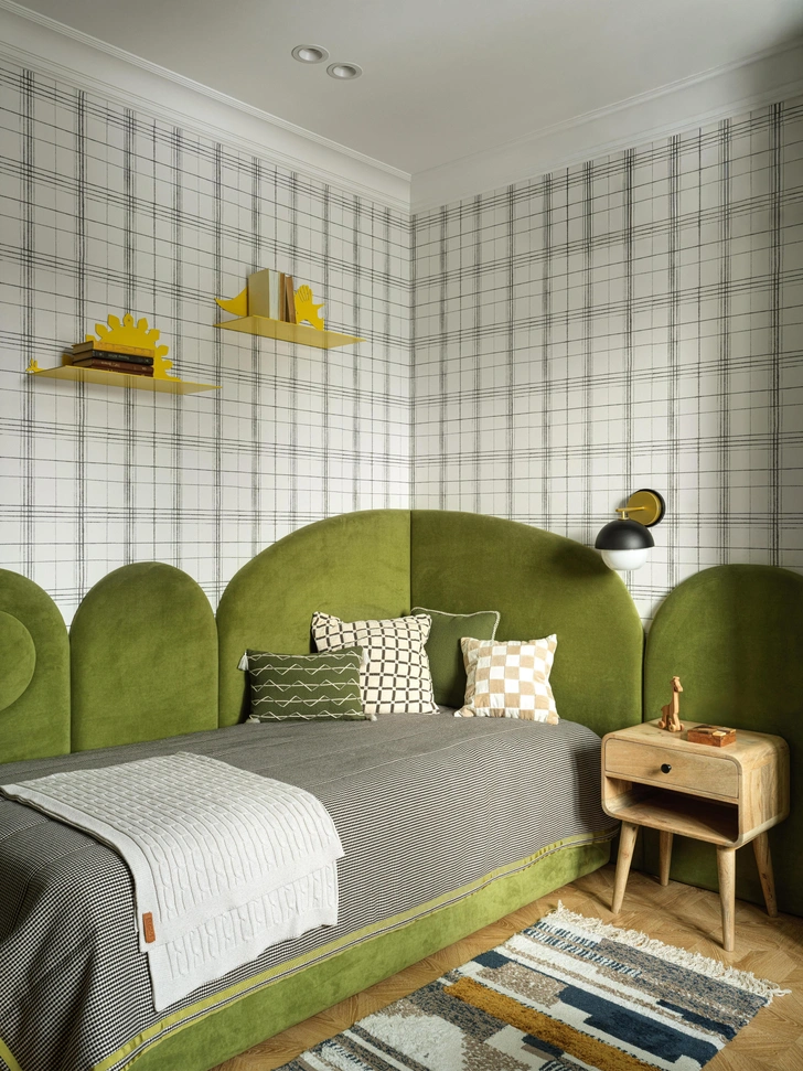 В другой комнате живет маленький любитель динозавров, поэтому главным стал зеленый цвет. Форма кроватки и роспись на фасадах шкафа — это стилизованный хребет стегозавра и очертания туловища бронтозавтра. В форме динозавров даже желтые полочки для книг! А чтобы немного заземлить, успокоить такое динамичное пространство, мы добавили клетчатые обои, которые в подростковом возрасте можно не менять — они довольно нейтральны.