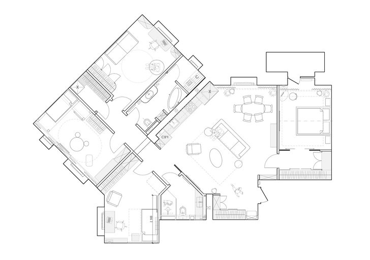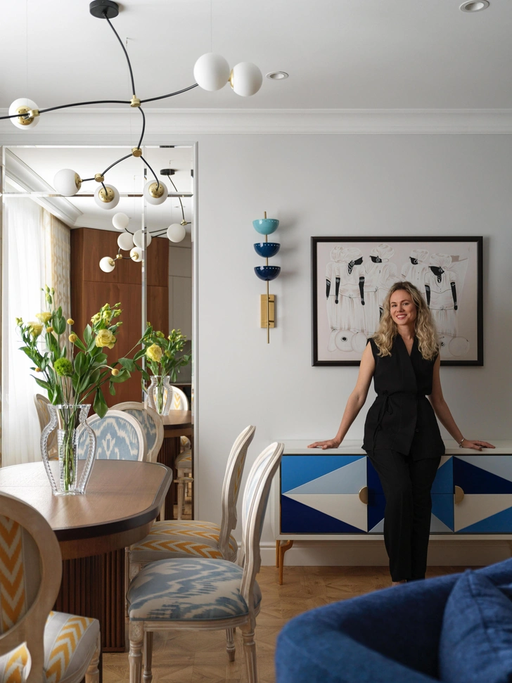С заказчиками мы знакомы давно, они невероятные люди. Это молодая семья с тремя детьми — много путешествуют и ценят прекрасное. Они сразу сказали, что не хотят скучного серо-бежевого минимализма с бетоном, и доверились моему вкусу. Это была большая радость: я не люблю работать по шаблонам. Необычная мебель, смелые сочетания — все это здесь есть. Мы с заказчицей условно назвали этот стиль «парижский фьюжн шик».