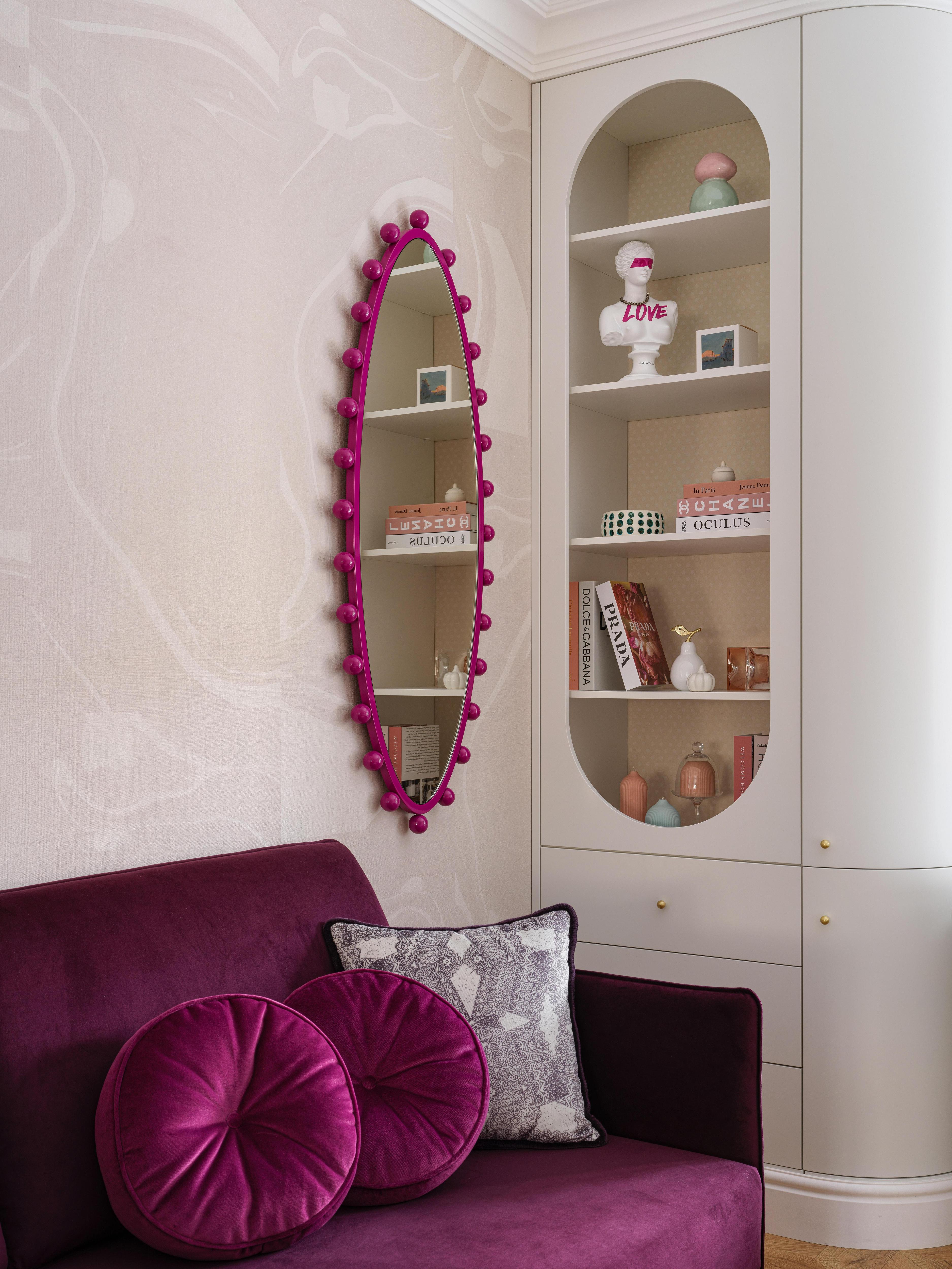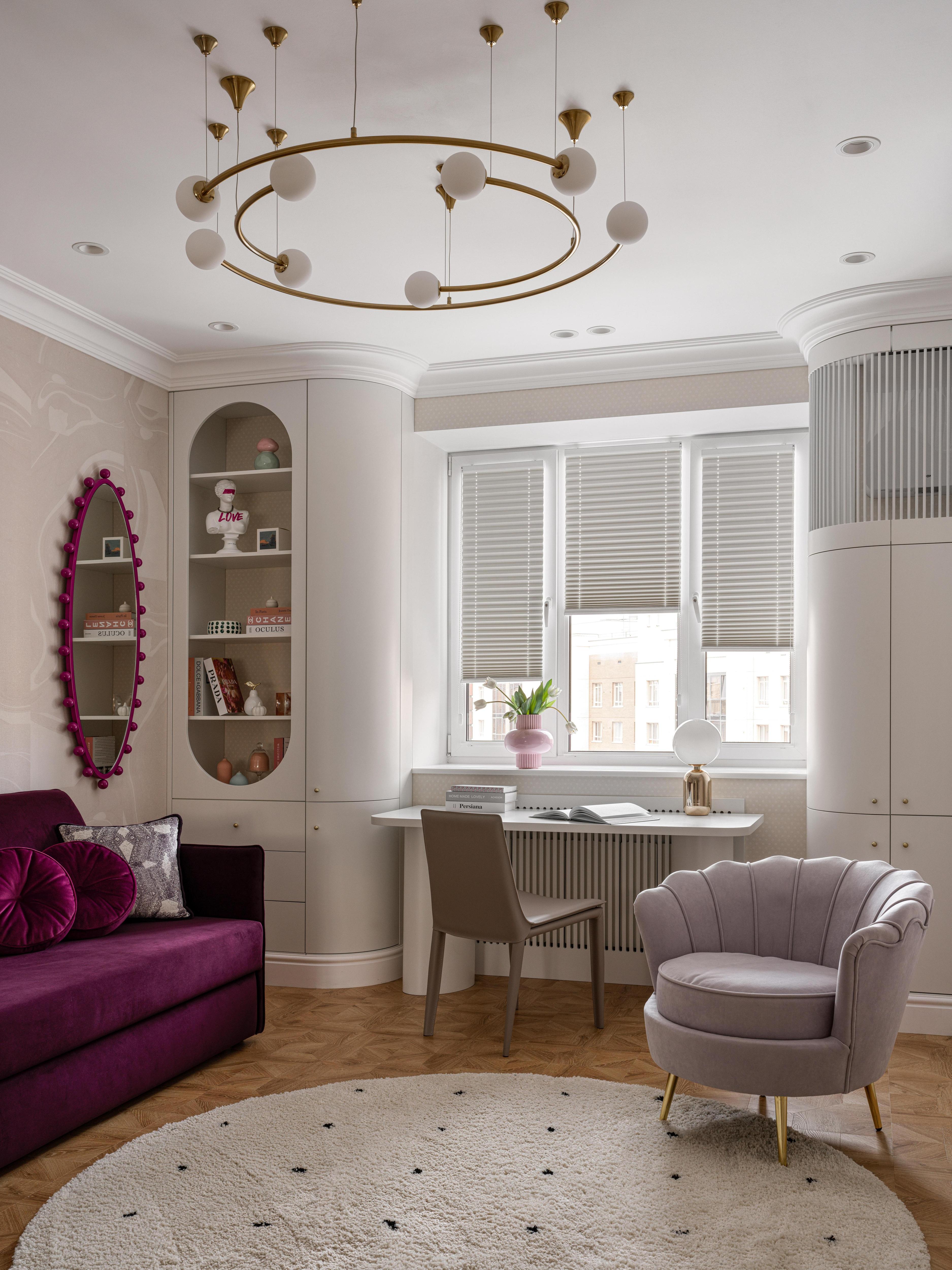 А это комната старшей дочери, ей 11 лет. Она необычайно развита интеллектуально, и на полшага уже вышла из детства, так что здесь хранение создавали уже не для игрушек, а для книг. Общий тон интерьера вполне взрослый, но не без детской непосредственности, эти нотки было важно сохранить. Скругленные углы мебели, серо-пурпурная гамма, фиолетовый диван, того же оттенка рама зеркала, кресло в форме ракушки — получилось очень нежно.