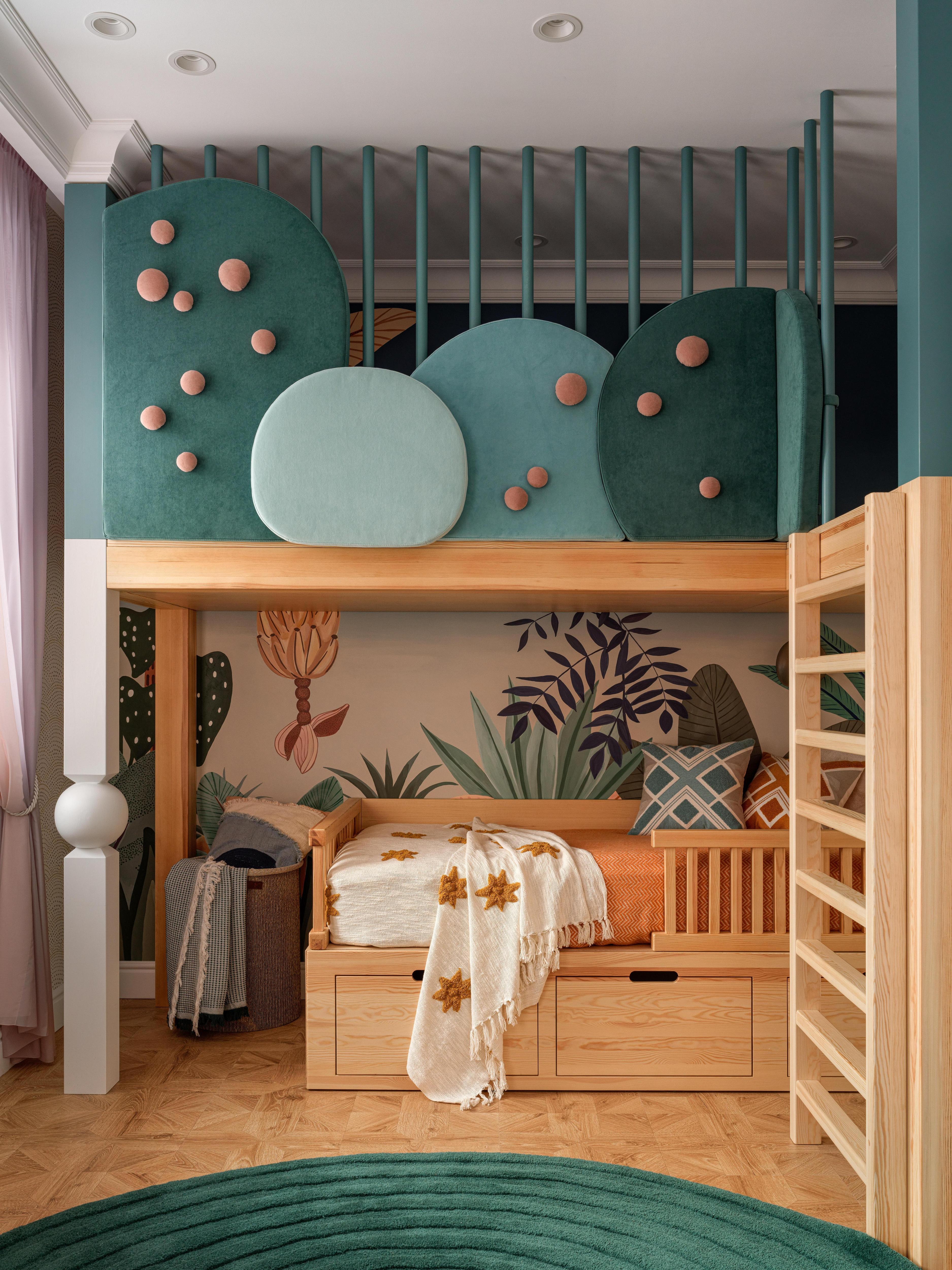Девочка очень подвижна, постоянно придумывает какие-то игры и сооружает домики из подручных вещей, поэтому я спроектировала двухъярусную кровать, которая стала бы настоящим домиком на дереве для этой маленькой обезьянки. А еще здесь есть оранжевая «норка», как мы ее назвали, где можно уютно посидеть с книжкой или игрушкой.