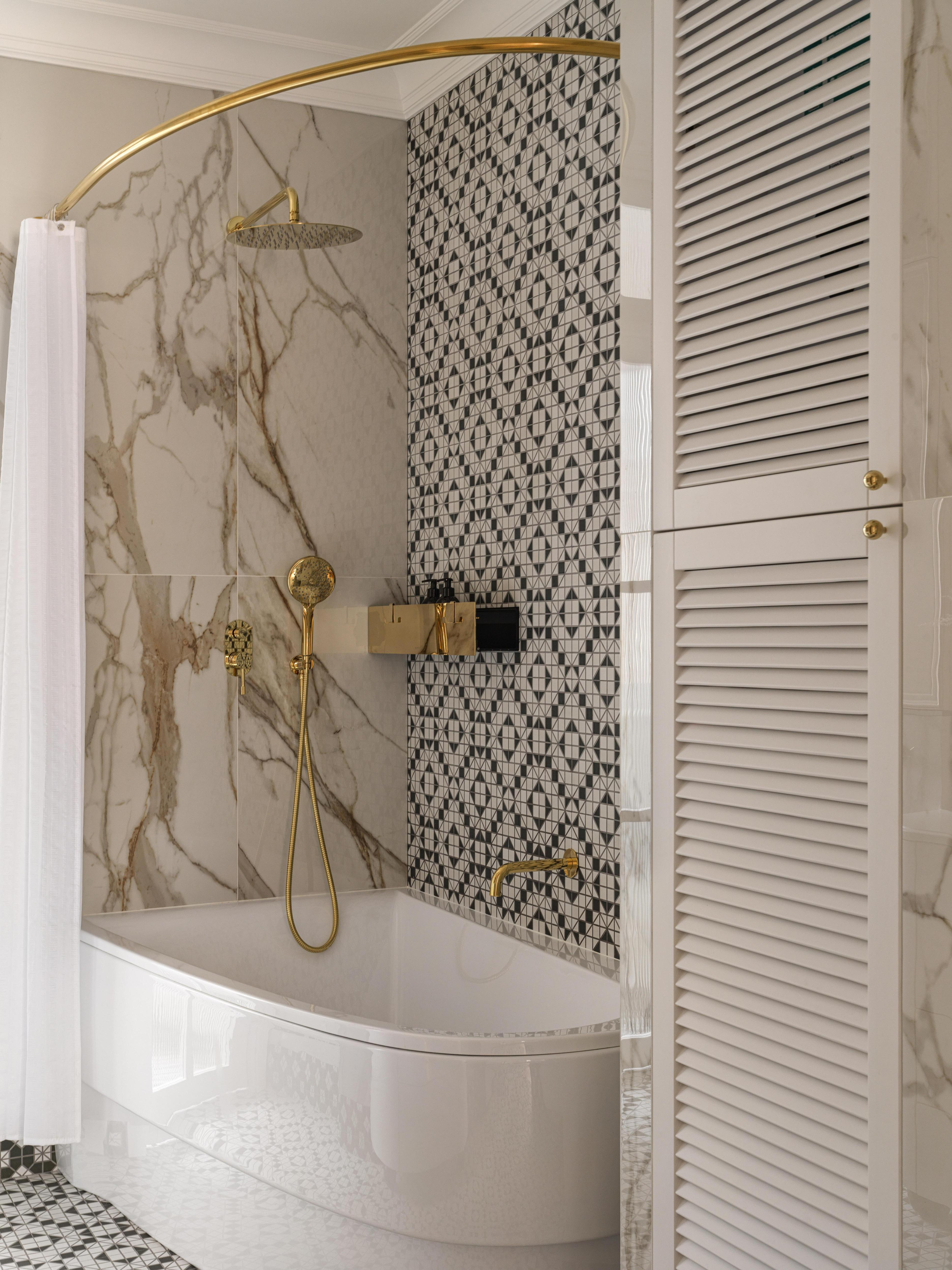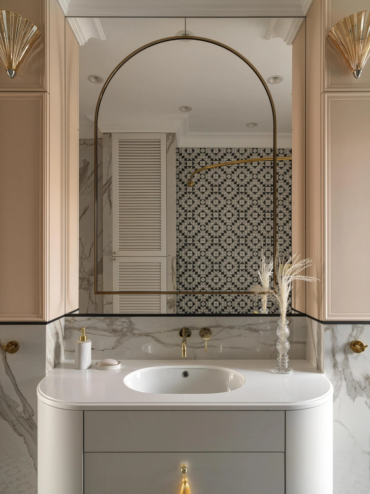 Керамогранит, Naxos Ceramica, салон Florentia. Зеркало и рама изготовлены по эскизам дизайнера, Studio Black Work. Бра, Loft concept. Маленькое зеркало, La Redoute. Сантехника, Boheme, салон «Медуза».