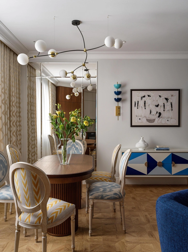 А вот сказать, какой предмет здесь самый необычный, не смогу — это сложный вопрос. Проще сказать, какой предмет самый обычный. Большая часть мебели — как корпусной так и штучной — изготавливалась на заказ по моим эскизам. Журнальные столики, ковер, комод, синий диван, разная обивка стульев — каждый предмет отличается, и при этом не утяжеляет пространство. В этот ансамбль вписалась картина заказчиков, купленная в одном из путешествий.