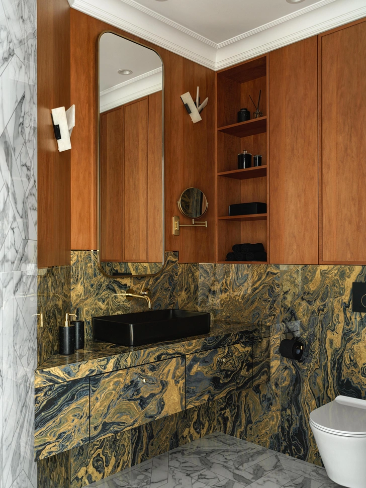 Гостевой санузел по цветовому решению перекликается с кухней-гостиной. Тут сочетаются увесистый алебастр на светильниках, шпонированные деревянные панели, текстура мрамора и блеск позолоты. Черная раковина добавляет роскоши, а узор на керамограните, напоминающий звездное небо, создает космическую атмосферу.