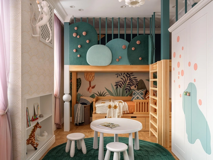 Светильник, Seletti, салон «Геометрия». Роспись на стенах, Taknado buro. Текстильные элементы, фабрика «ЛюМа». Покрывало и ковер, La Redoute. Кроватка, шкаф и полки, мастерская Василия Кириллова. Обои, Aura. Столик и стульчики, IKEA.