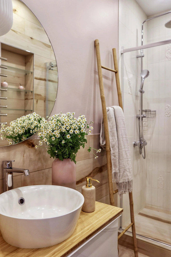 В санузле мы сочетали два материала: керамогранит и специальную влагостойкую краску. Чтобы сэкономить место, вместо ванной решили сделать душевую кабину. При этом удалось разместить стиральную и сушильную машины во встроенный шкаф в нише.