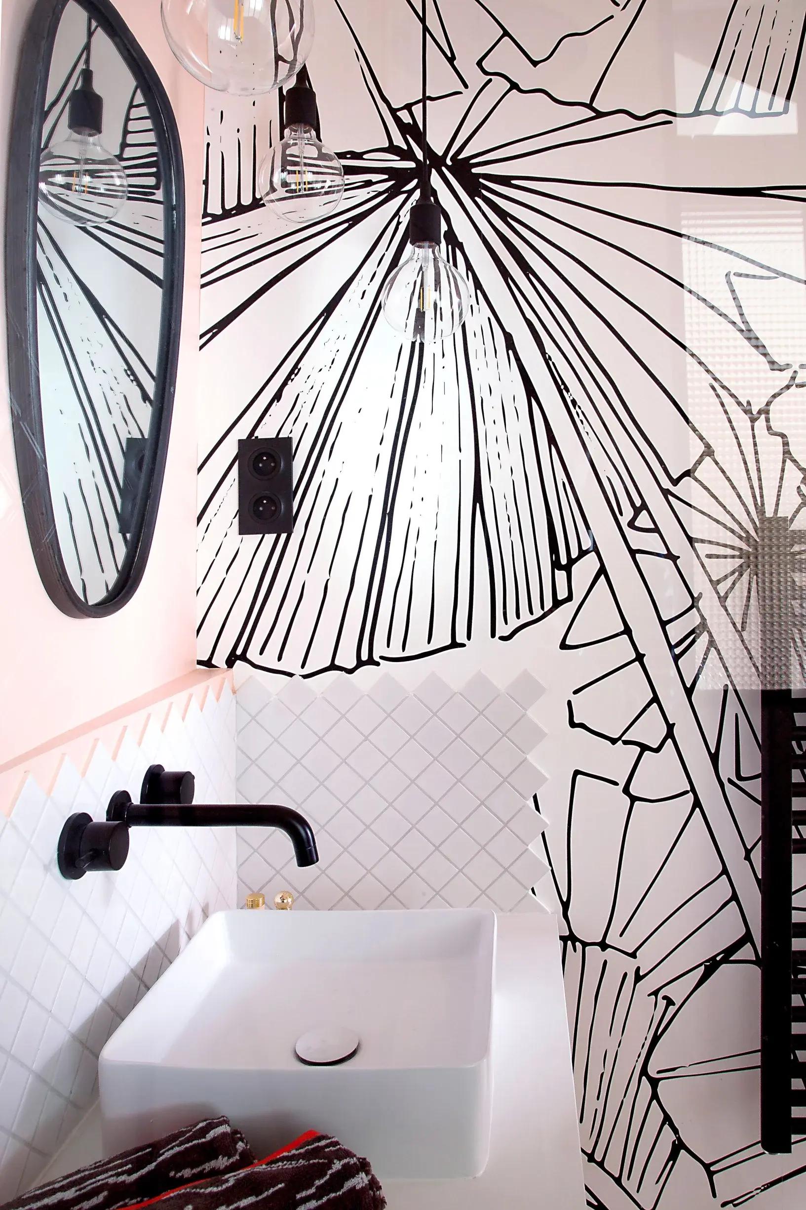 Обои Sagamore из коллекции Au fil des couleurs. Раковина, смесители и полотенцесушитель, masalledebain.com. Зеркало, La Redoute Intérieurs. Полотенца, Kenzo.