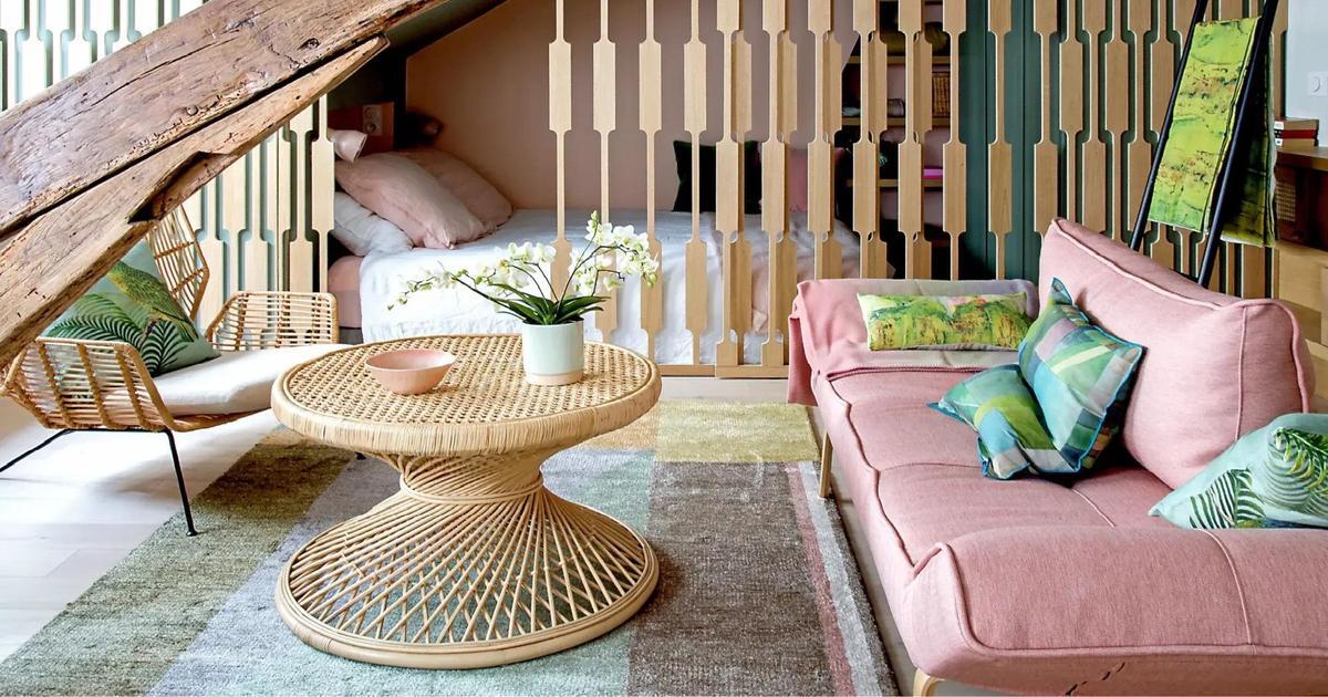 Для гостиной выбрали мебель из светлого дерева и ротанга, добавив детали нежно-розового текстиля. Вход в спальню скрывает раздвижная ширма с мавританскими вырезами, которая разделяет комнату, но не загромождает ее. Ванную украсили обоями с японскими зонтиками.