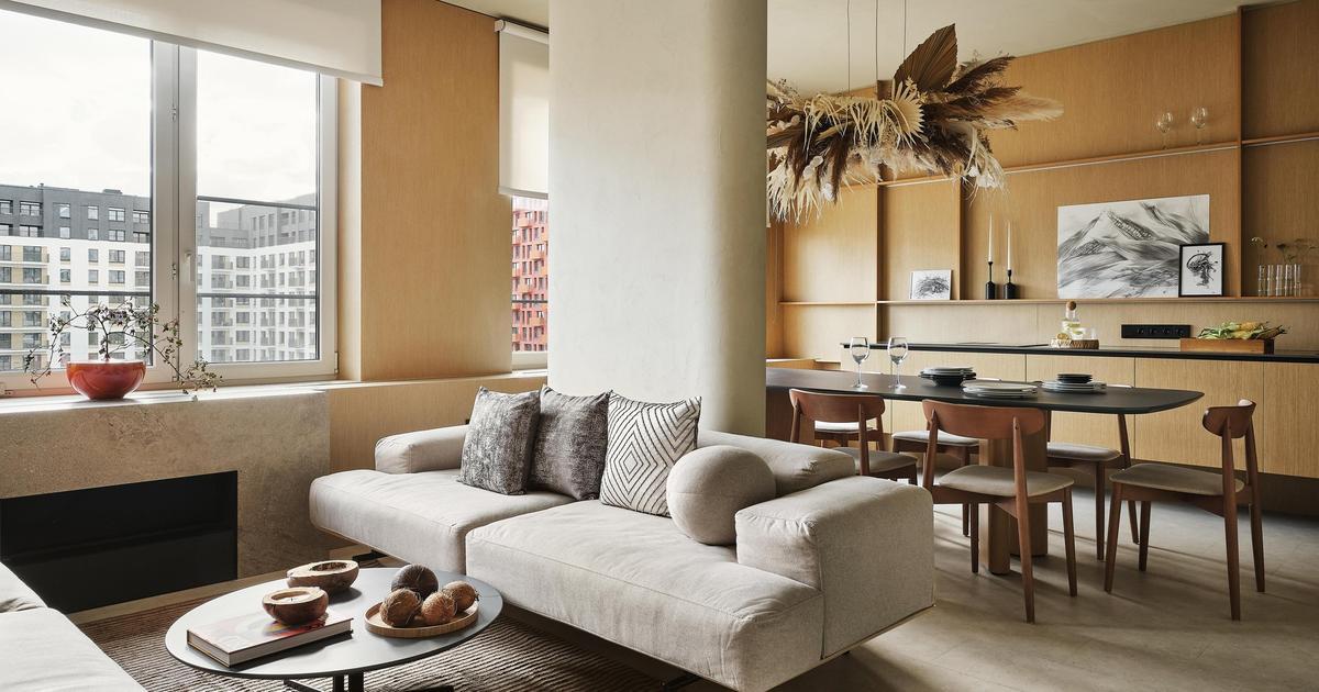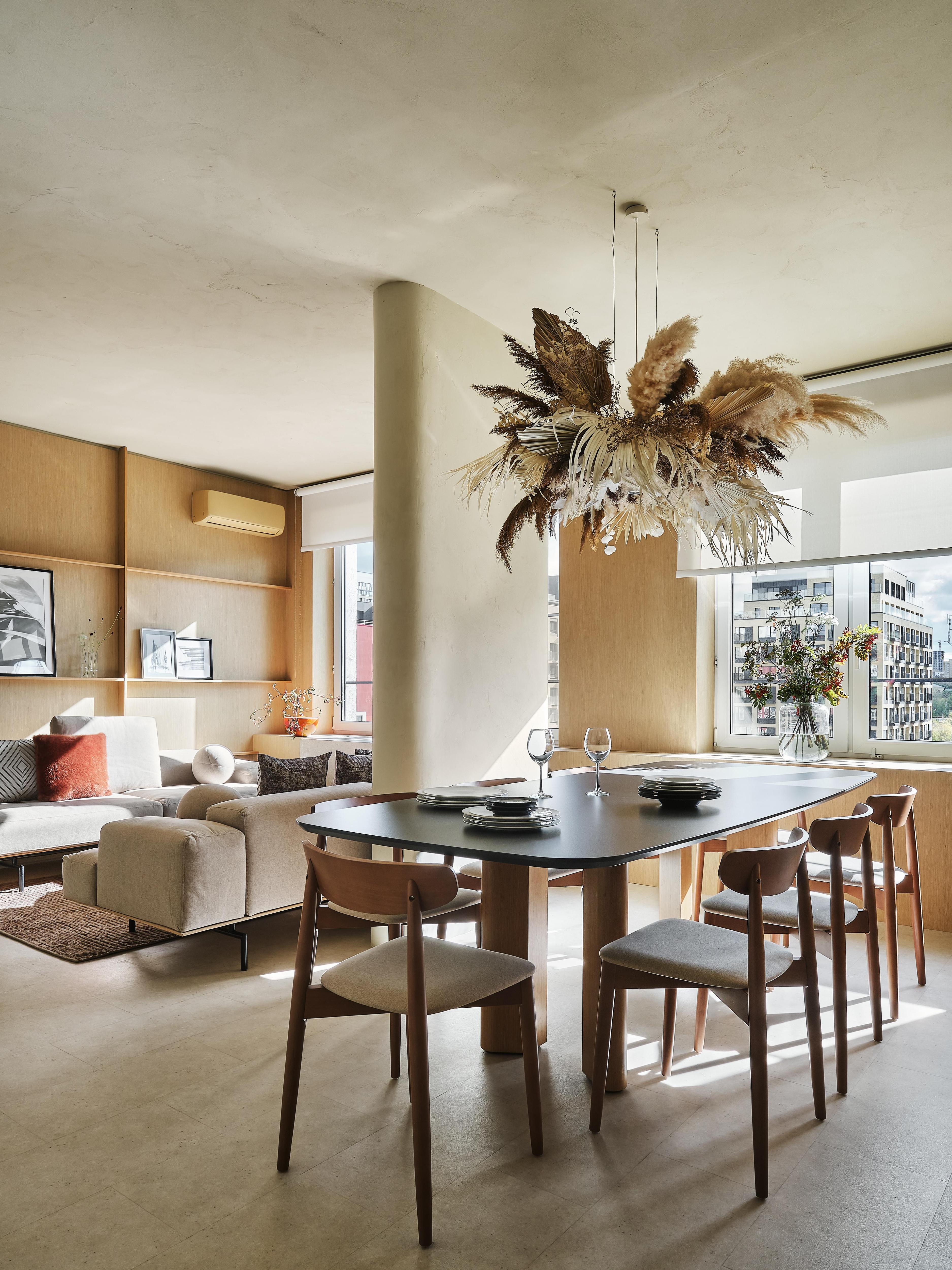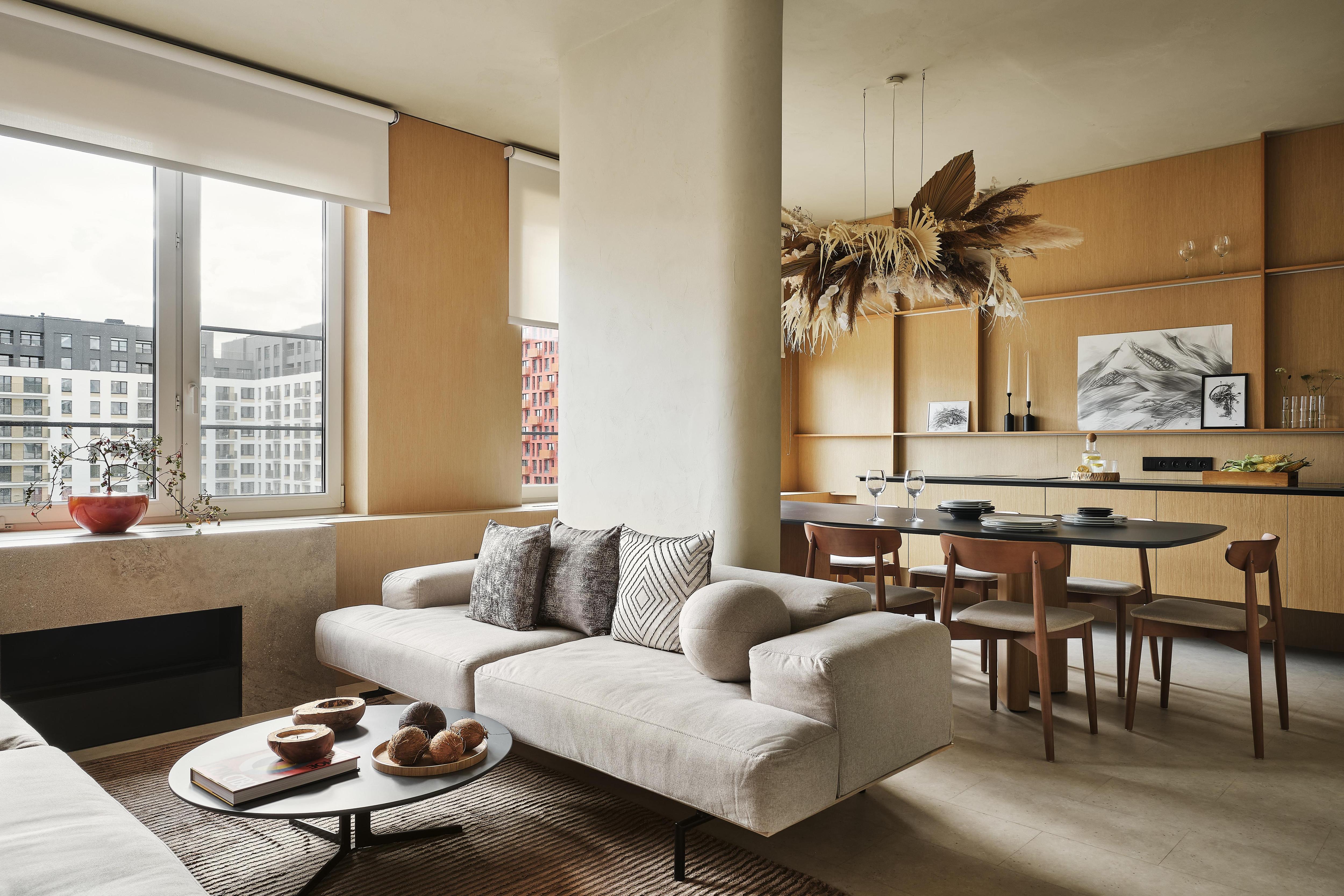 Диван, стулья, обеденный стол, штукатурка и корпусная мебель изготовлены на заказ по эскизам дизайнера. Свет, Arlight. Керамогранит на полу, Estima.