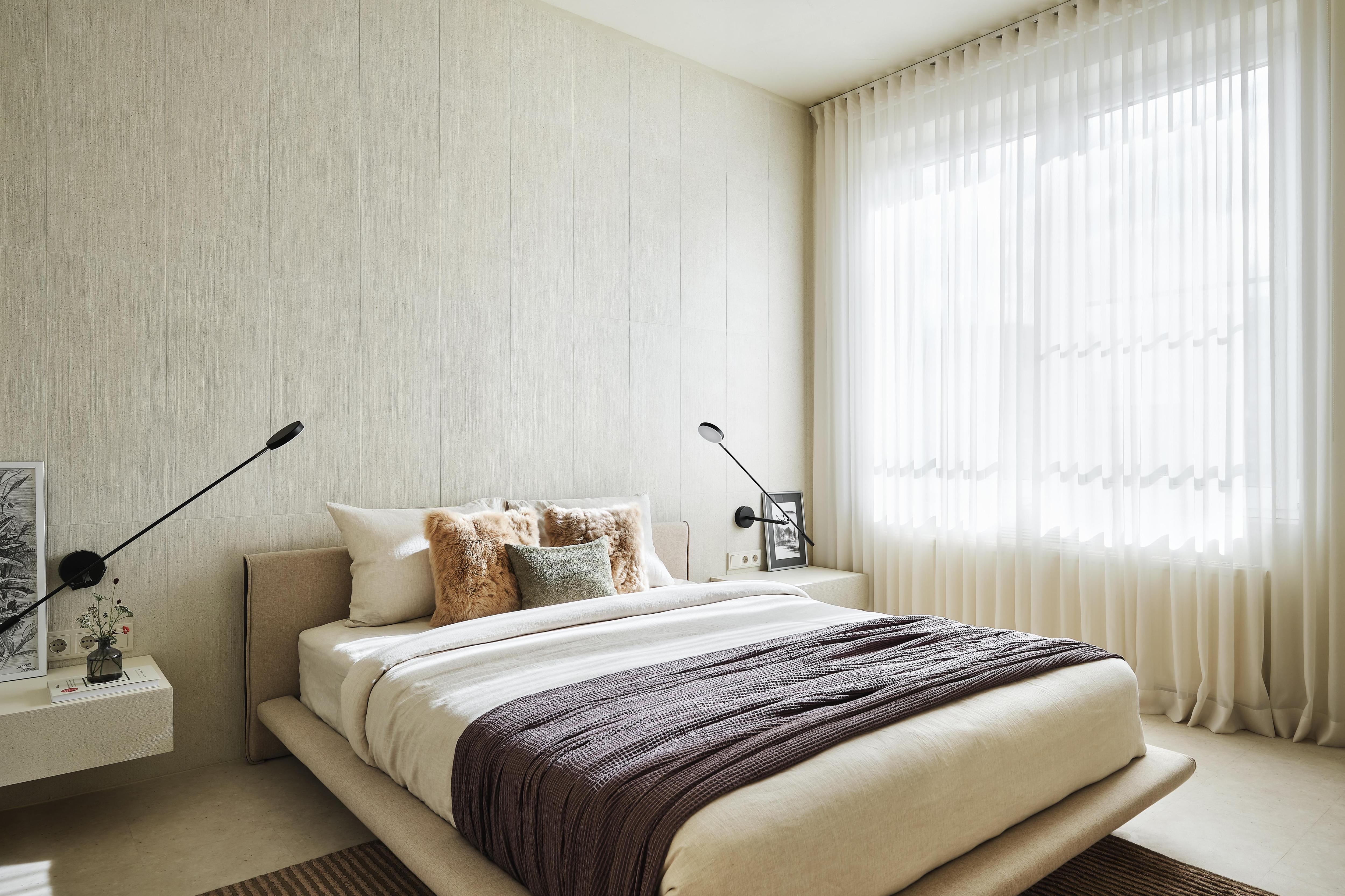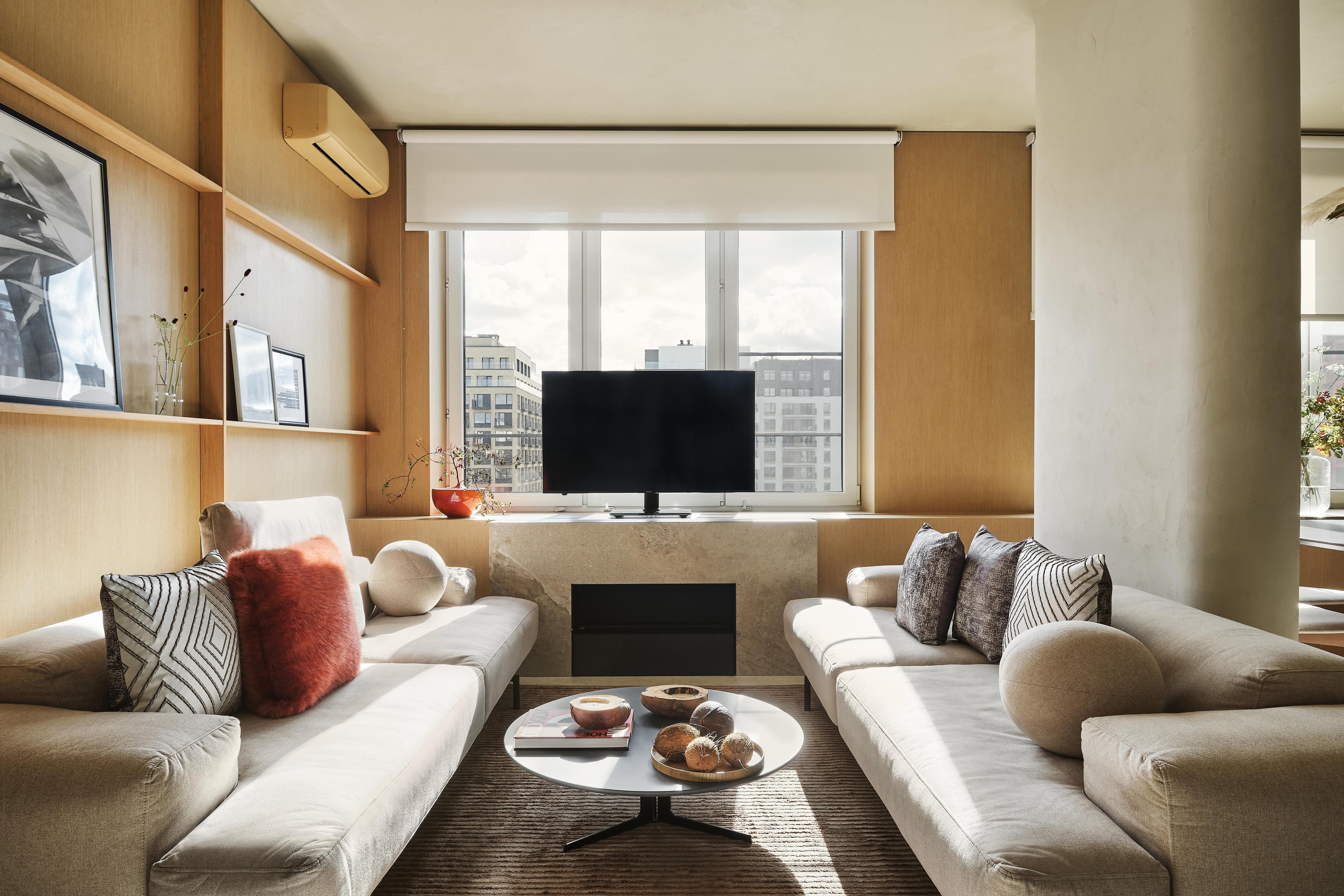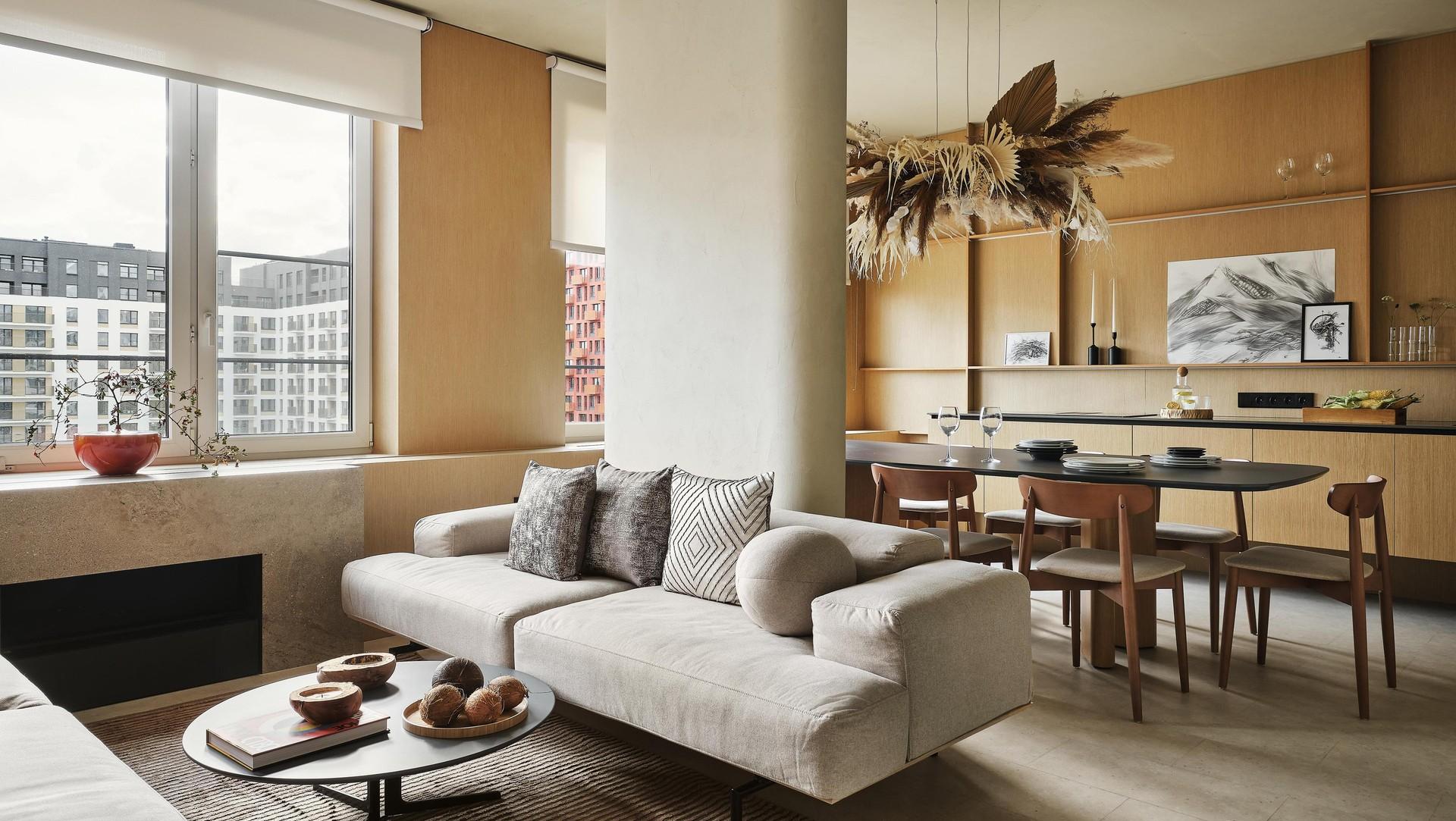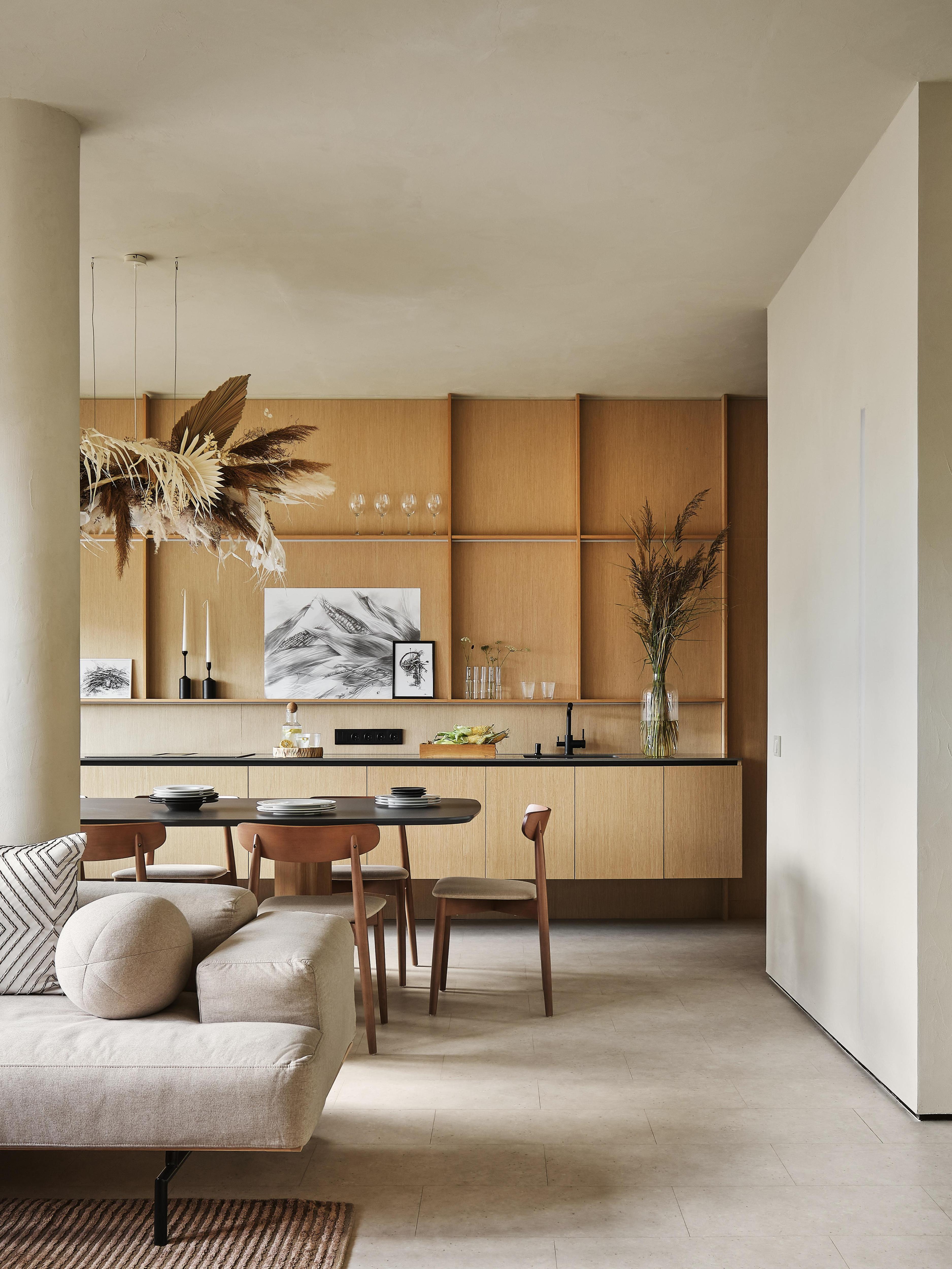 Этот проект не перегружен декором: хороший дизайн — это как можно меньше дизайна, так что в отделке мы использовали только два цвета — бежевый и дерево. Мы вычистили пространство: установили двери скрытого монтажа, теневой плинтус и подвесили кухню, а стены, пол и потолок отделали в одном цвете — так интерьер выглядит визуально больше и чище.