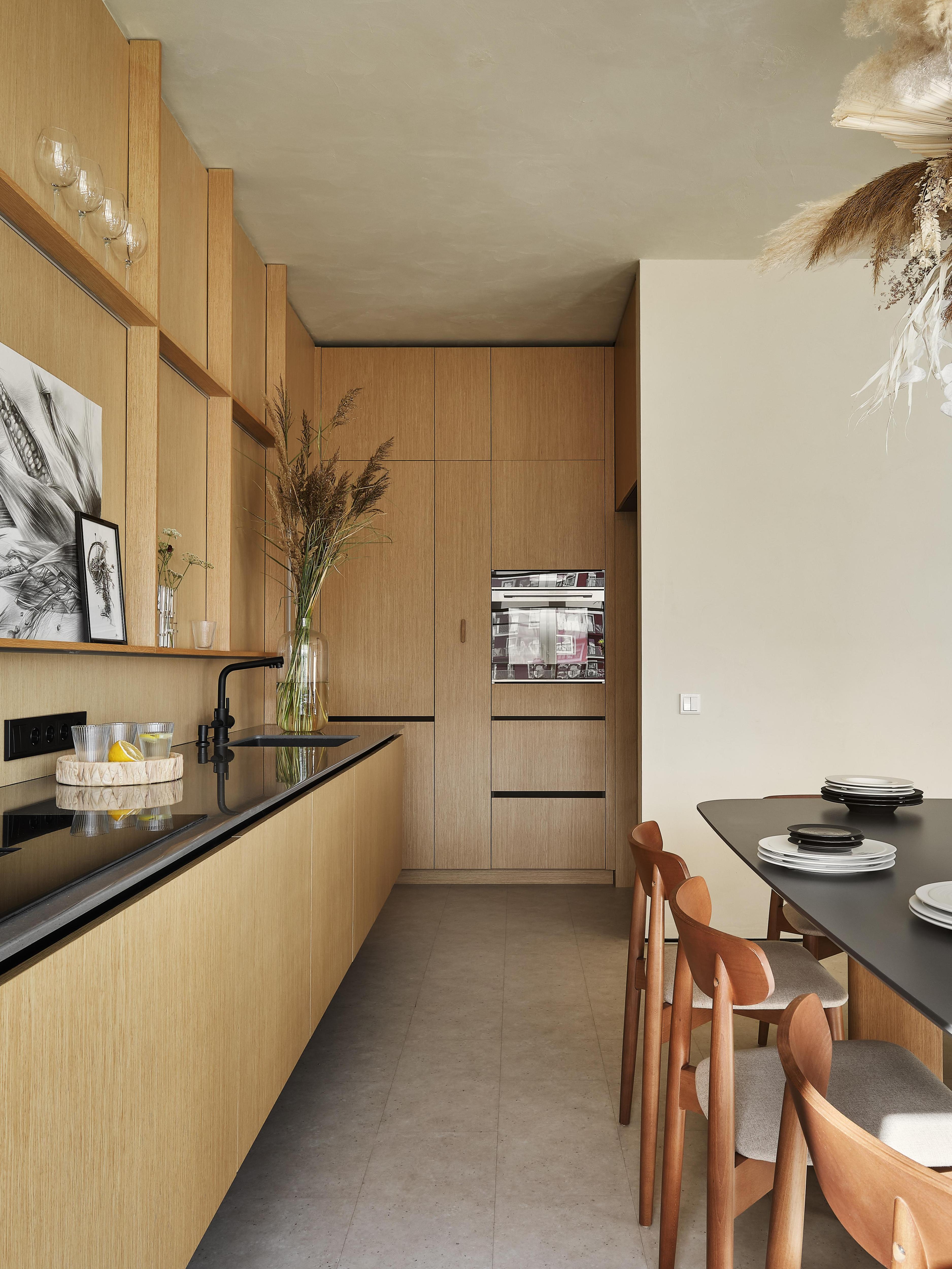 Кухню мы растворили в пространстве: подвесили ее и сделали в шпоне дуба, как и стену за ней. Рабочая поверхность и хранение под ней — почти 4 метра, здесь есть два пенала со встроенной техникой и хранением, а также вместительный холодильник, который нам удалось скрыть.