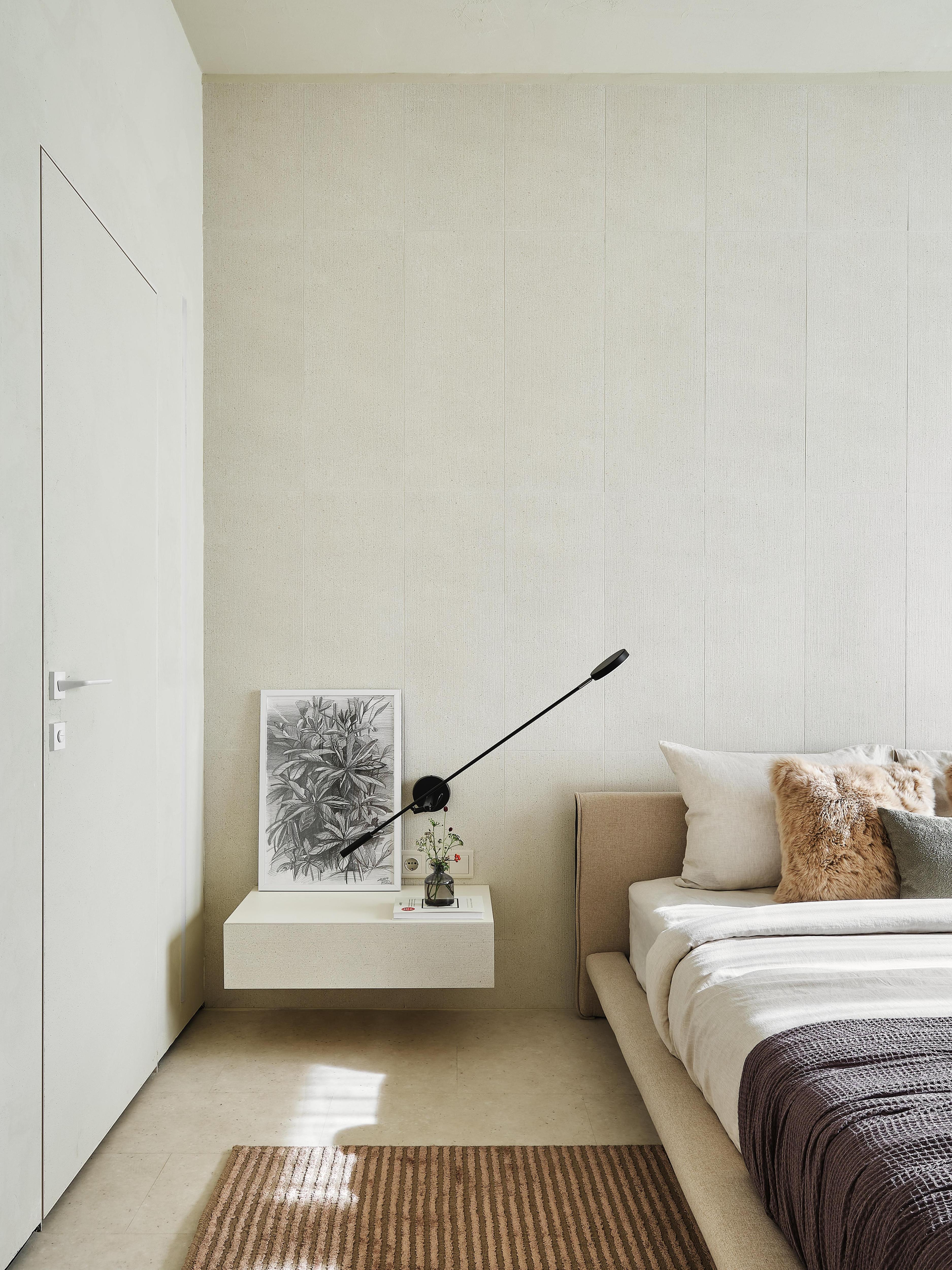 В спальню ведет скрытая дверь, со внутренней стороны отделанная зеркалом. Это очень удобно, потому что рядом находится встроенный в стену гардероб. Сама по себе спальня очень простая, монохромная — это небольшое помещение, поэтому мы не хотели его перегружать.