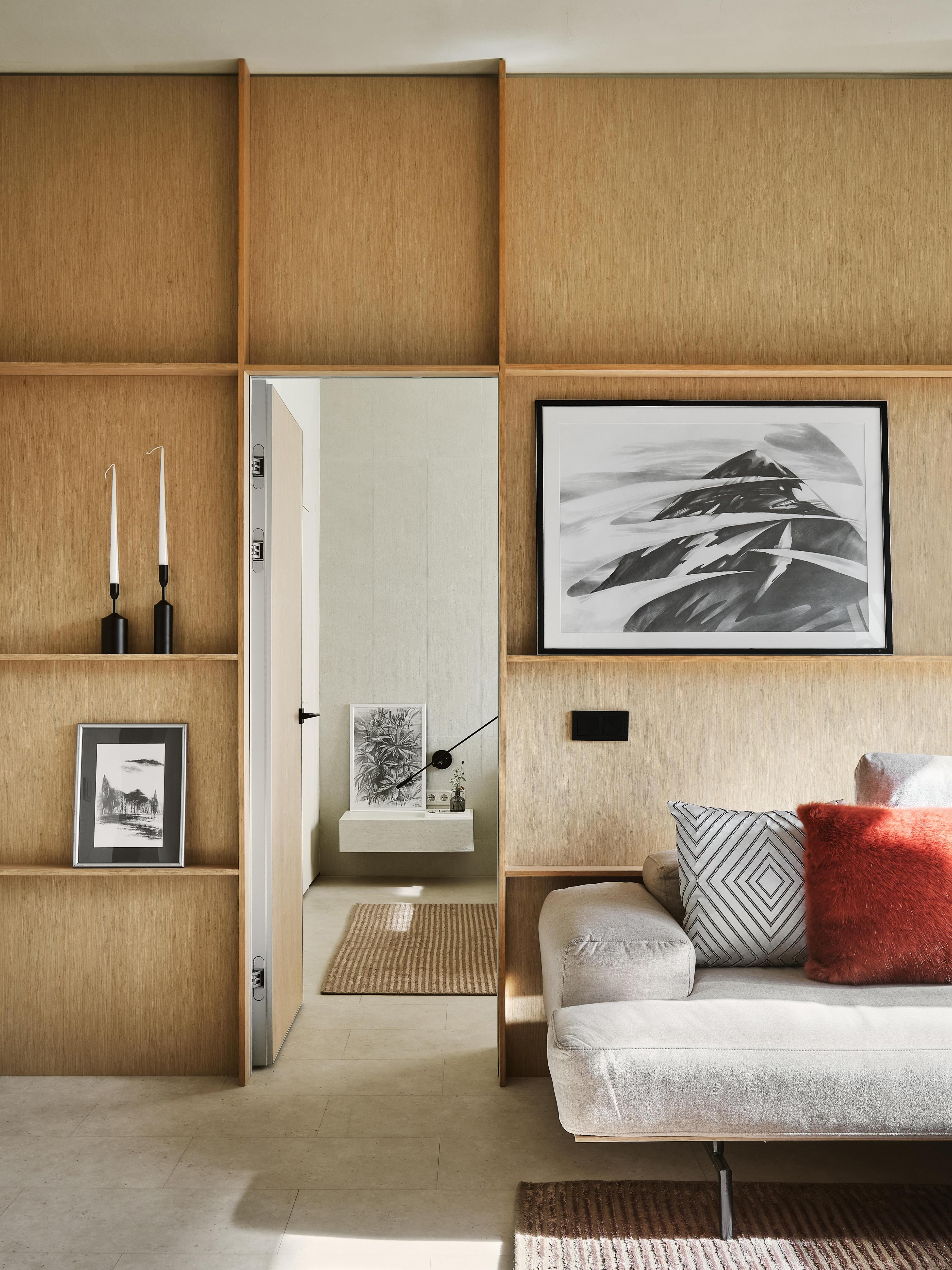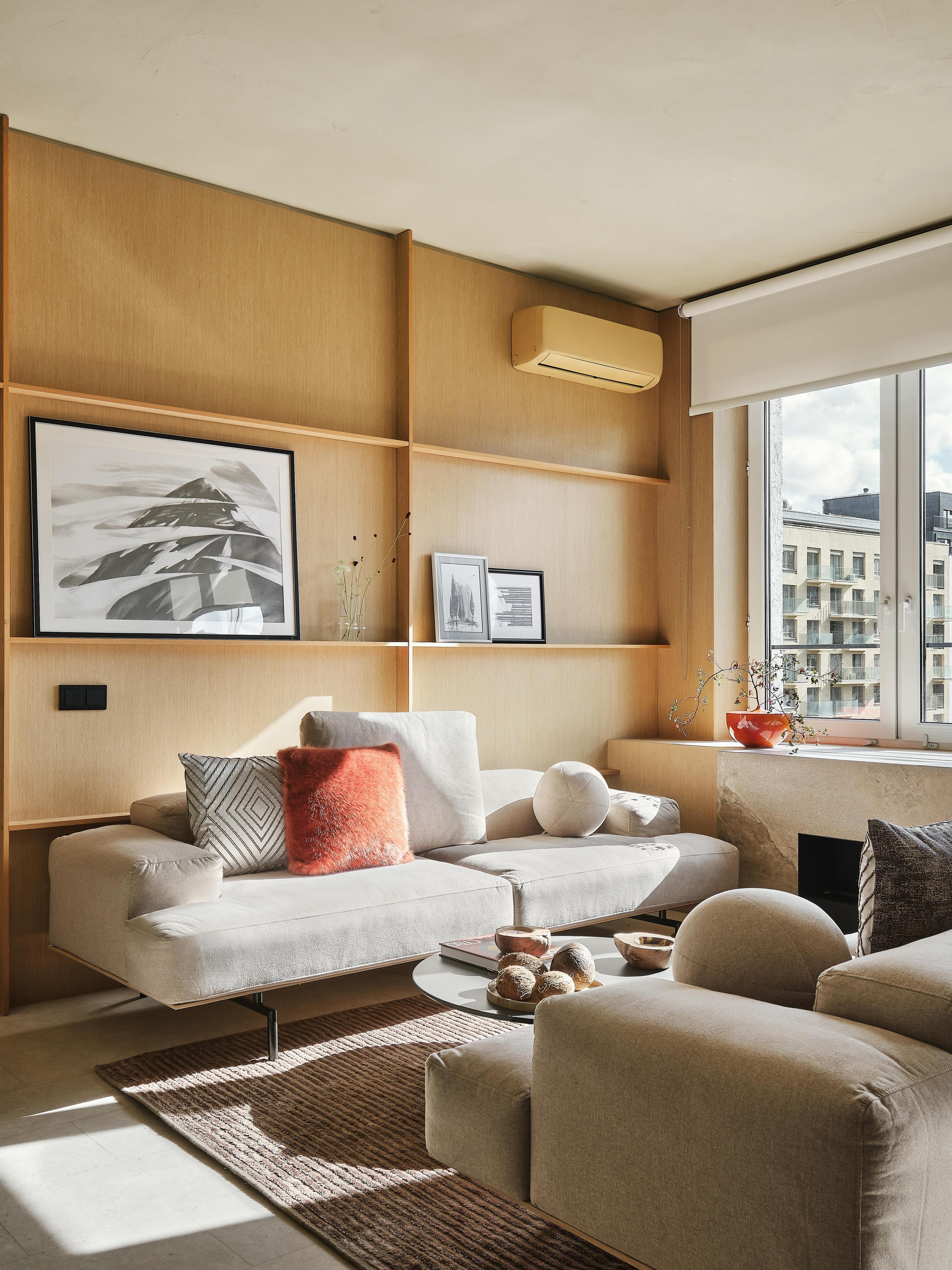 Часть стен отделана деревянными панелями, а на их стыках мы сделали полочки — отличное место для картин и декора. К тому же, они задают ритм и отбрасывают геометричные тени. Мы старались сделать это пространство фоном для жизни наших заказчиков — таким, чтобы оно было универсальным для любого декора.