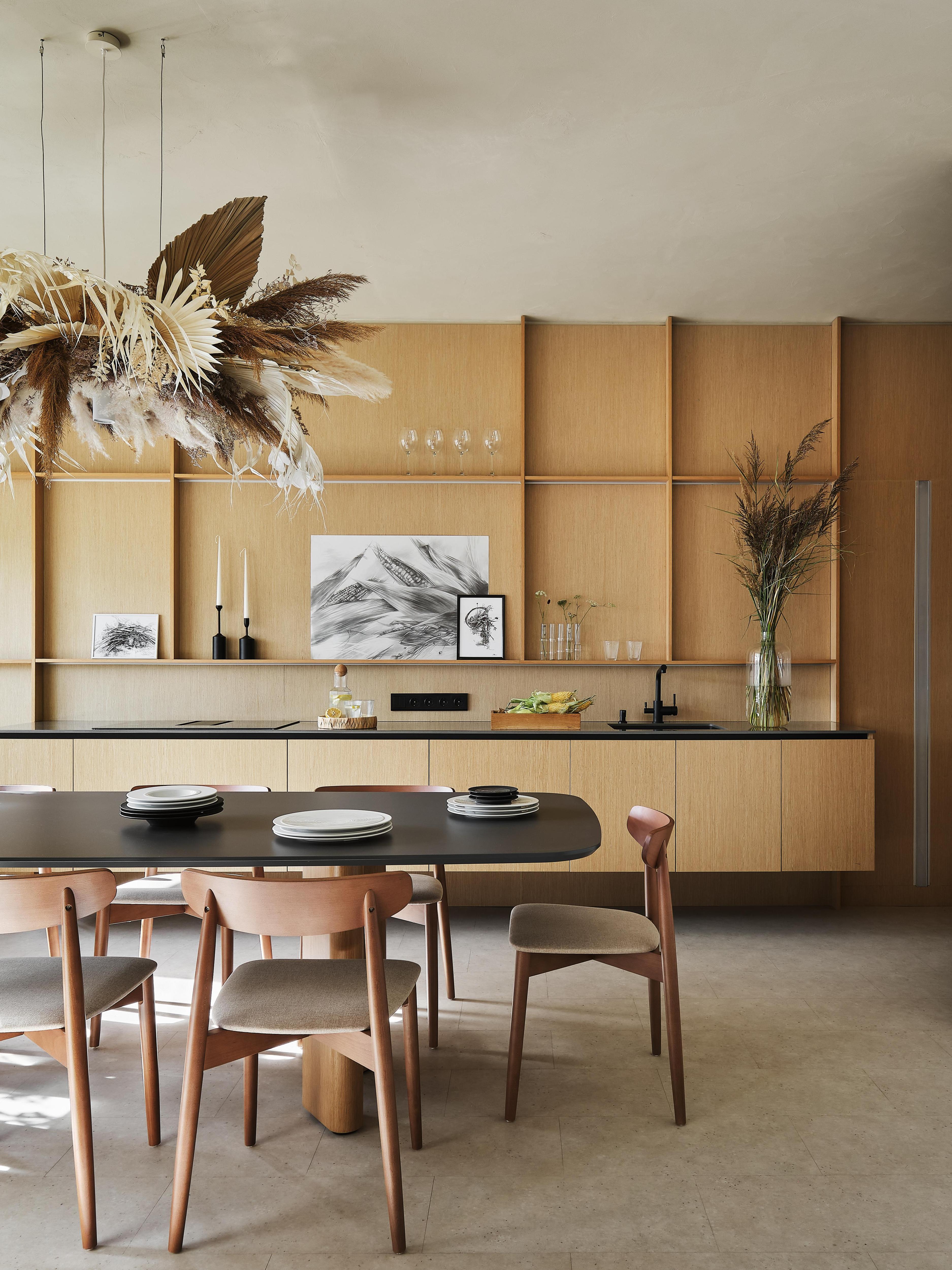 Главный композиционный и декоративный элемент находится над столовой зоной — люстра из сухоцветов по нашим эскизам. Она смягчает строгие линии в интерьере и добавляет уюта.