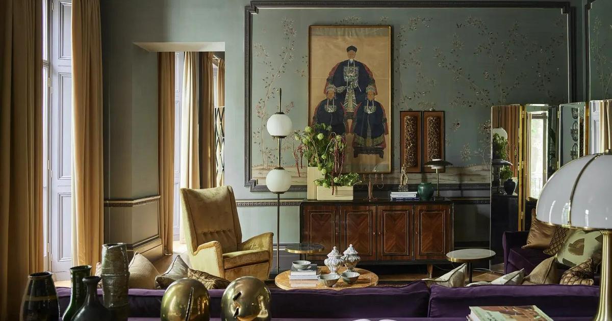 Эти предметы расставлены так, чтобы создавать отдельные визуальные акценты в пространстве. Стены окрашены в сложные оттенки, например, цвет селадона, и дополнены панелями декоративных обоев.