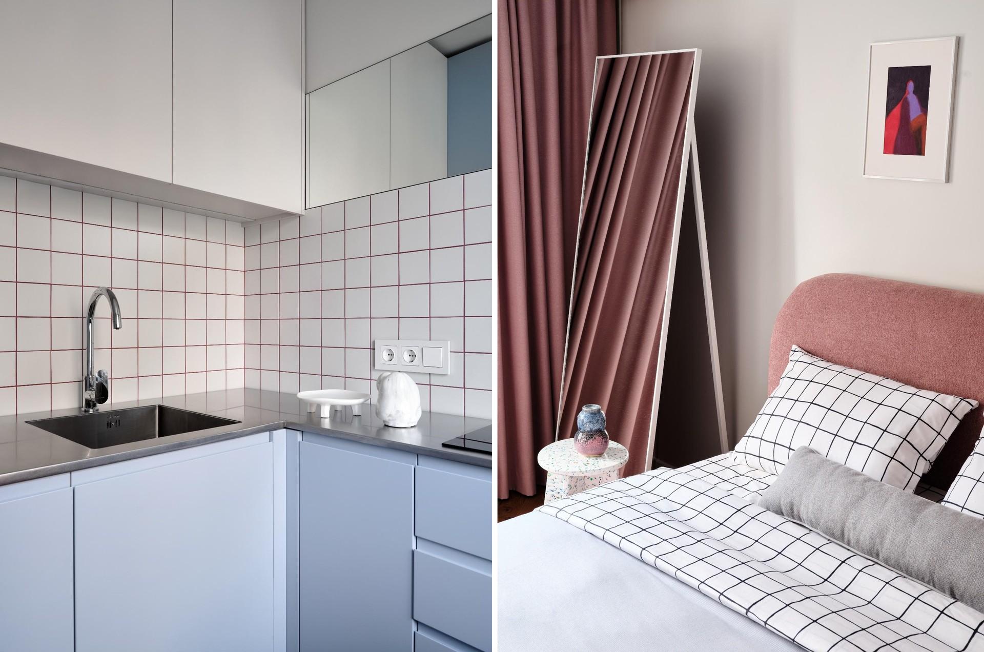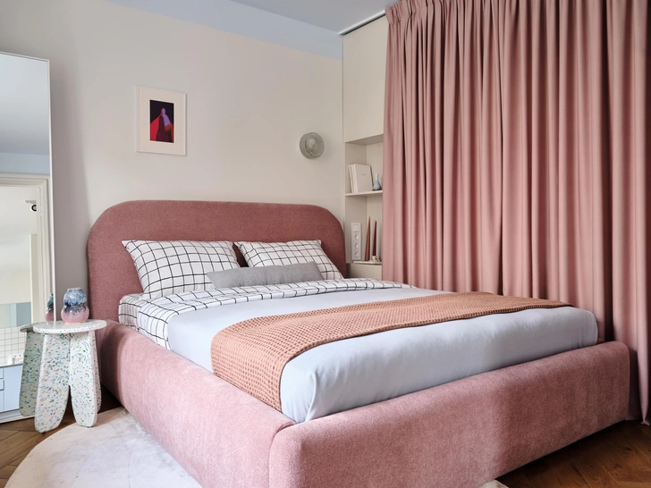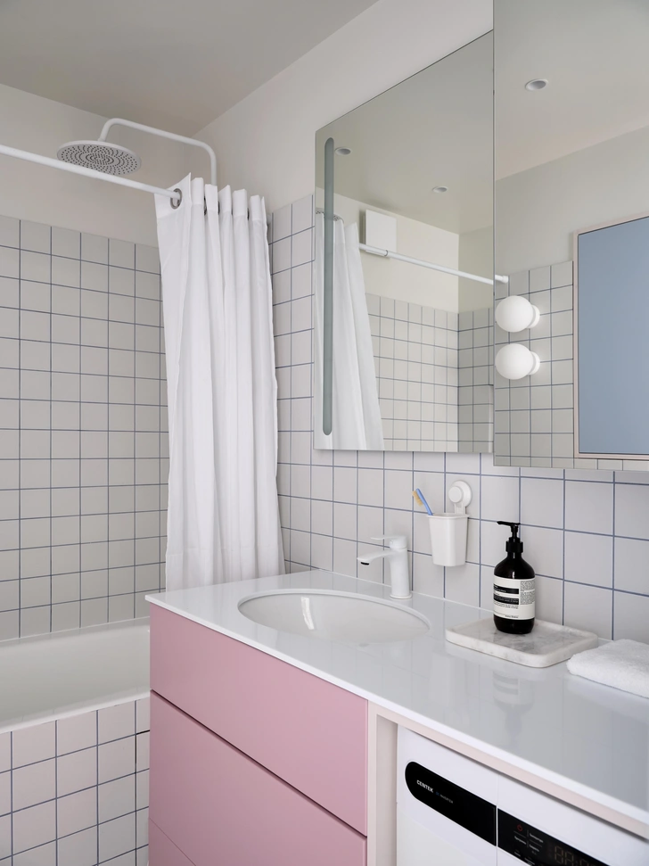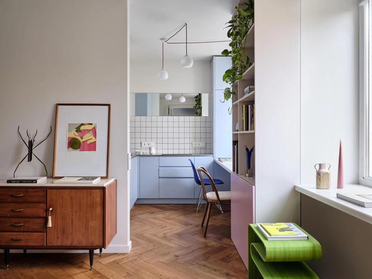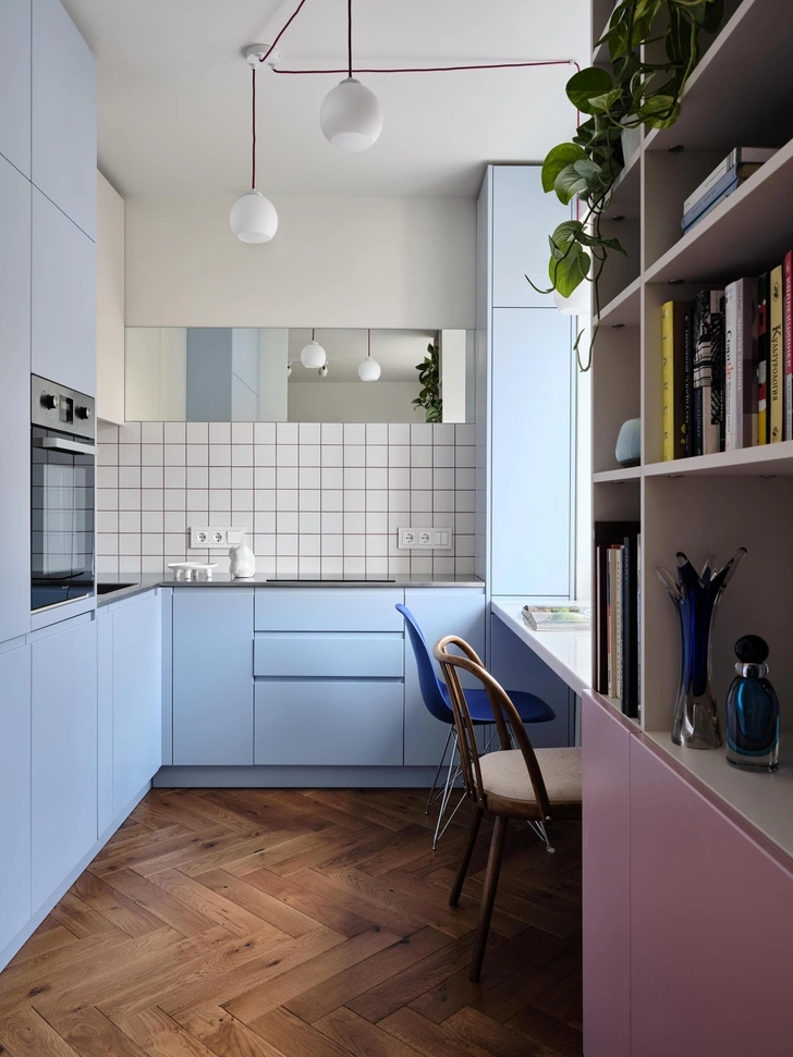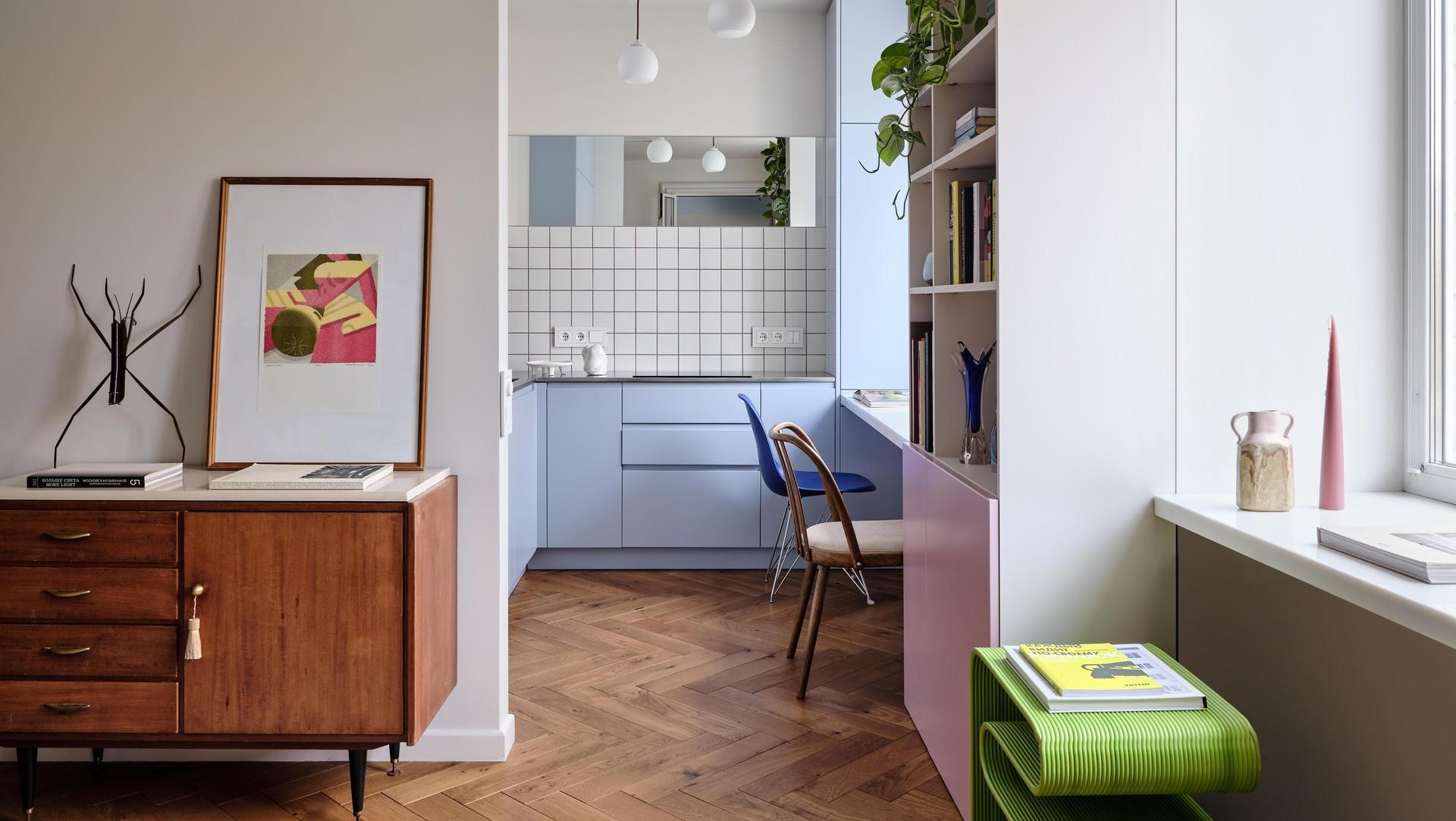 Жизнь у заказчицы насыщенная: это подчеркивают и «дофаминовые» акценты (темно-фуксиевый диван, цветная затирка на кухне, голубой гарнитур, розовая кровать), и новая планировка. Легко переходить из одной зоны в другую, легко пользоваться компактной кухней, легко поддерживать порядок.