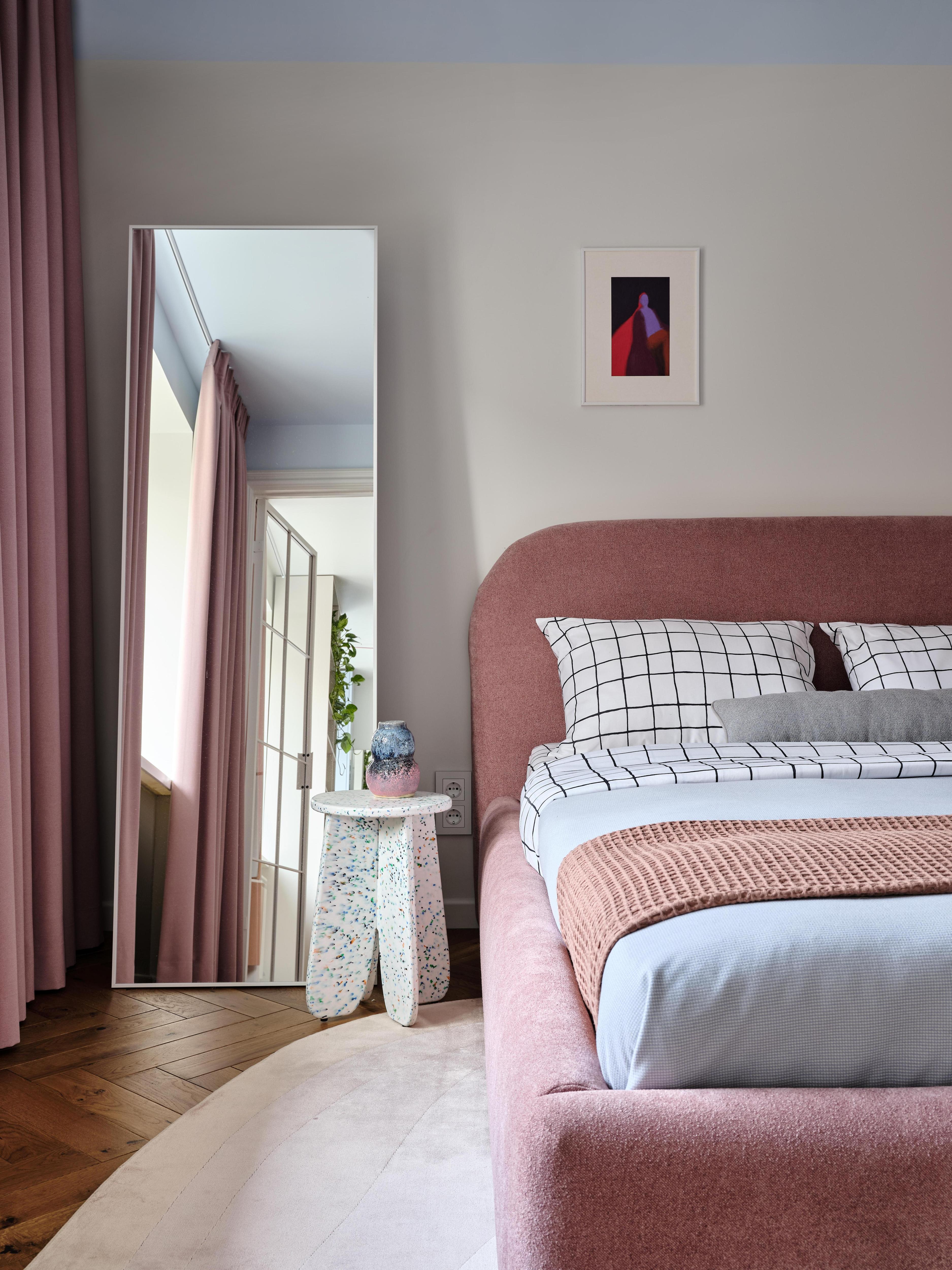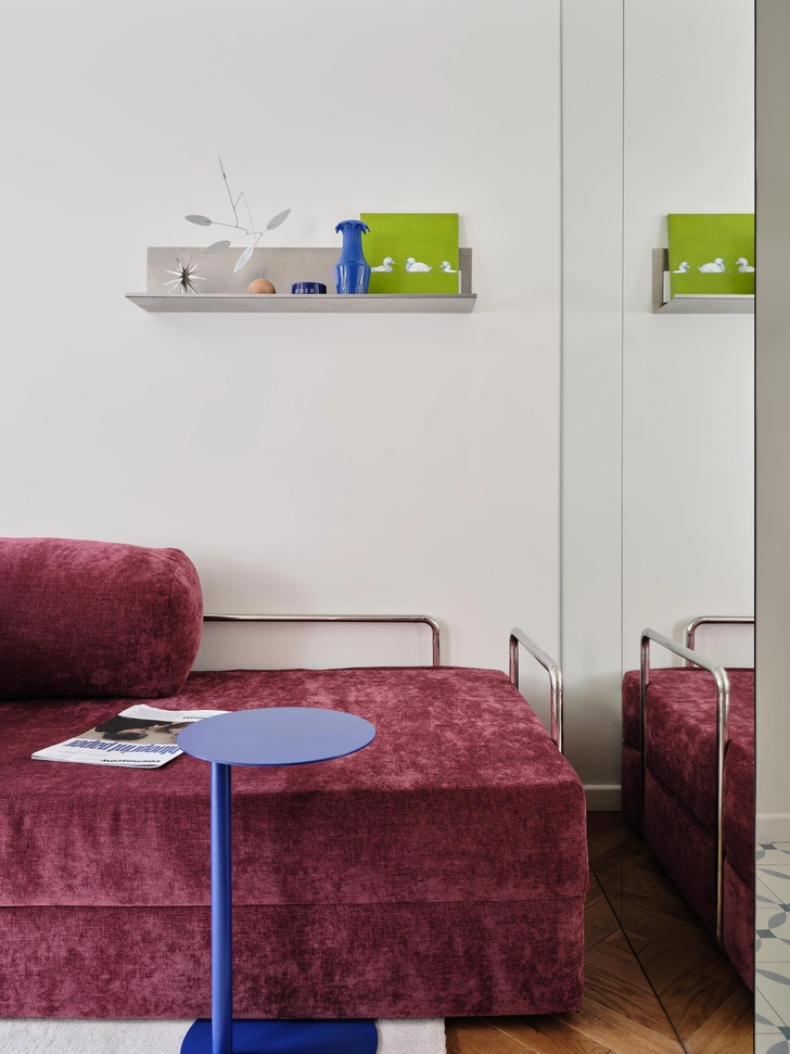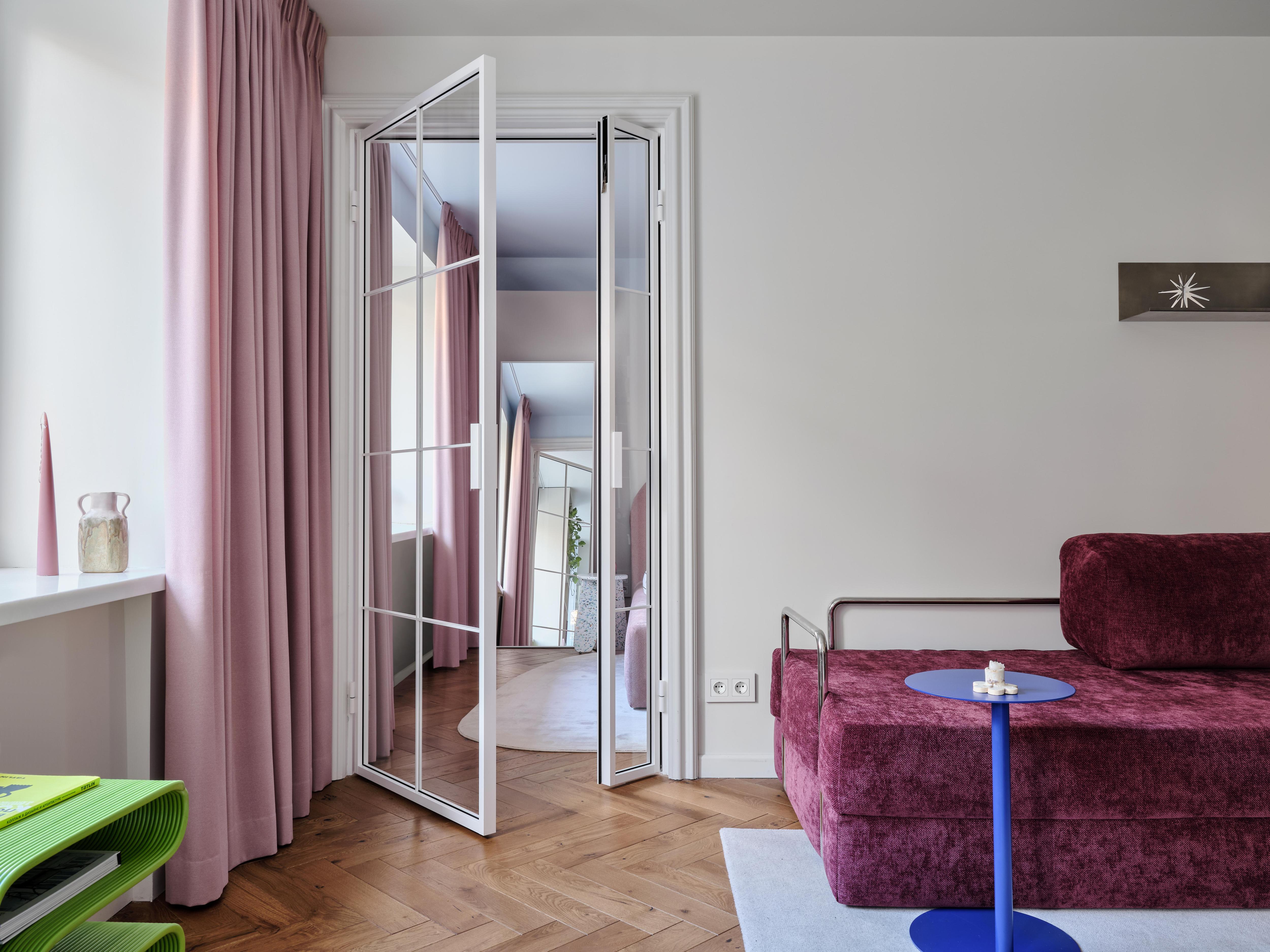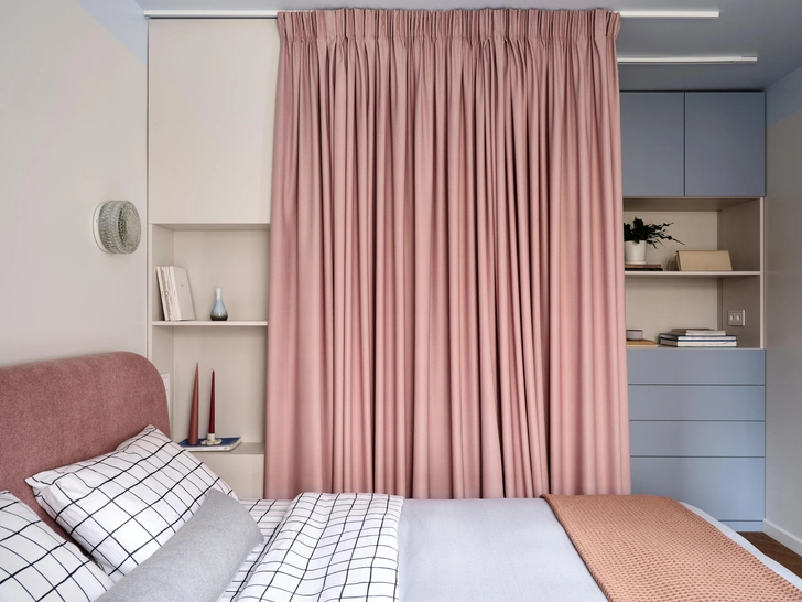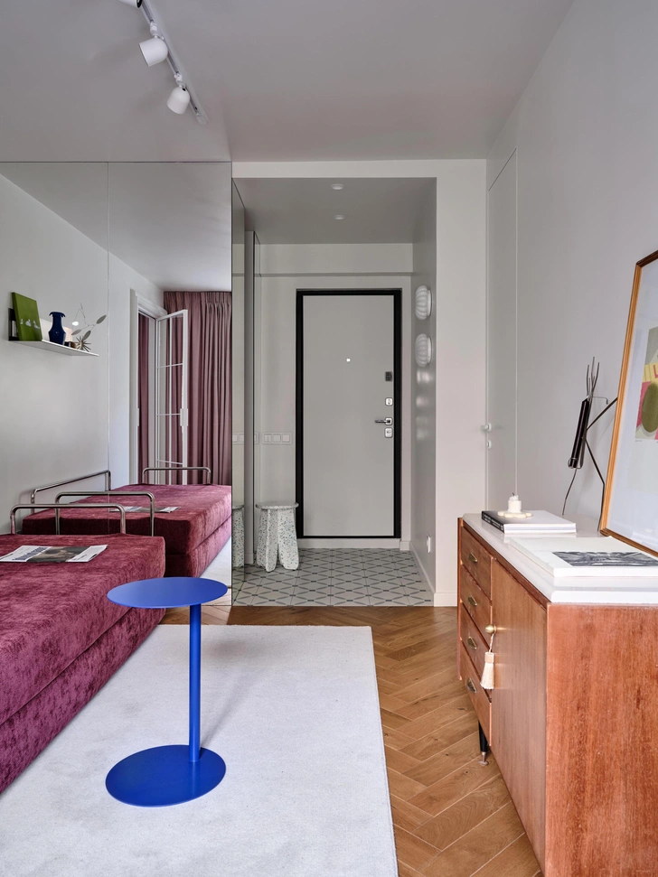 Жизнь у заказчицы насыщенная: это подчеркивают и «дофаминовые» акценты (темно-фуксиевый диван, цветная затирка на кухне, голубой гарнитур, розовая кровать), и новая планировка. Легко переходить из одной зоны в другую, легко пользоваться компактной кухней, легко поддерживать порядок.