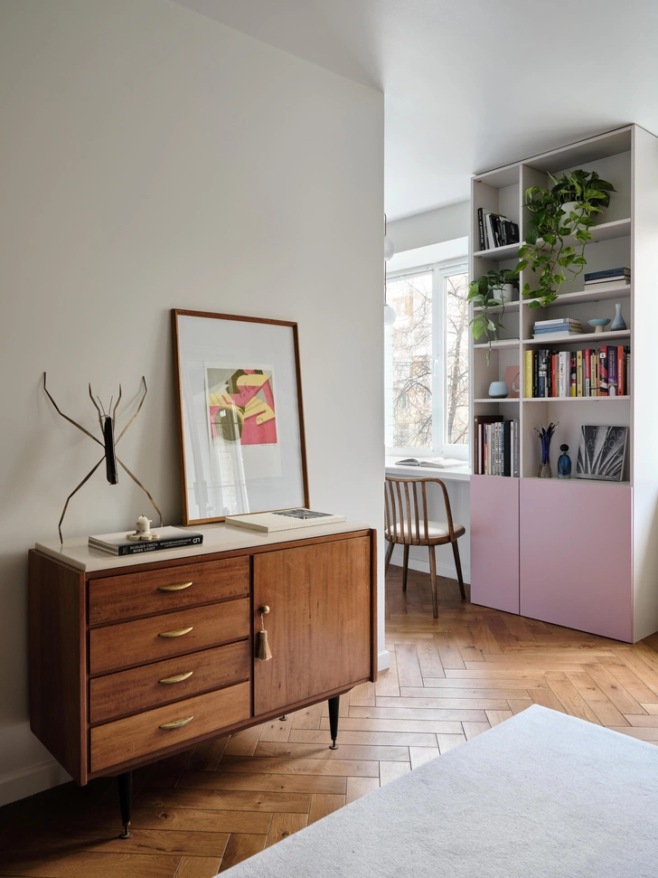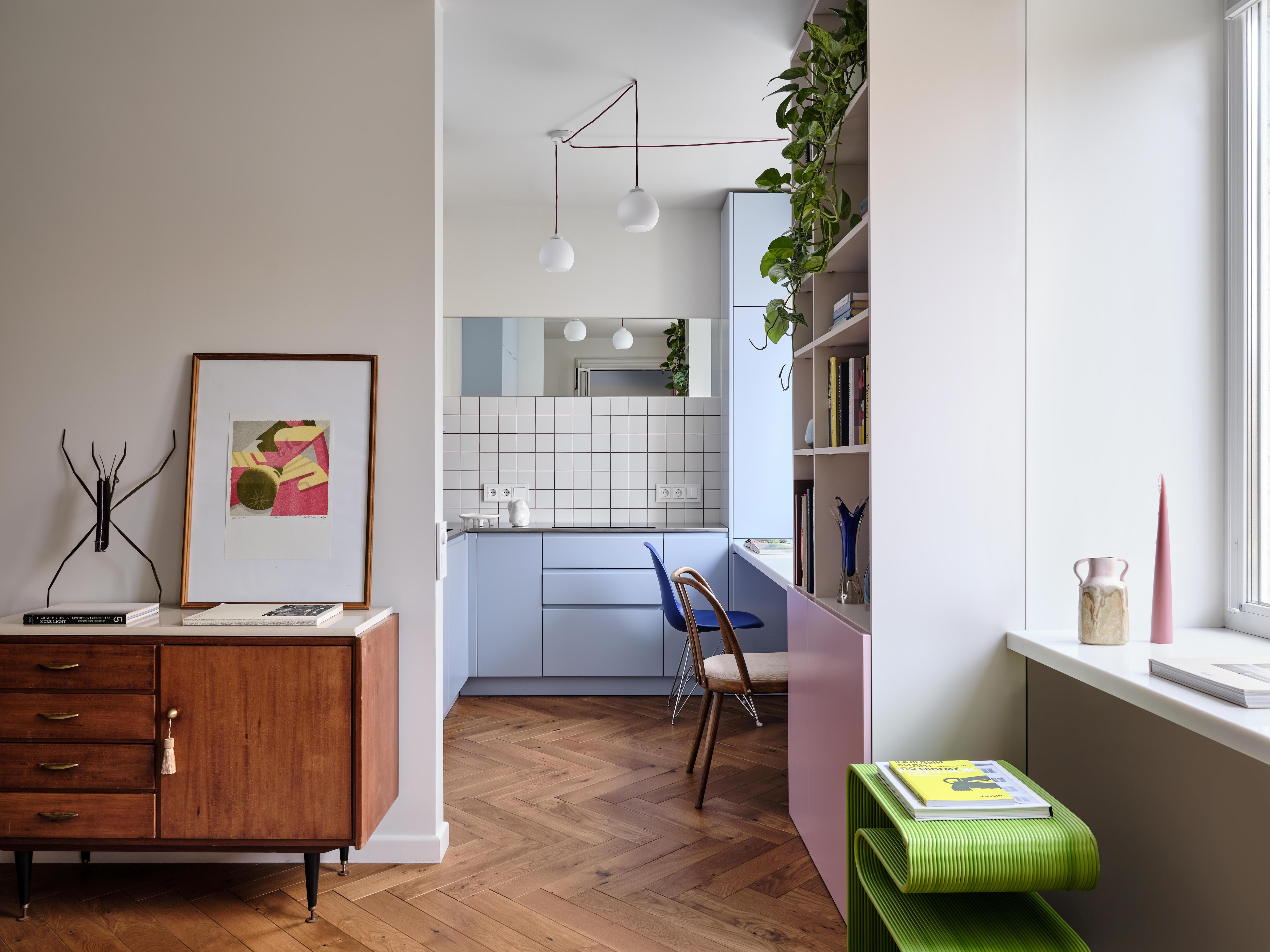 А главное — как бы просто это ни звучало — в каждой комнате просто приятно находиться: на кухне можно позавтракать, наблюдая из окна за прохожими, или почитать книгу за кофе, поработать. Далеко за книгами ходить не надо — стеллаж стоит прямо у стола. Такой мягкий переход из одной зоны в другую делает пространство целостным, площадь используется с умом.