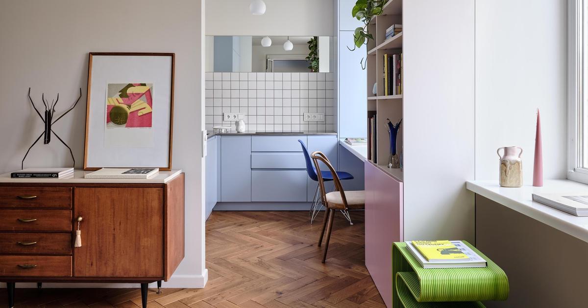 Квартира находится в старом фонде на улице Лизы Чайкиной — в одном из тихих зеленых районов Москвы. Здесь живет архитектор Алена Миллер, интерьер для нее спроектировала подруга — архитектор и дизайнер Елена Хламова. Площадь достаточно небольшая, но этого будто не ощущается: светлая, но не безликая отделка, яркие акценты, анфиладная планировка — стены и потолки не давят, и квартира действительно кажется шире.