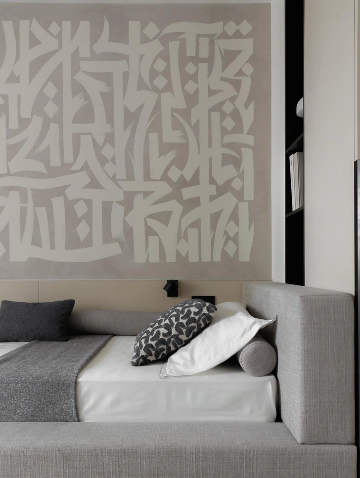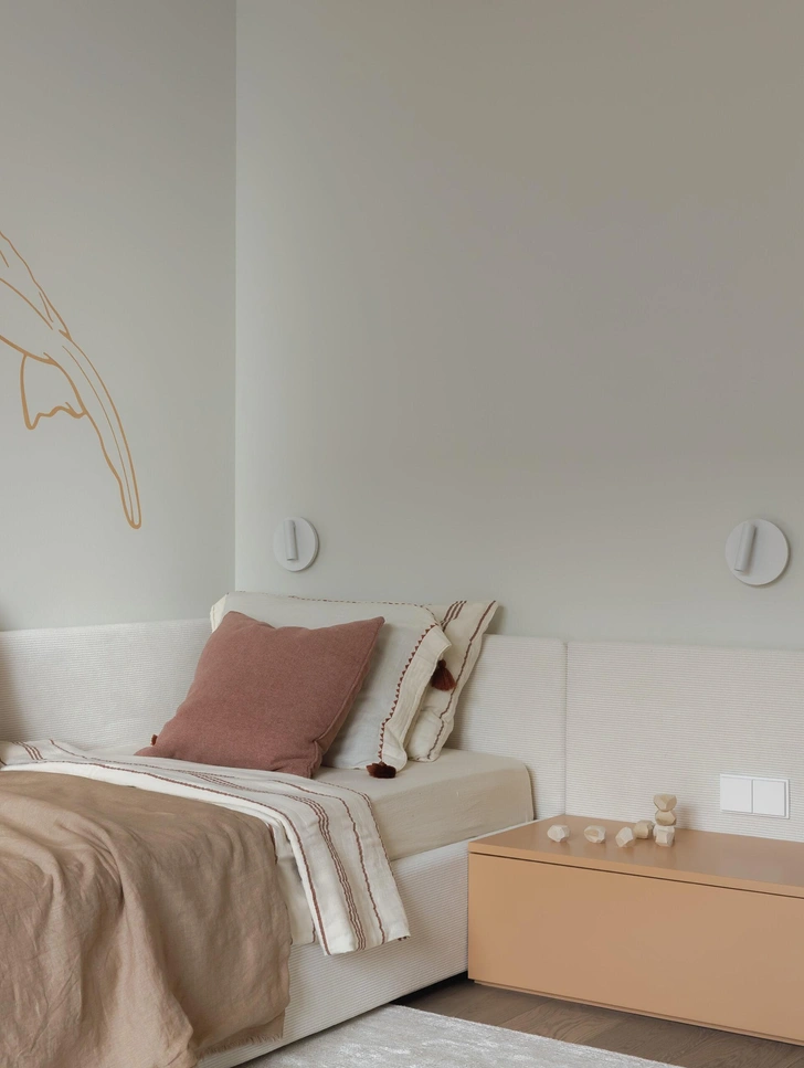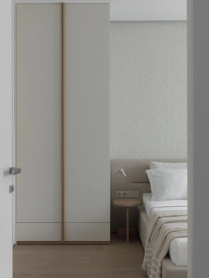 В мастер-спальне тоже спокойная гамма, но с интересной фактурной стеной — она отделана декоративными панелями с имитацией натурального камня. Здесь мы особенно старались продумать хранение, расположили его симметрично с двух сторон кровати, чтобы у каждого было свое место.