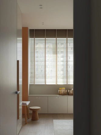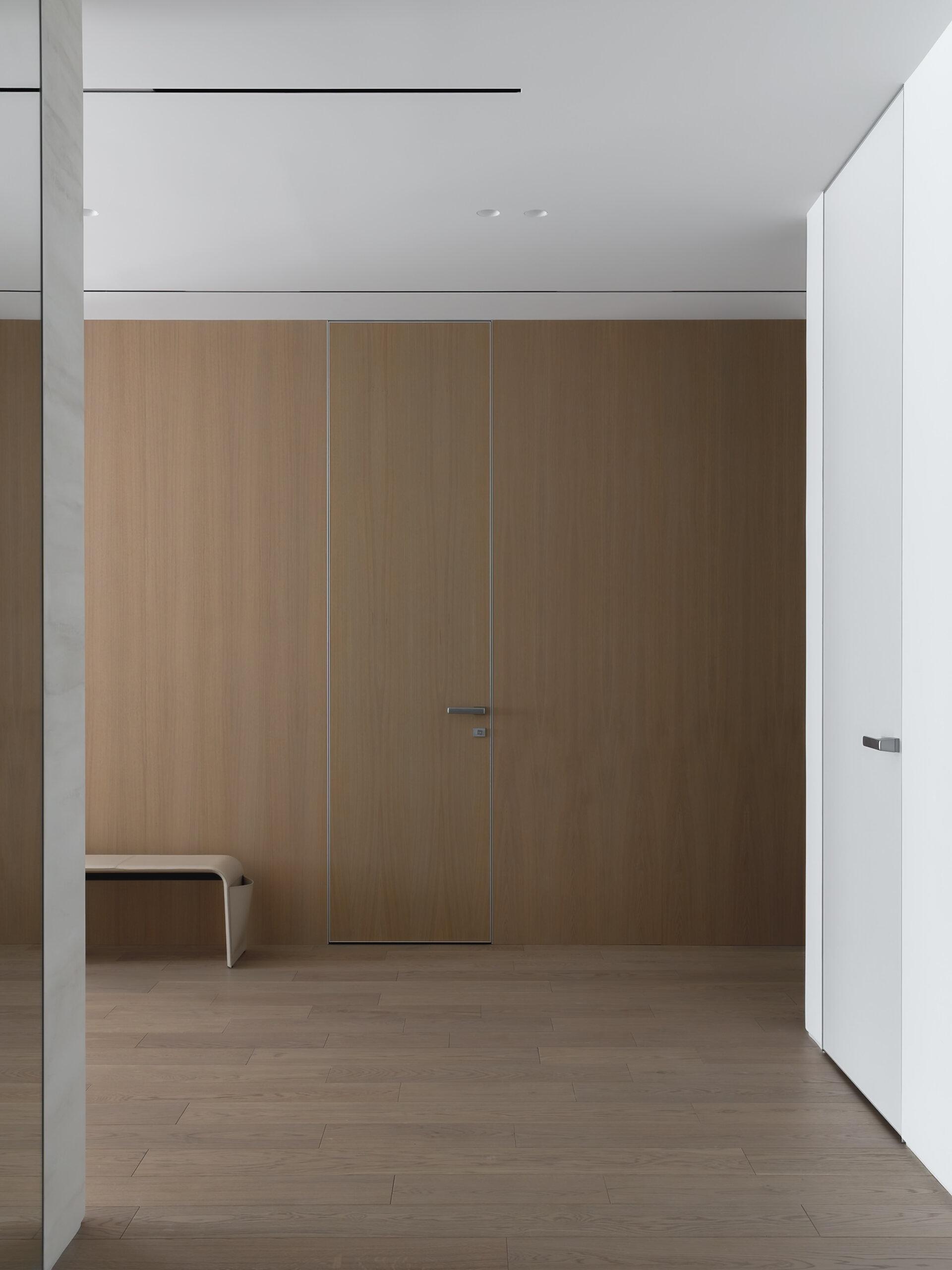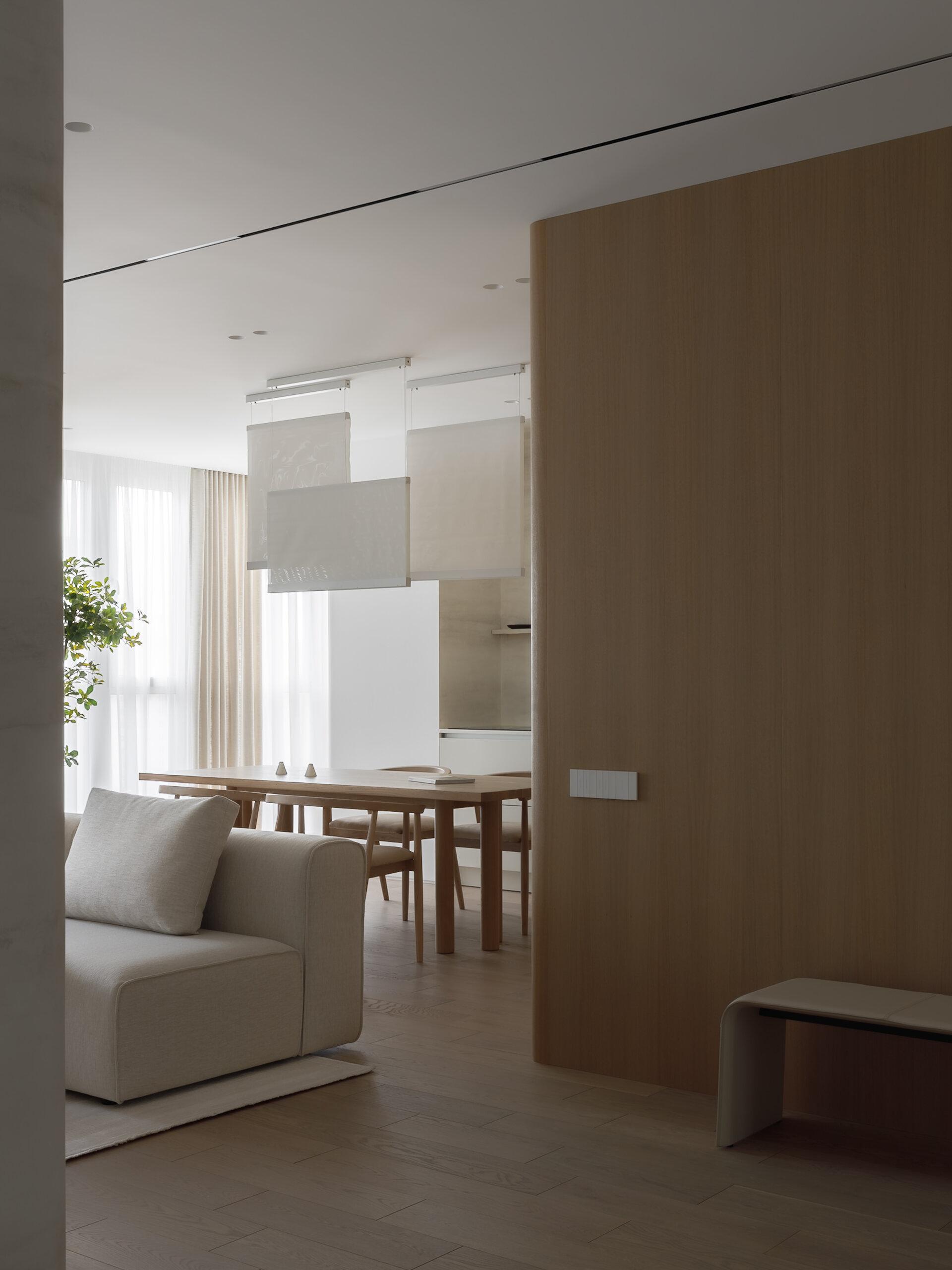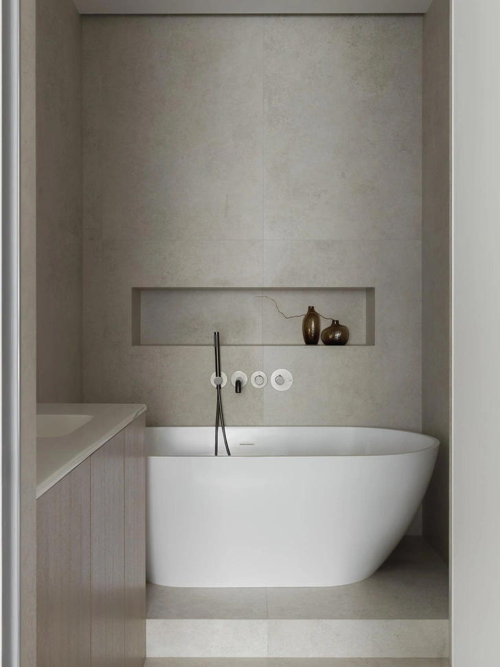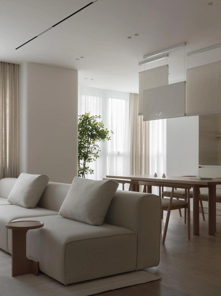 В квартире много света — мы решили подчеркнуть это ощущение свободы и воздушности, положив в основу интерьера софт-минимализм. Нейтральная цветовая палитра построена на тактильных нюансах, их фактурность делает интерьер живым и объемным. В отделке мы использовали натуральное дерево и декоративную штукатурку, имитирующую текстуру травертина. А еще в этом проекте у нас много радиусных элементов, которые добавляют пространству пластичности и мягкости.