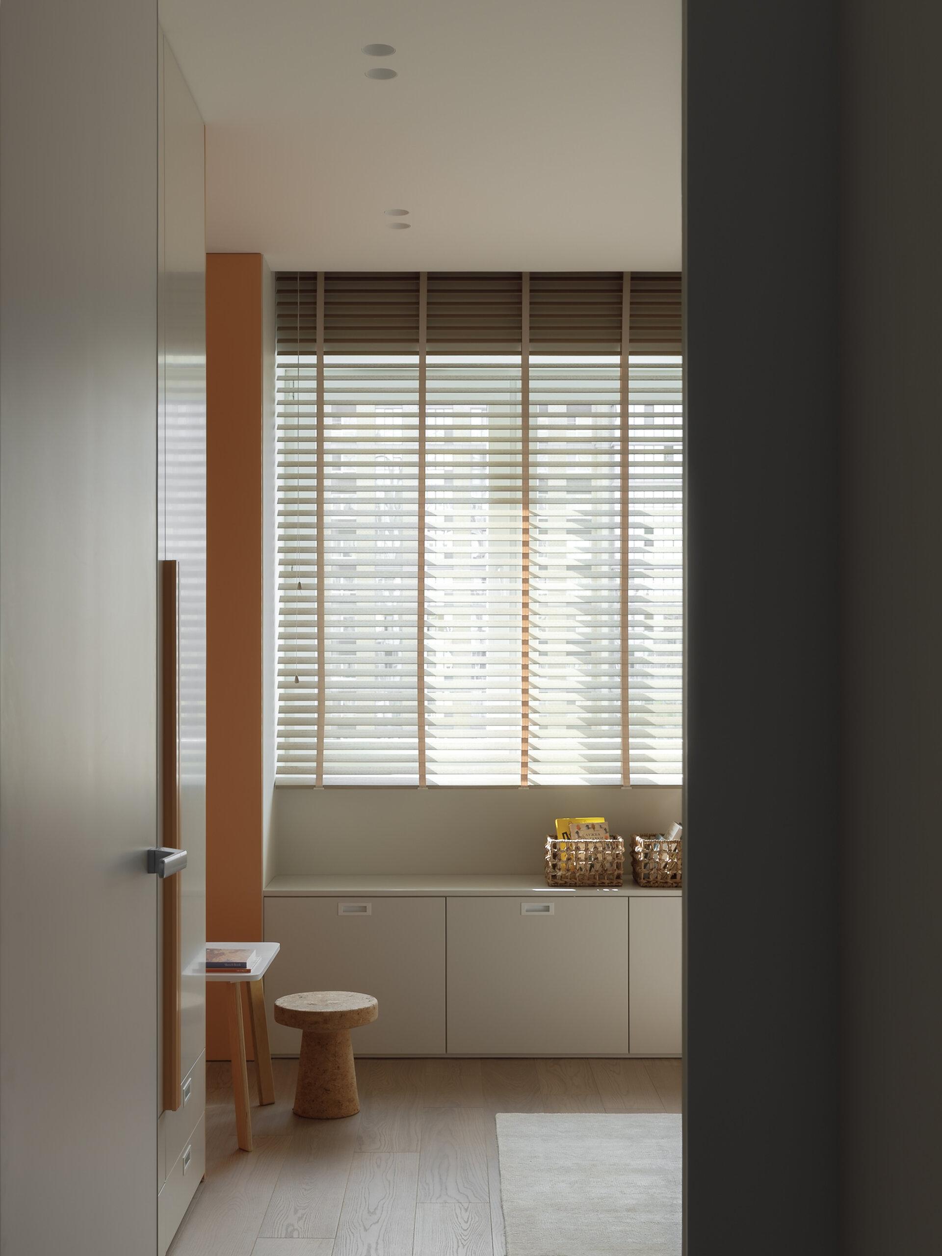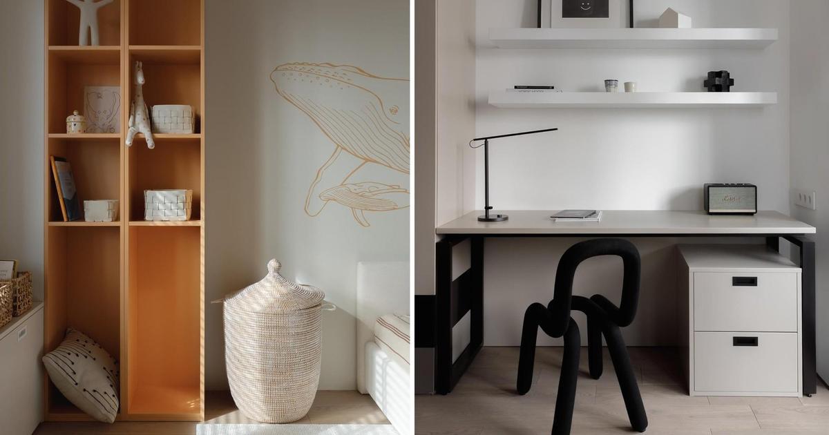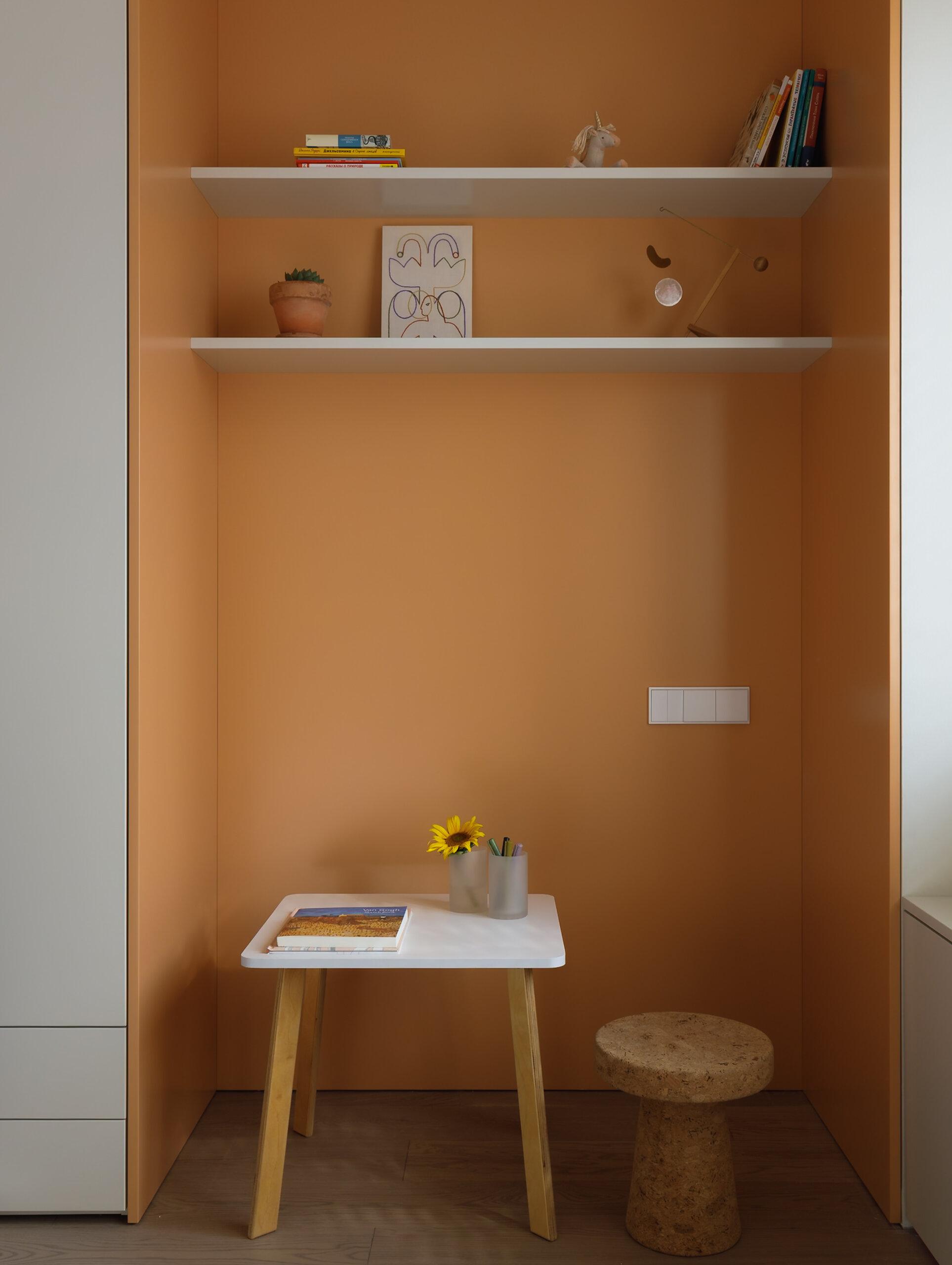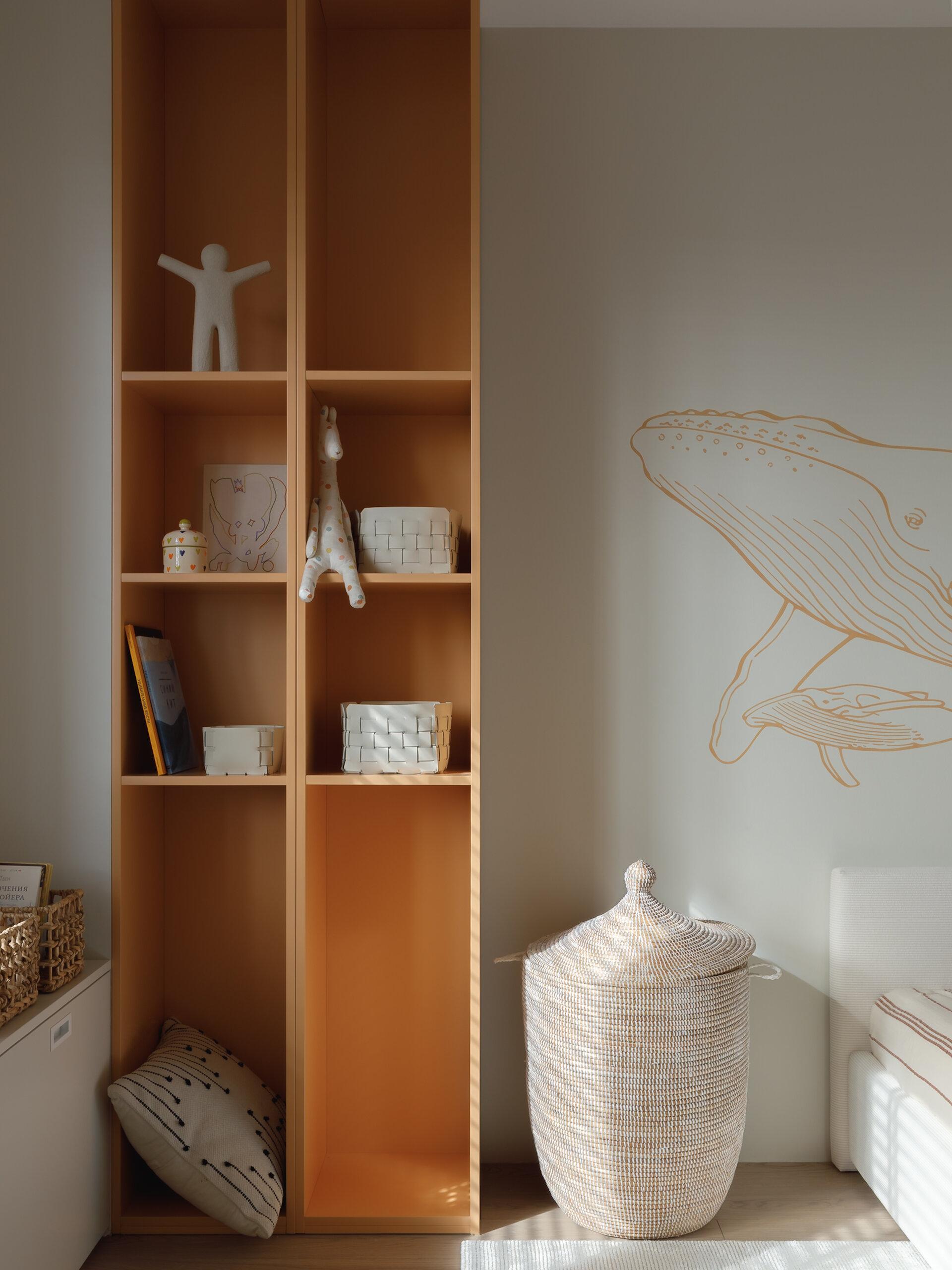 Вторая детская получилась более солнечной — кроме белого здесь очень много нежно-оранжевого. Под окном сделали удобные выдвижные ящики, рядом поставили большой стеллаж для игрушек и книг, а напротив оставили небольшую свободную нишу, где сейчас стоит столик. Малыш только родился, поэтому большой стол ему пока точно не нужен, но в будущем он сюда точно поместится, потому что нишу мы рассчитали «на вырост». В общем, в комнате есть все необходимое — ее можно будет легко менять с годами.