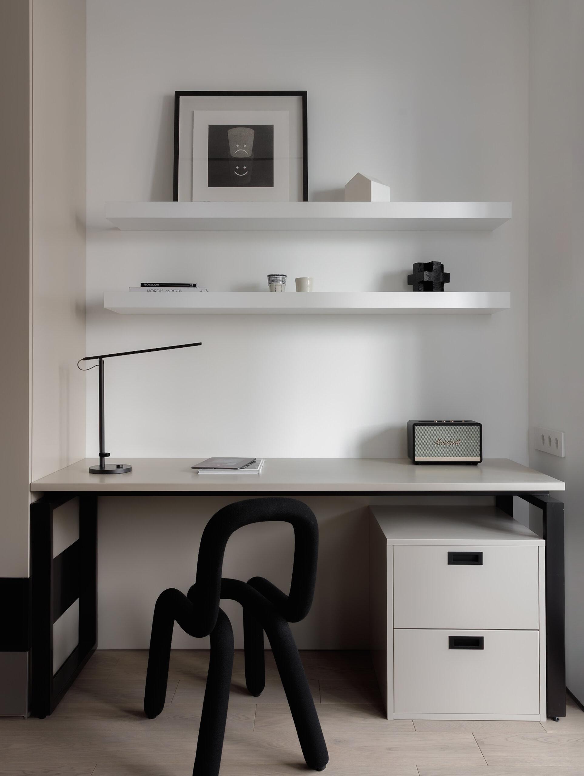 Необычной получилась комната старшего сына — ее бы я особенно выделила: черные детали, акцентная стена над кроватью… Здесь были свои сложные вопросы, которые мы аккуратно решили: у кровати было аж две колонны, и чтобы составить из них целостную композицию, мы встроили систему хранения и сделали подиум.
