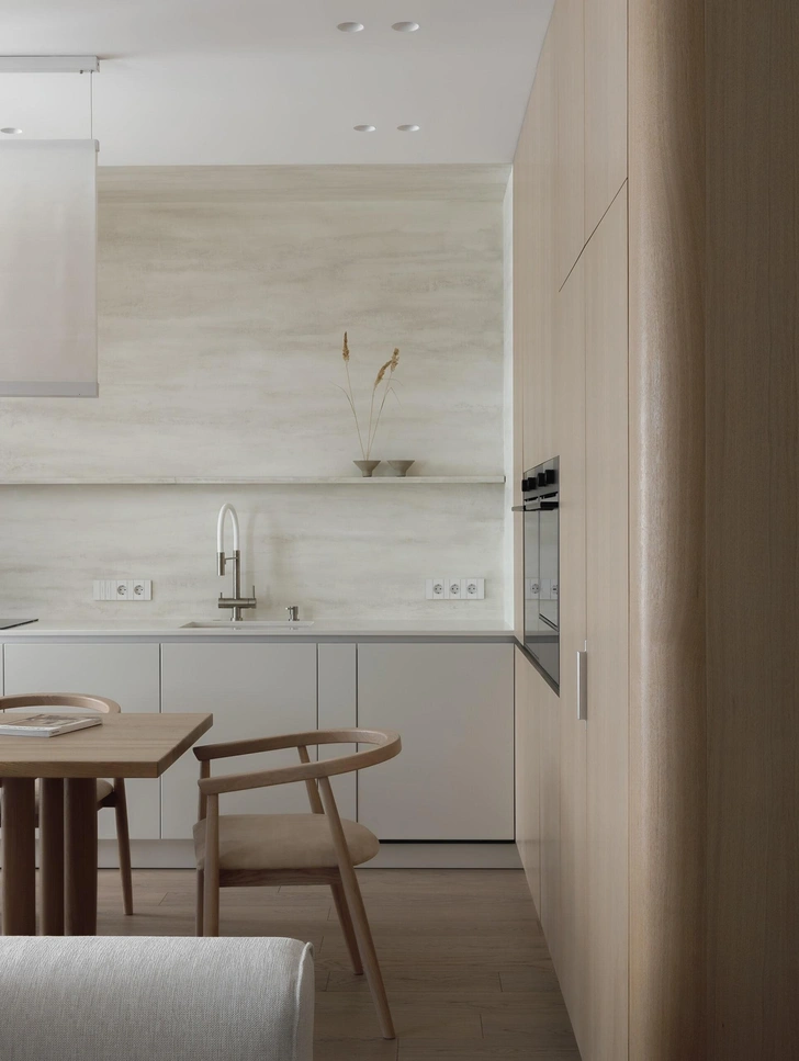 Несмотря на свою лаконичность, кухня-гостиная не выглядит «стерильно» — наоборот, очень уютно. Все благодаря скругленным углам, дереву и плавным формам. Над рабочей поверхностью кухни мы не повесили шкафы, вместо них оштукатурили стену под травертин. Всю встроенную технику мы собрали с правой стороны и спрятали под деревянными фасадами, которые плавно переходят в стеновые панели.