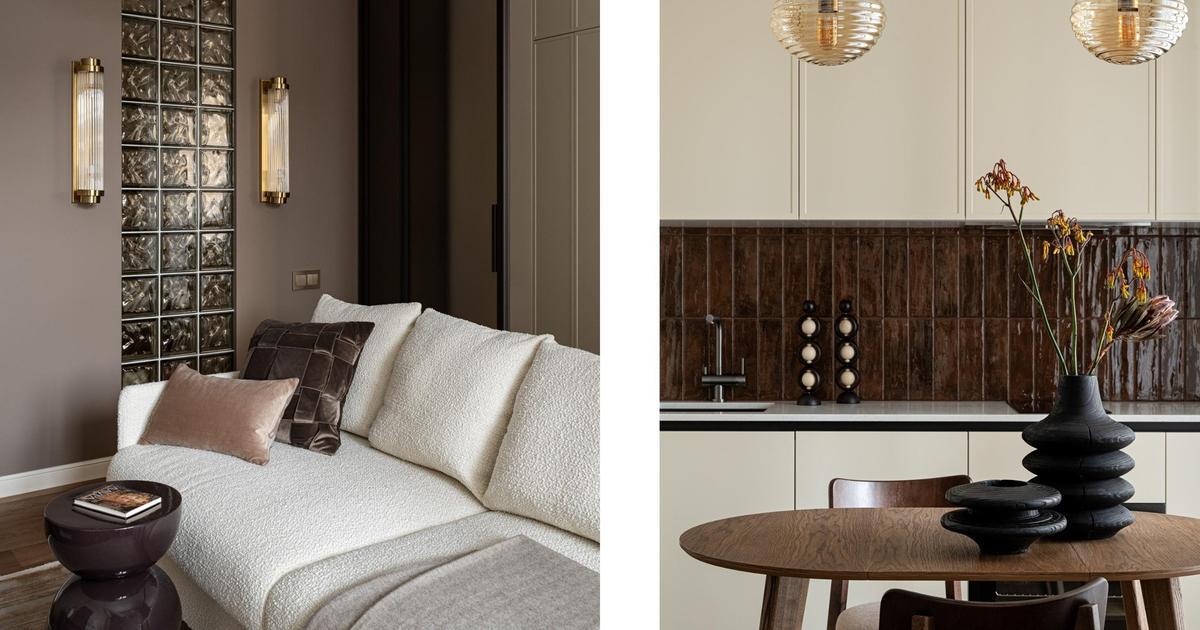 На кухне фасады молочного цвета приятно контрастируют с фартуком, где вертикально уложена фактурная плитка шоколадного цвета. В центре — стол из массива дуба, который украсили эффектные вазы из обожженного дерева.