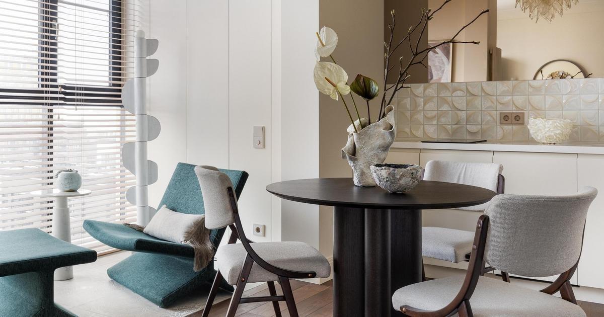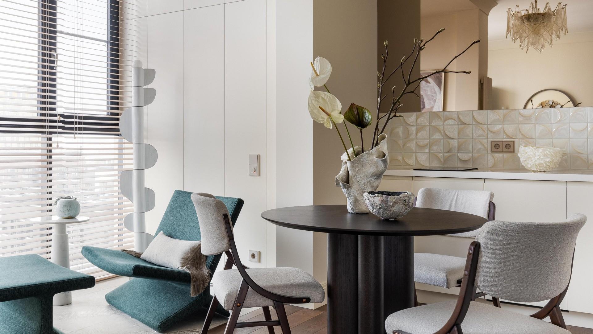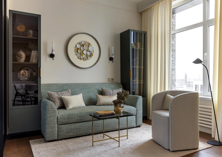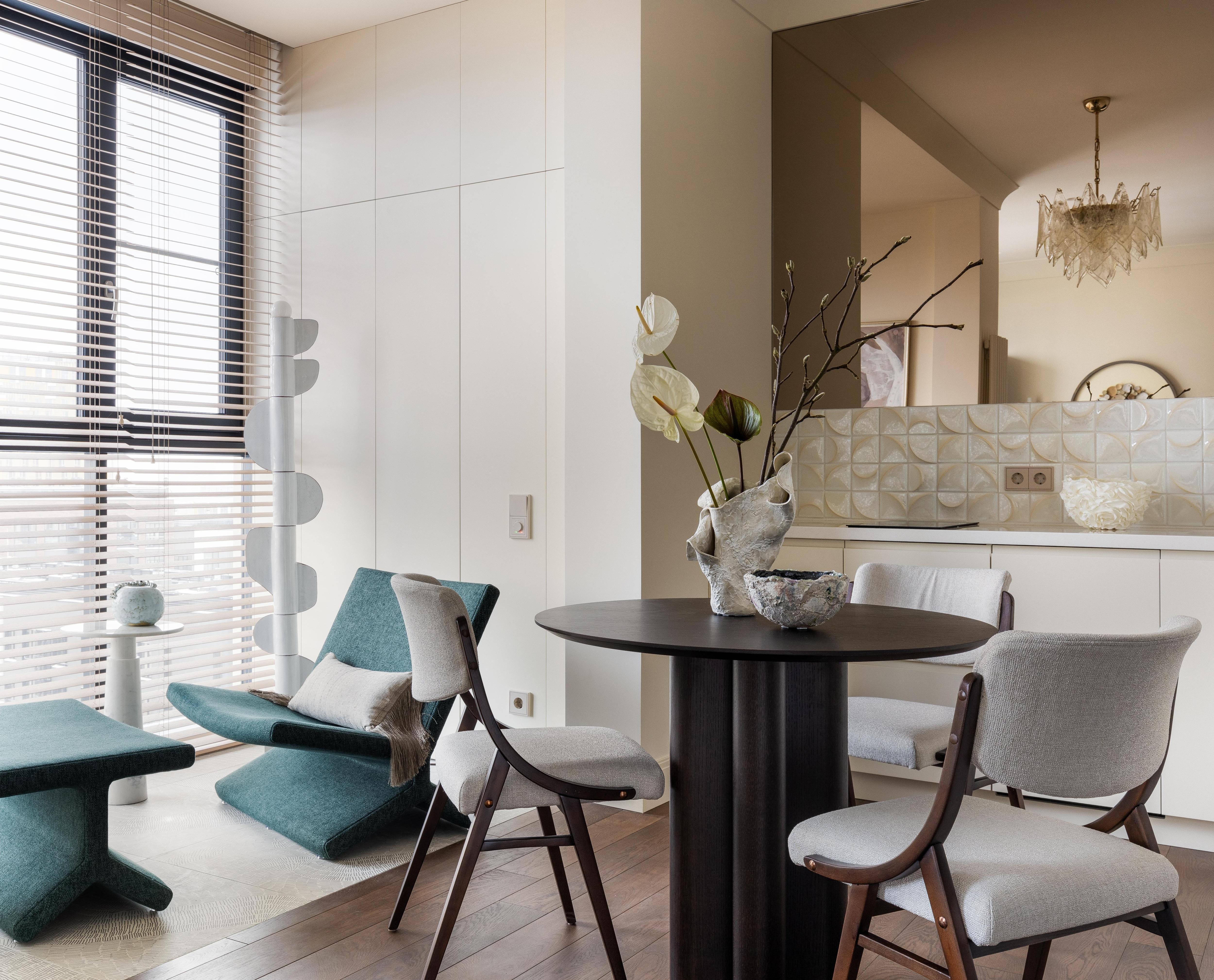 Светлую базовую палитру разбавили необычными предметами: мне было важно, чтобы они были оригинальными и были подобраны не просто так. Например, итальянская люстра фабрики La Murrina 1970-х годов — будто сокровище с морского дна. Она стала нашим первым предметом, отправной точкой интерьера.