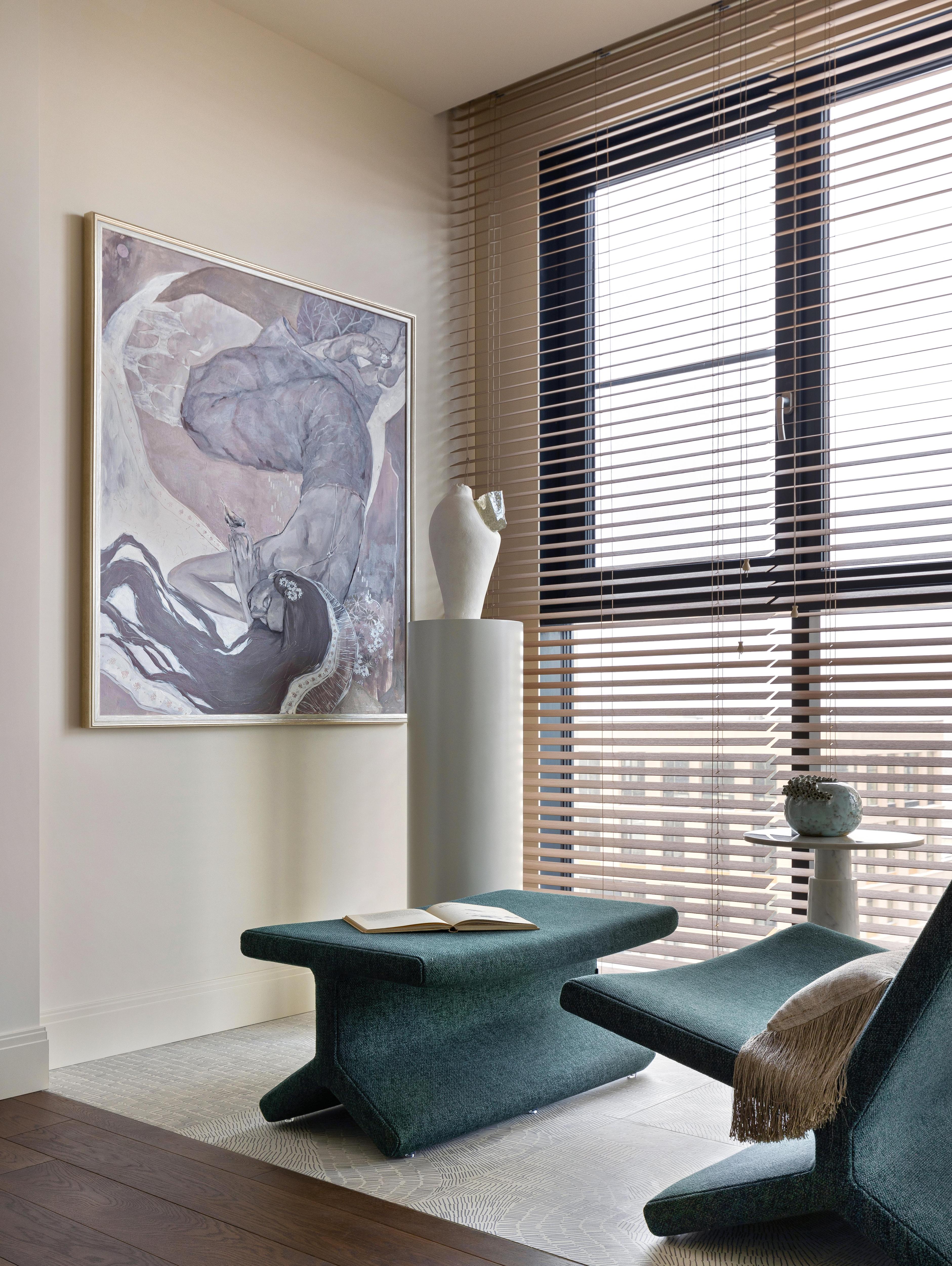 Лоджию украшает кресло от Bino home — я приметила его несколько лет назад, на выставке предметного дизайна, и решила, наконец, использовать. Его изумрудный цвет и форма, напоминающая шезлонг, идеально вписались в концепцию. У нас получилось место, чтобы любоваться закатом и видом на реку.