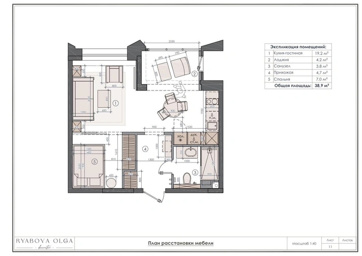 План квартиры 38,9 м². Проект Ольги Рябовой.