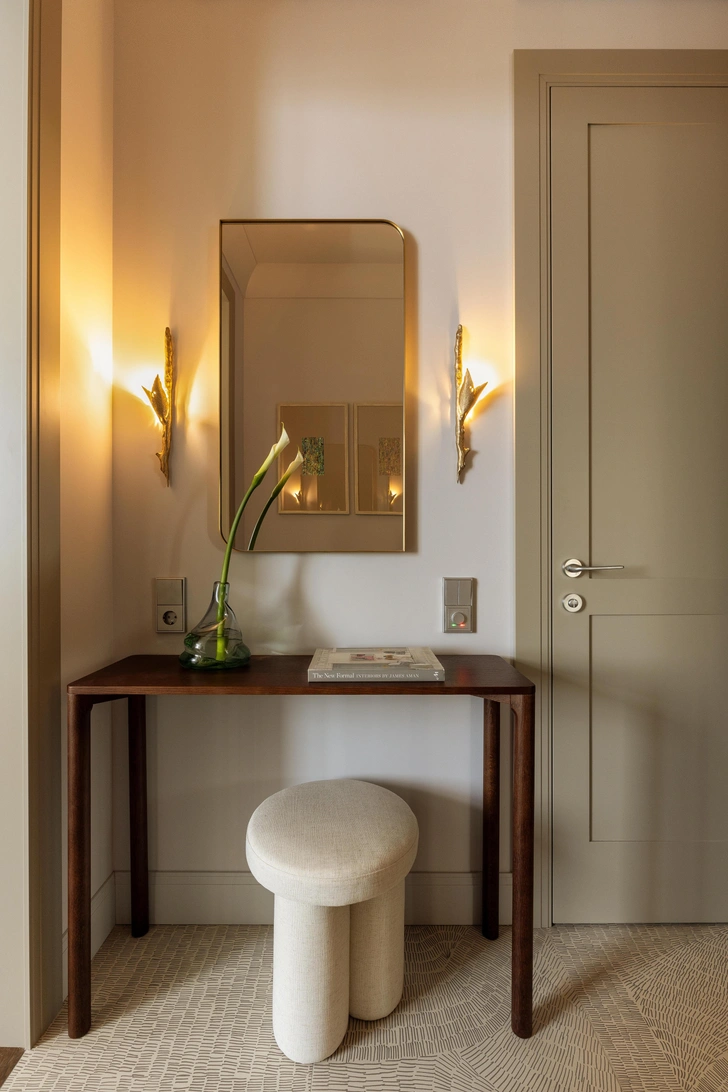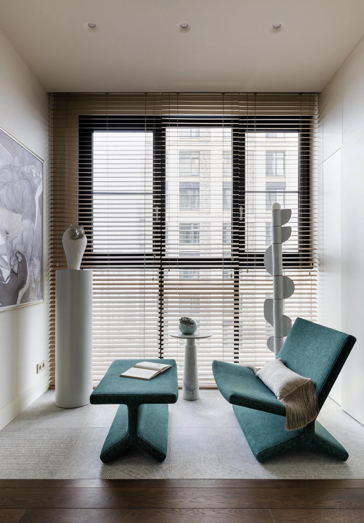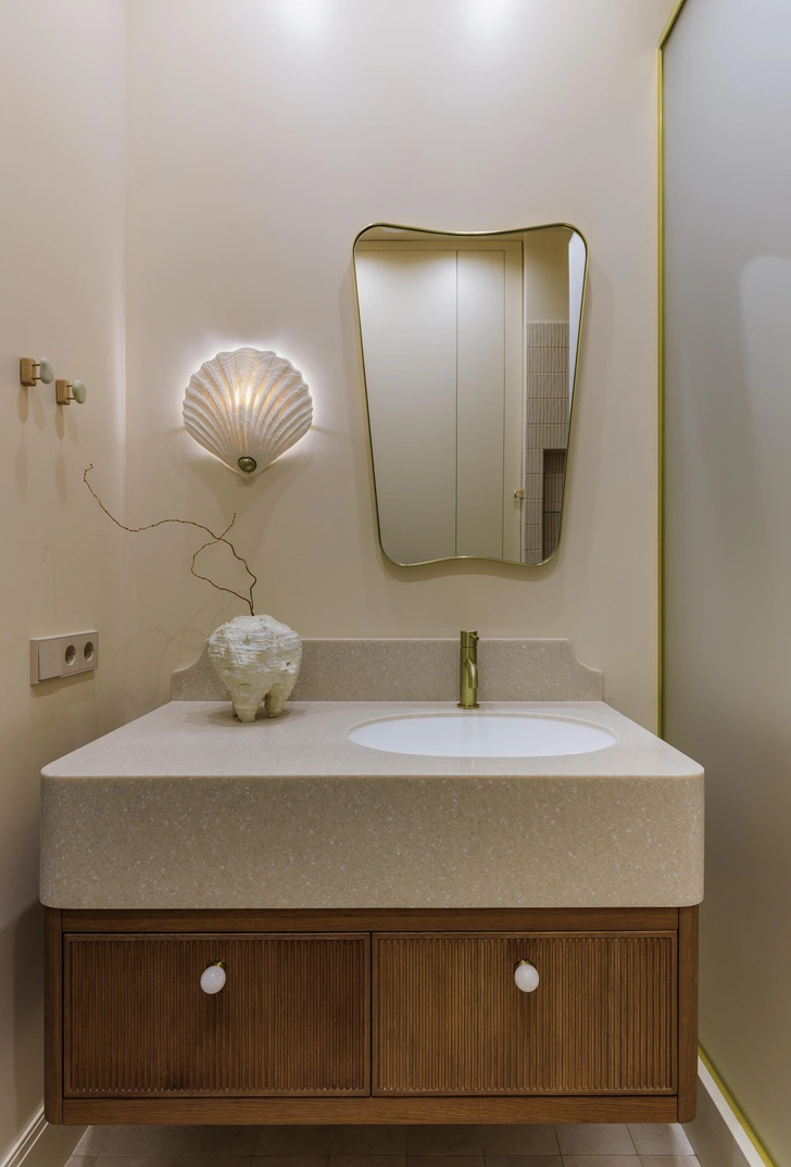 Запрос был довольно стандартным — бежевый интерьер. Но после встречи я поняла, что девушке нужно нечто большее, чем просто место для редких визитов между деловыми поездками. Так родилась концепция: за основу взяли ощущение тихого моря — оно умиротворяющее, но при этом глубокое и многогранное.