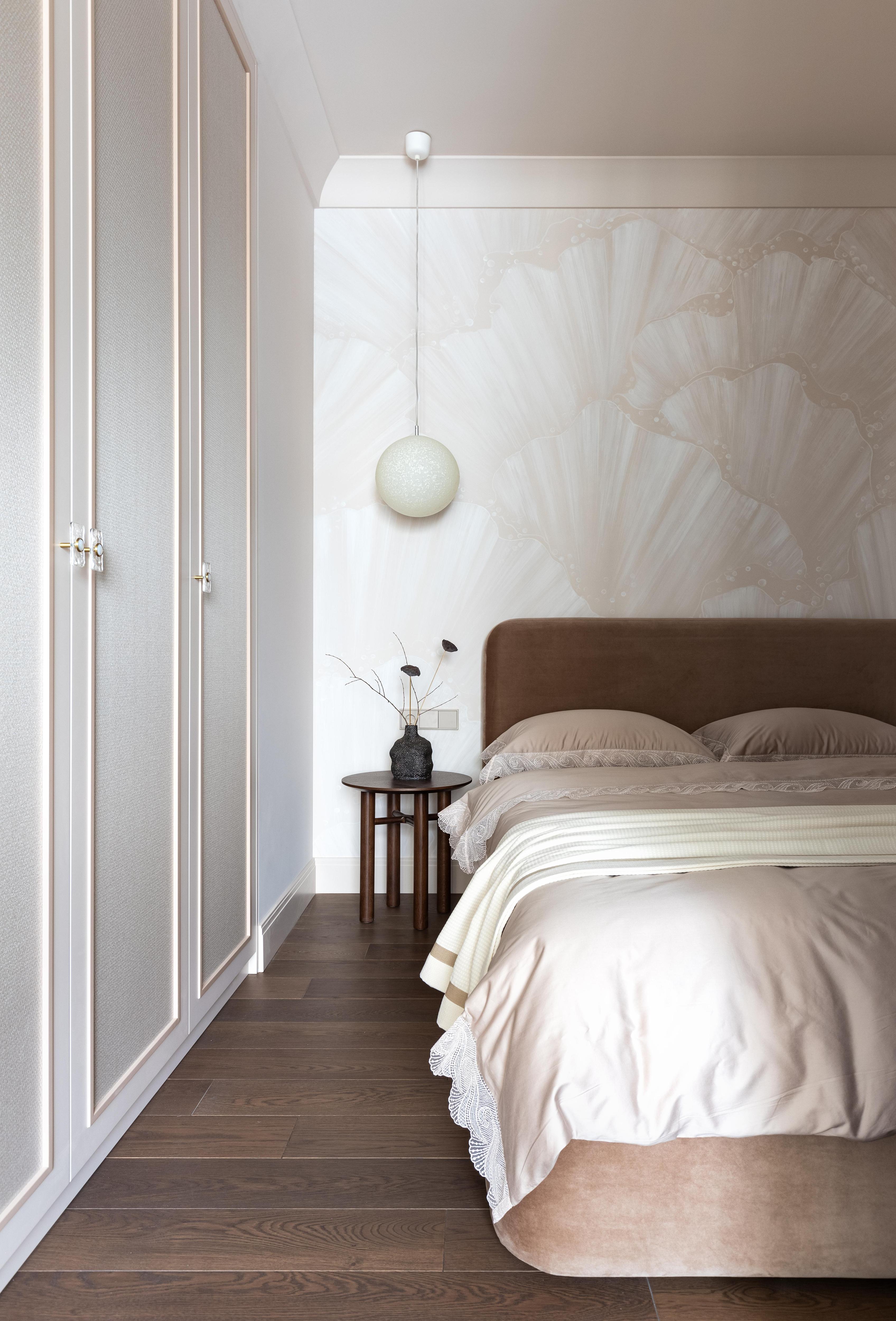 Особое внимание я уделила спальне. Настенная роспись с морскими раковинами создала атмосферу для отдыха. Ее дополняет постельное белье с нежным кружевом, его мы тоже шили на заказ. Продумана каждая деталь — мне особенно нравятся мебельные ручки из стекла и перламутра. Финальным штрихом стал подвесной светильник, похожий на жемчужину.