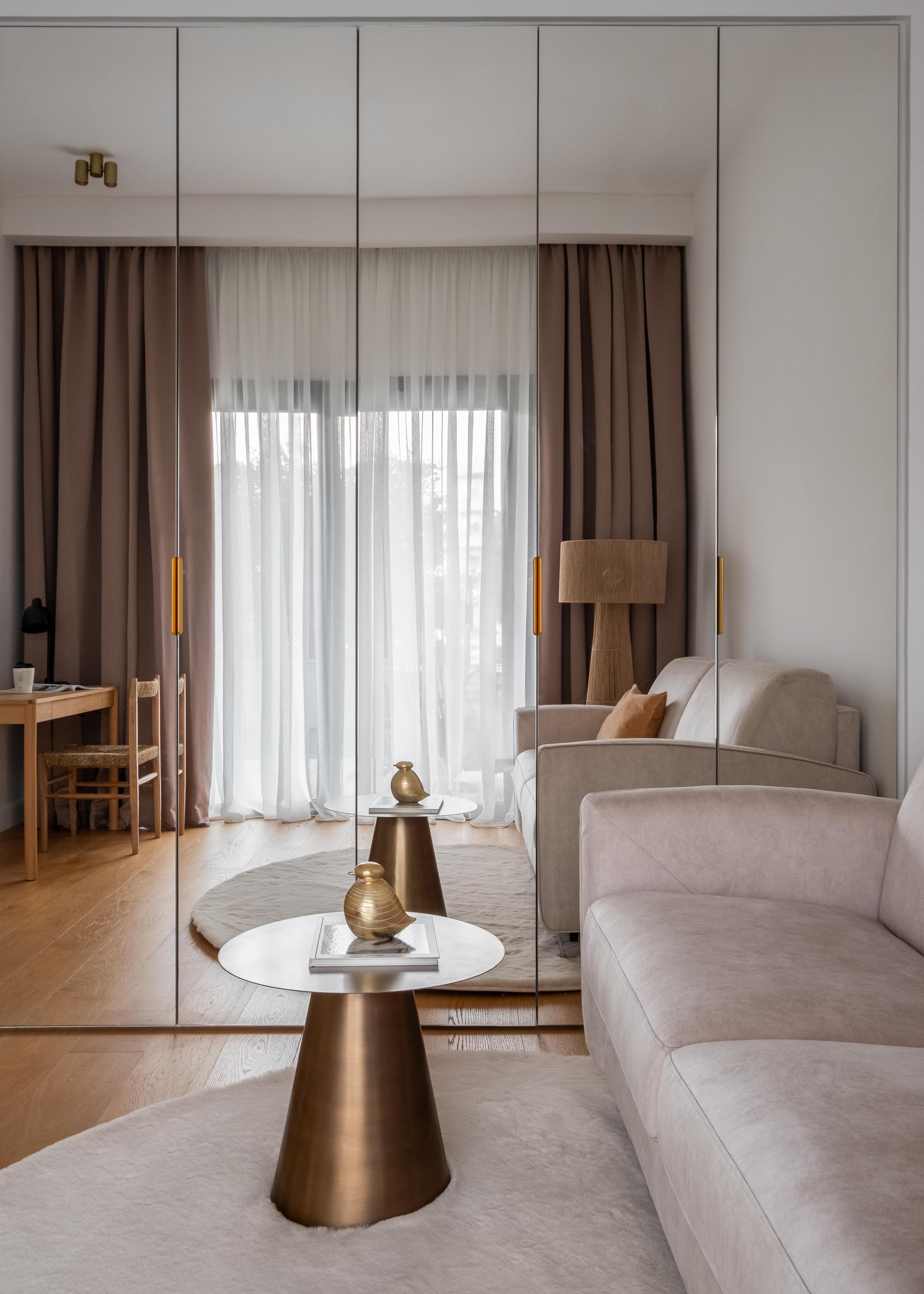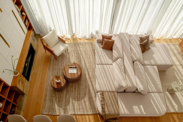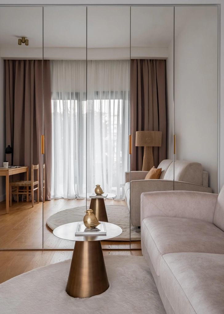 Пространство было непростым: гостиная со вторым светом, несмотря на панорамные окна, из-за скромной площади напоминала «колодец», лишенный домашнего тепла. Повсюду царил стерильный белый цвет, не хватало продуманных систем хранения, а спальни были довольно тесными. Чтобы не выходить за рамки бюджета, мы сделали ставку на декоративные, а не на дорогостоящие строительные приемы: игра фактур, сложная многослойная колористика, тщательно подобранная мебель и текстиль.