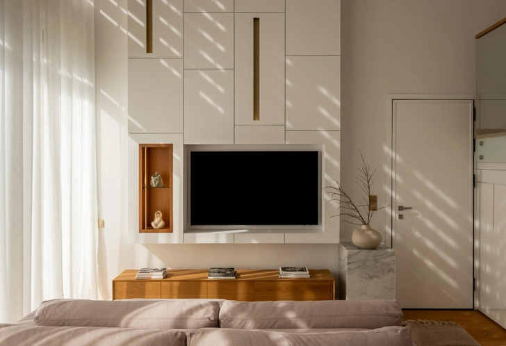 Перед нами были апартаменты с отделкой white box, которые предстояло наполнить характером и теплом — 108 м2 жилой зоны и 65 м2 террасы. Заказчица — хрупкая и чуткая художница — поставила вдохновляющую, но сложную задачу: создать в интерьере атмосферу солнечного Кипра, его уют и особое ощущение простора. Основой палитры стали не холодные оттенки серого, а цвета самого острова. Теплый песок пляжей — в штукатурке стен, мебели и цвете плитки. Приглушенная терракота черепичных крыш старых домов — в акцентных деталях, крупноформатном керамограните и текстиле.
