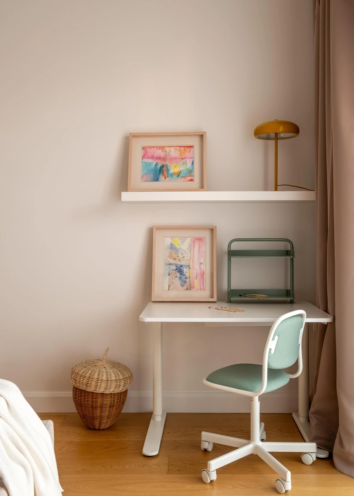 Рабочий стол, кресло, полки, IKEA. Картины из личной коллекции заказчицы. Освещение, One light.
