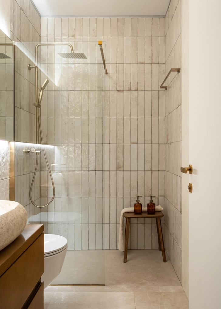 Сантеника, Аquagrif. Глазурованная плитка Carmen beige, Bestile. Аксессуары для ванных, Hansgrohe. Табурет, Zara home, Освещение, One light.