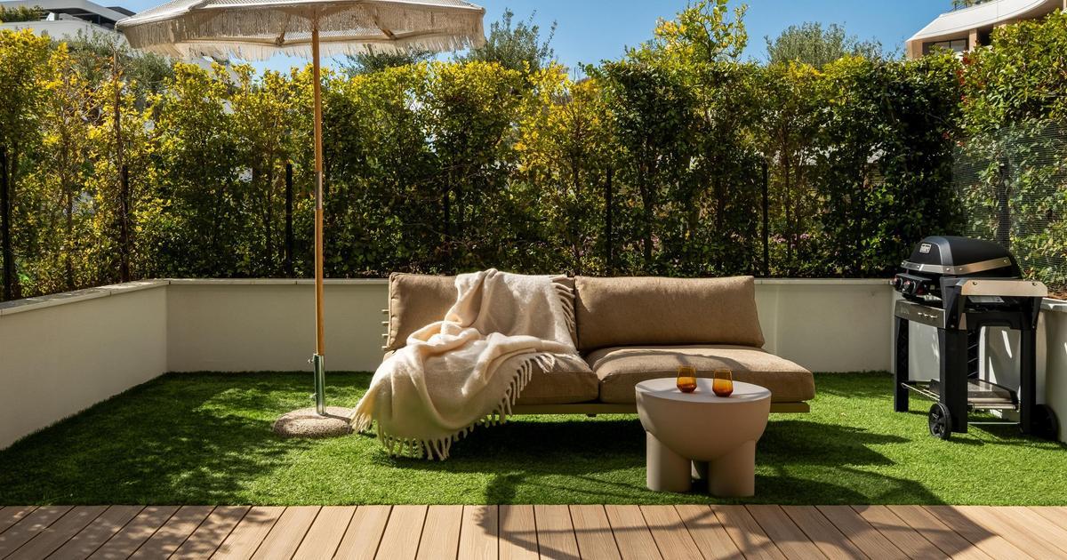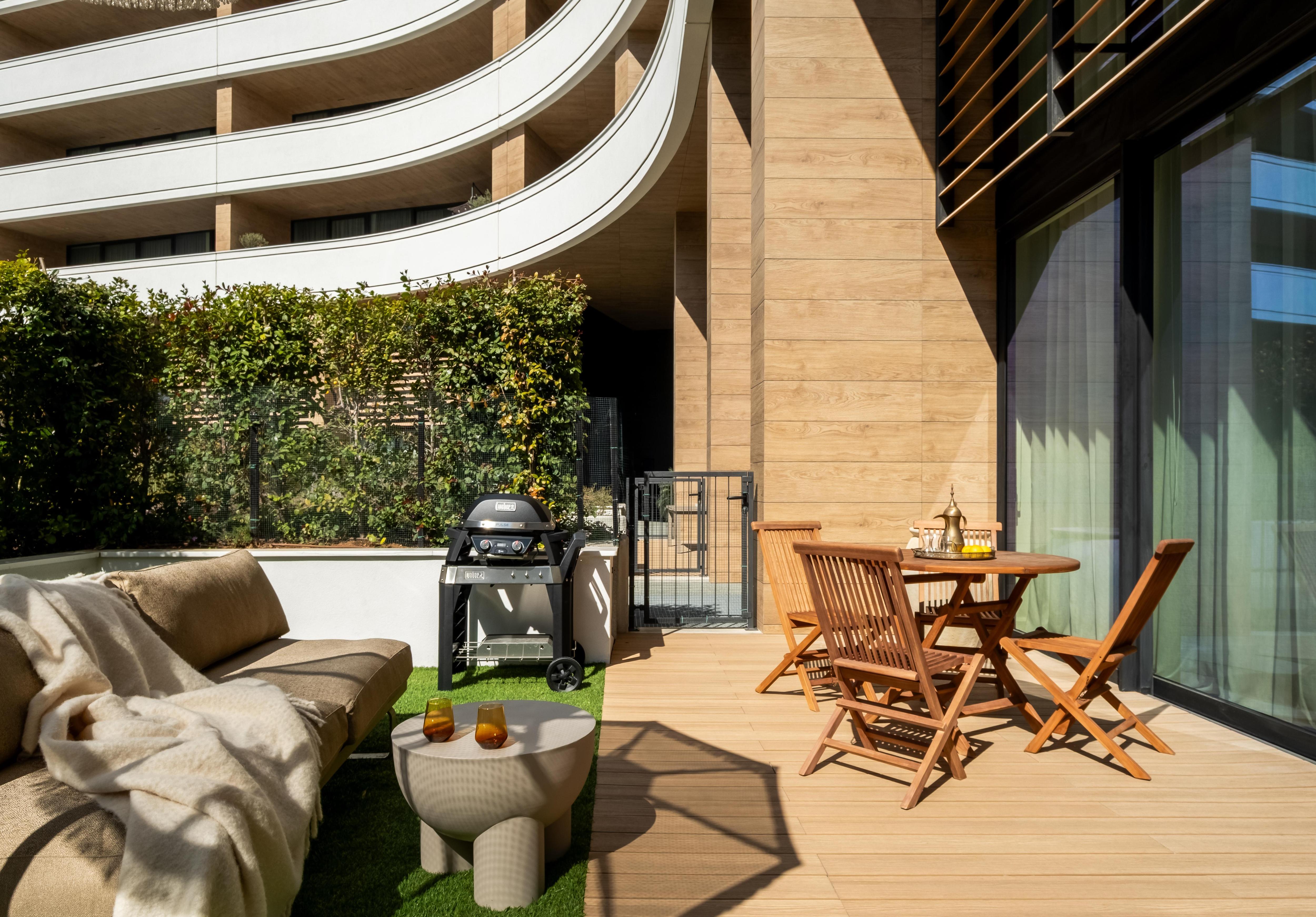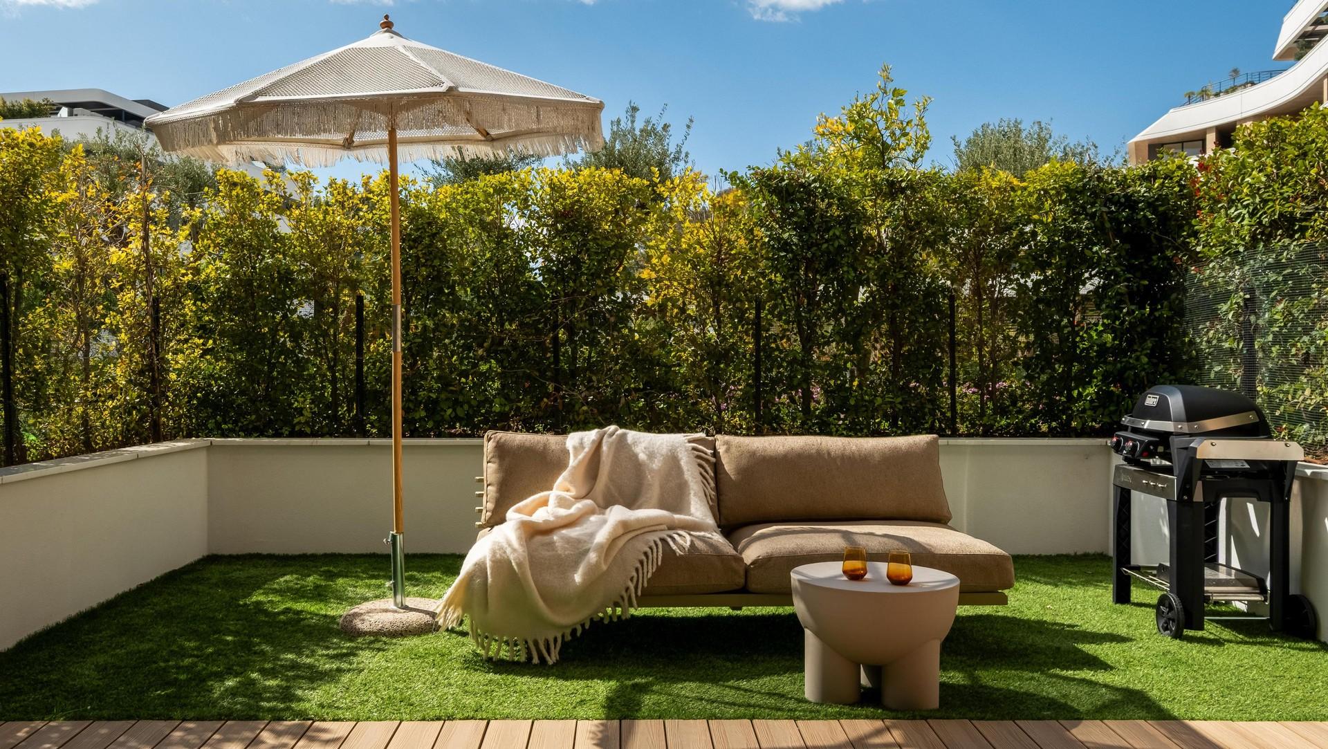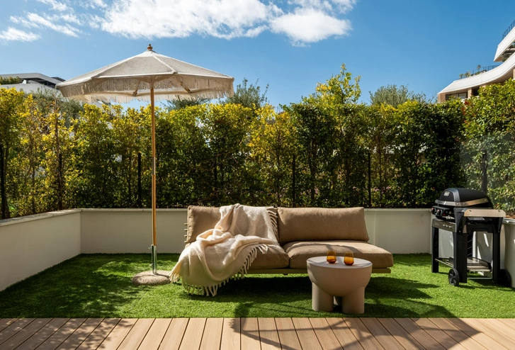 На первом этаже расположились кабинет, ванная комната, кухня-ниша, гостиная. На втором этаже — мастер-блок со спальней, ванной и детской сына с отдельной ванной. Квартира проходная, с двух сторон есть террасы: одна — техническая, а вторая примыкает к гостиной и продолжает зону отдыха с диваном, столом и зоной барбекю.