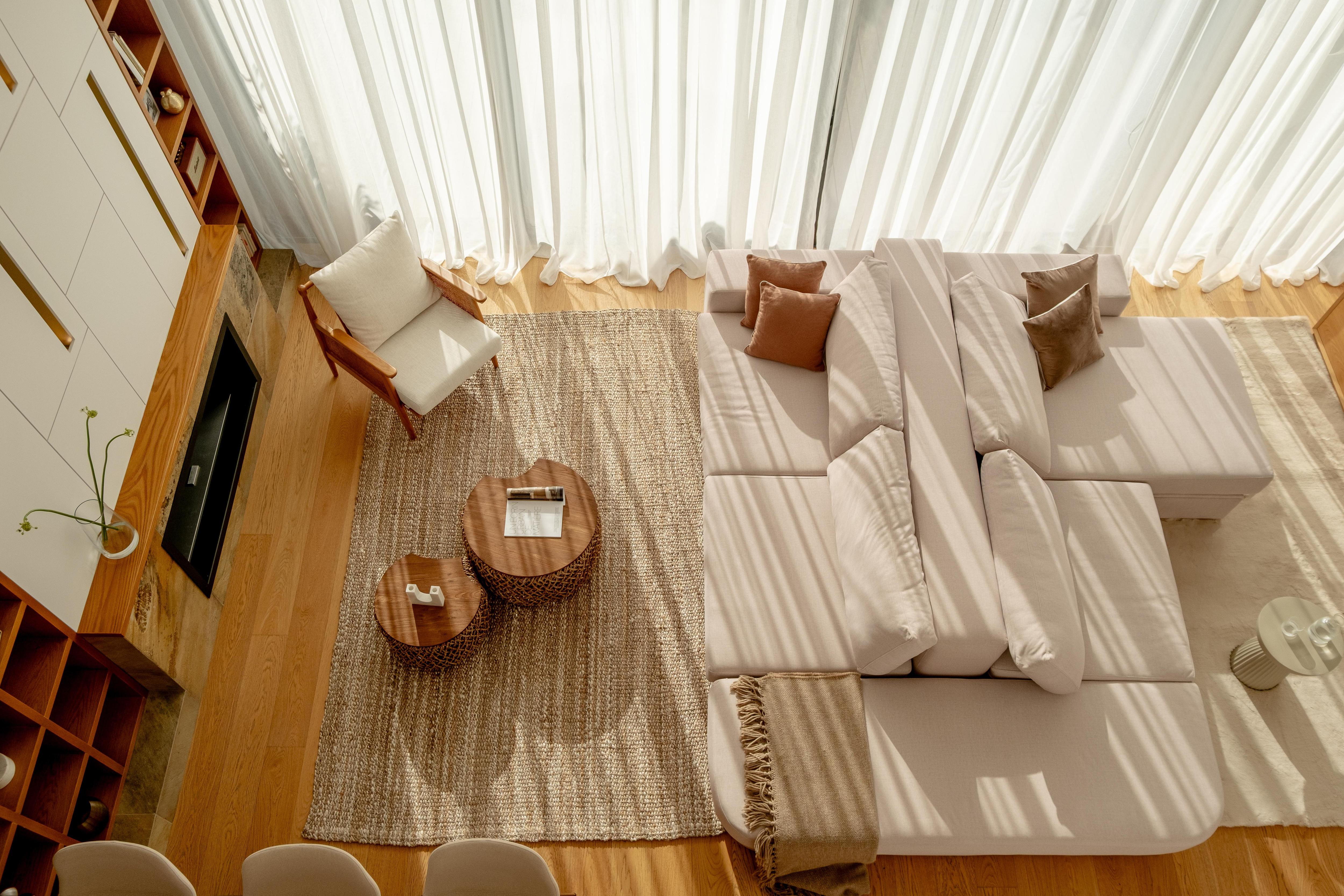 Диван выполнен на заказ по авторским эскизам. Ковры в гостиной зоне, Pergamous cosmopolitan living. Столик справа Expose Side Table, BoConcept. Столик слева Padi Coffee Table Set A, Bois Blanc Home.