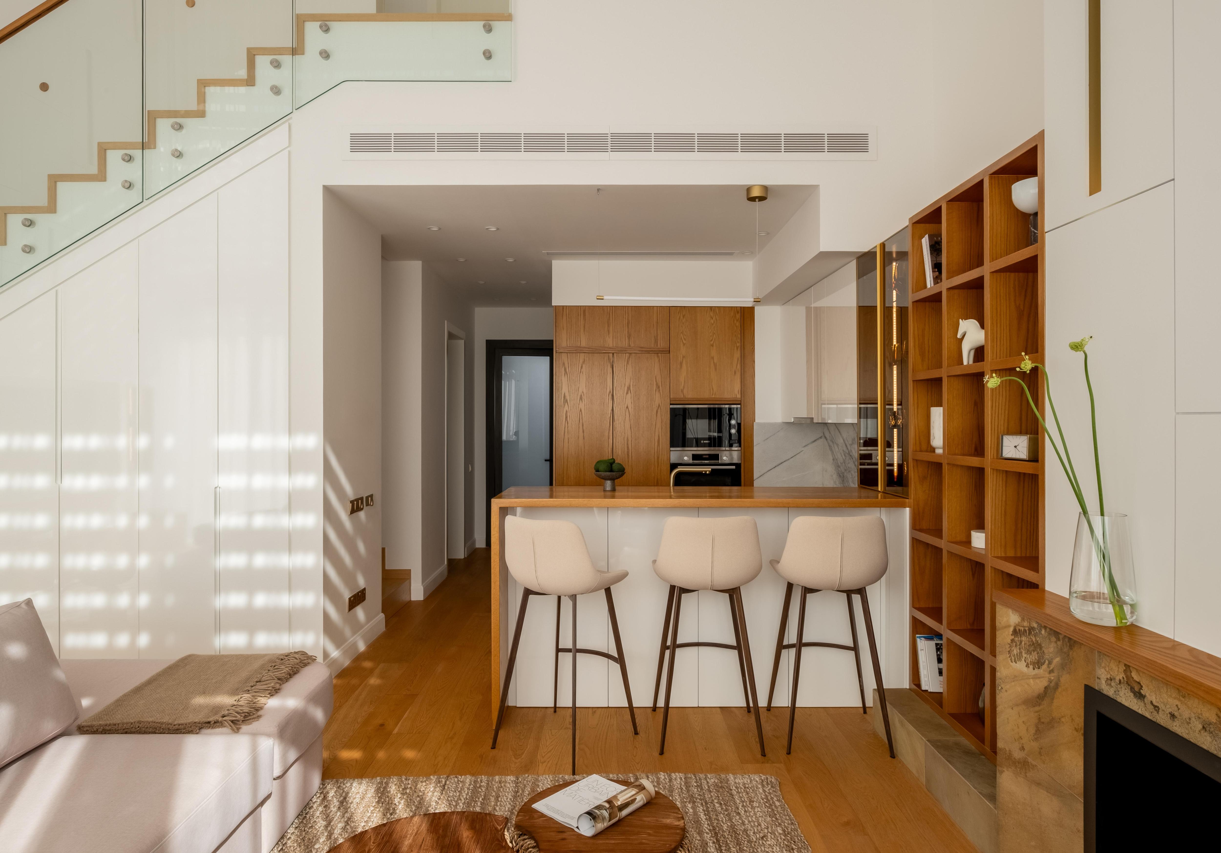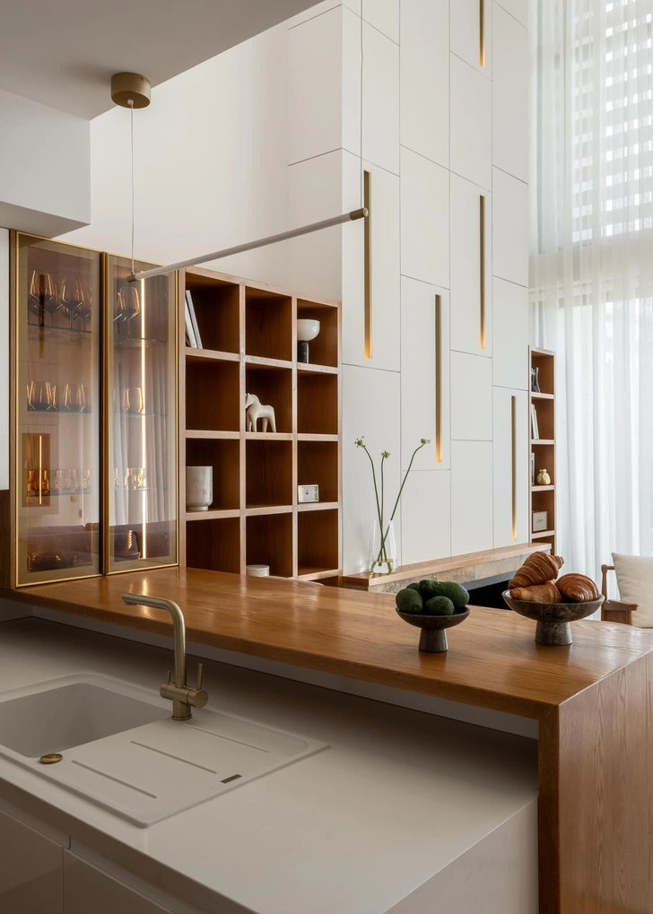 Кухня, барная стойка и витрина выполнены на заказ.