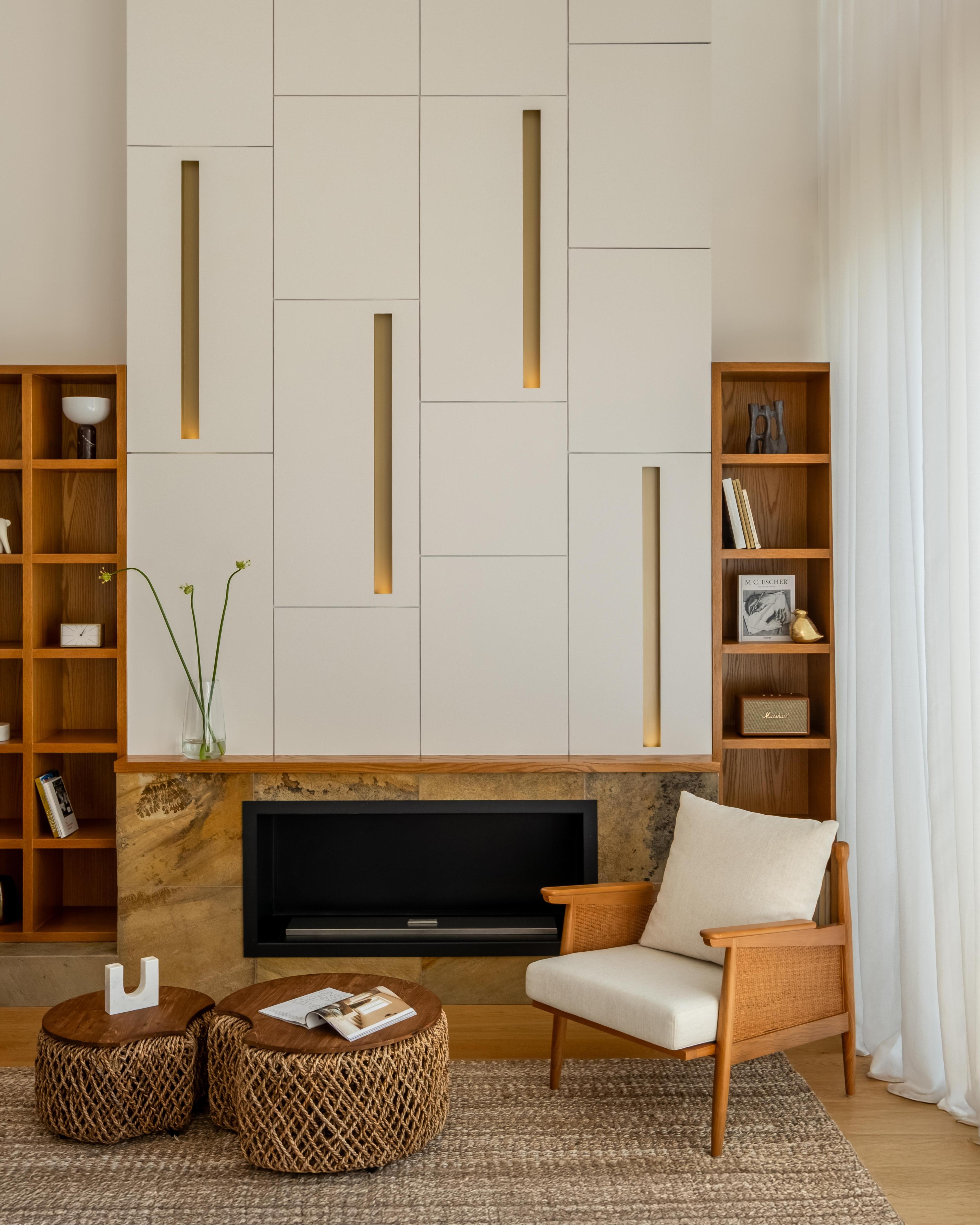 Кресло, KARE. Керамогранит в зоне камина Sandstone Fossil, ABK. Книжные стеллажи изготовлены на заказ.