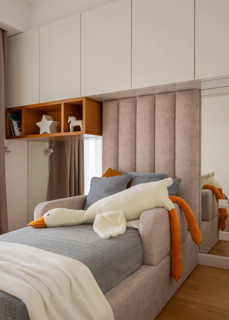 Кровать, система хранения над кроватью изготовлены на заказ.