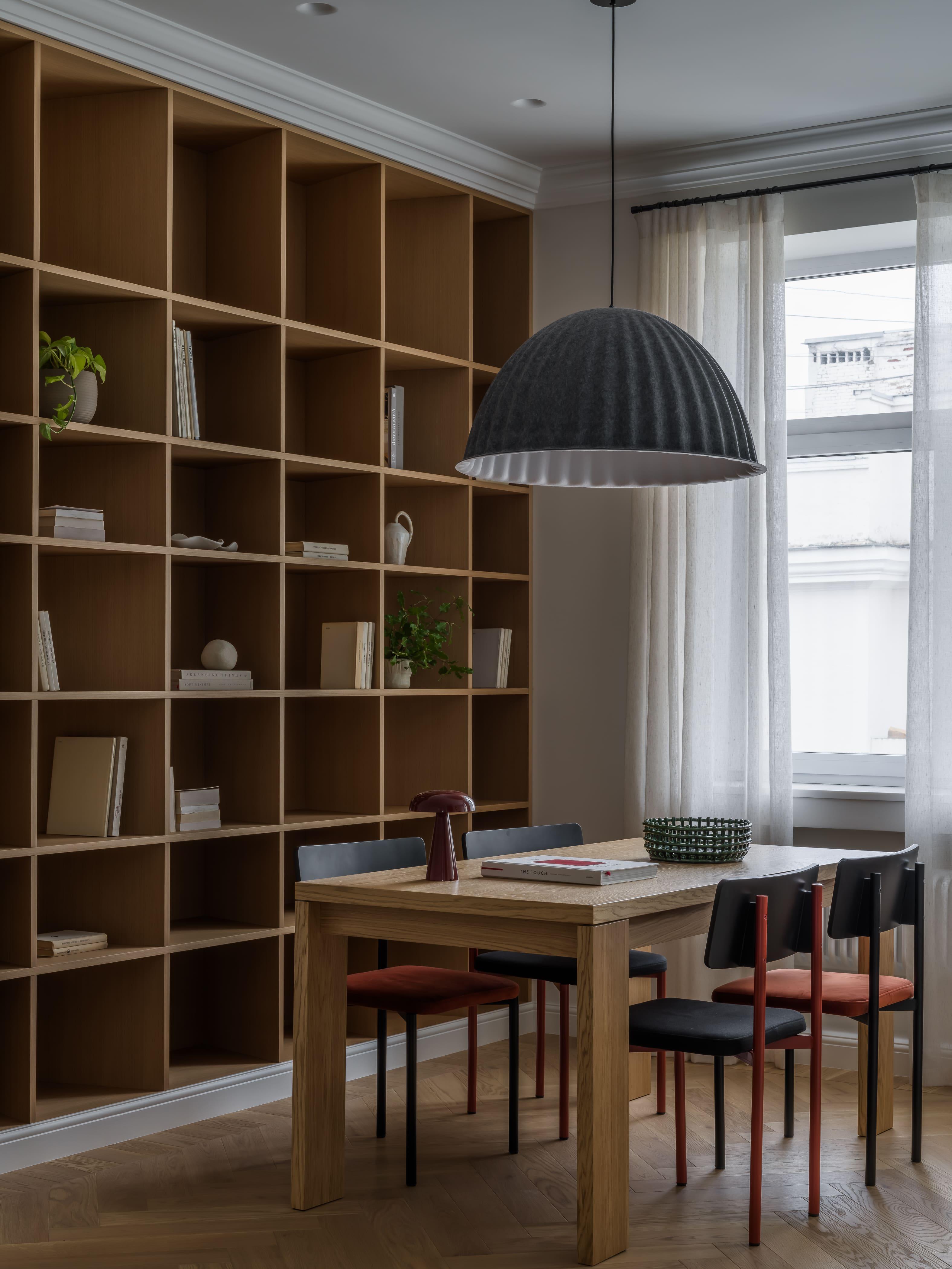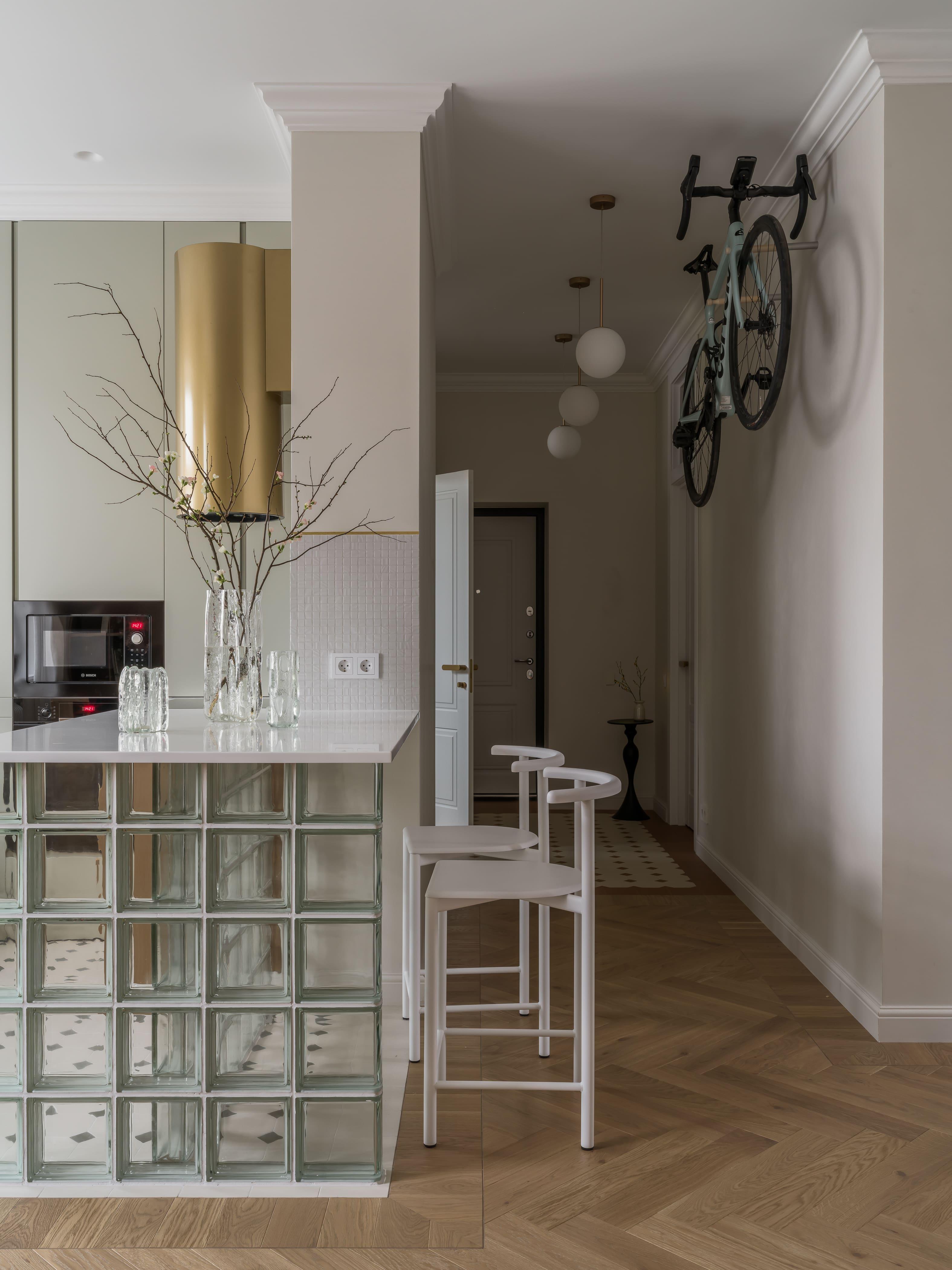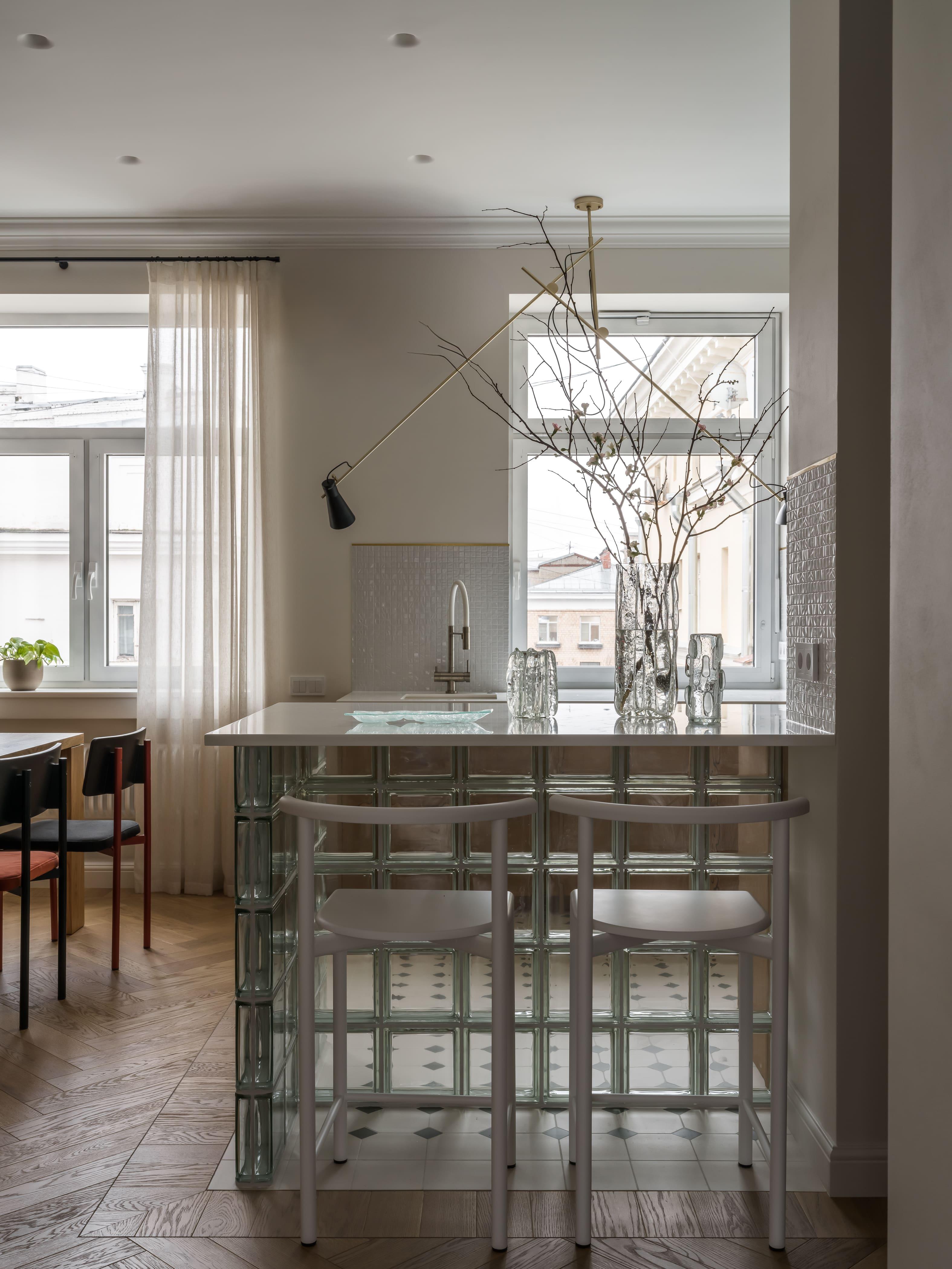 Кухня-гостиная — сердце квартиры, здесь сосредоточены самые выразительные детали. Остров из стеклоблоков — не просто рабочая зона, но и яркий архитектурный акцент. Через них просачивается свет, который делает комнату объемной и воздушной. Мы долго искали мастеров для работы с таким материалом, и результат оказался выше всех ожиданий. Каждый раз, попадая на стройку в солнечный день, мы не могли не задержаться, чтобы посмотреть за игрой света. Стоит обратить внимание и на большой стол ручной работы с подвесом Muuto на фоне ритмичного стеллажа из дуба.